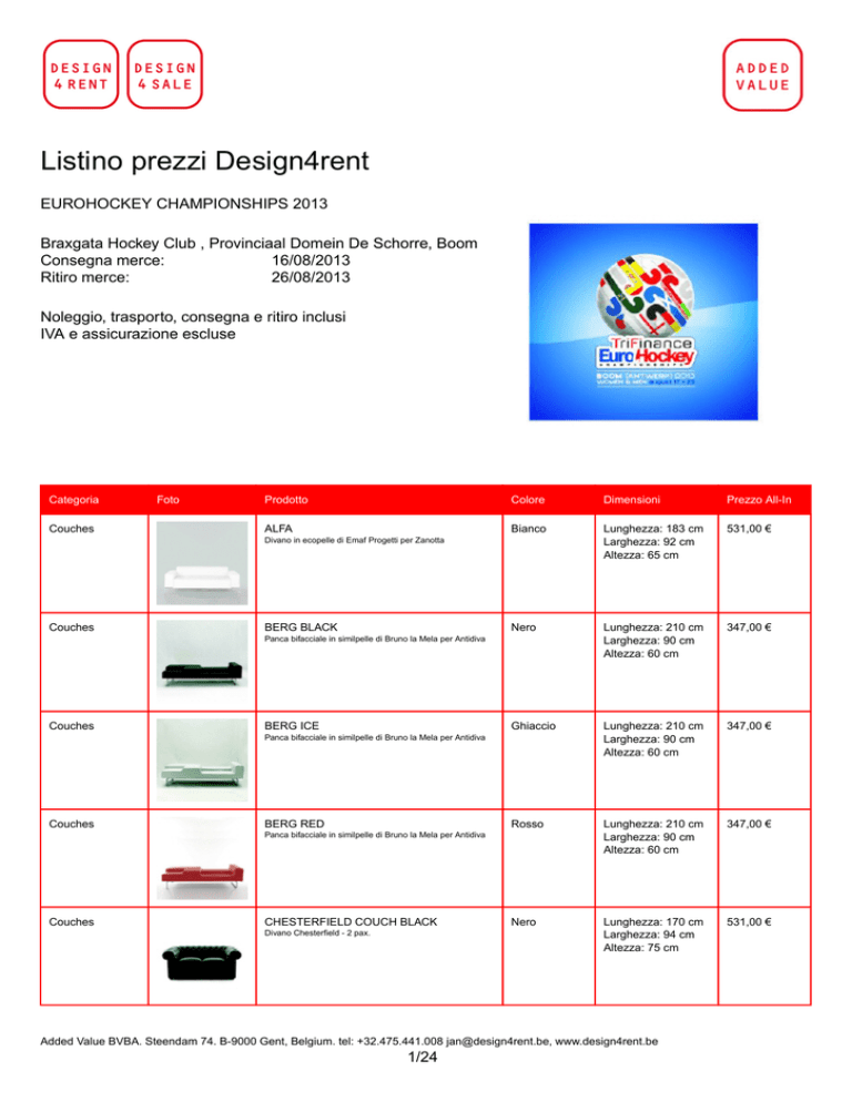 Listino prezzi Design4rent EUROHOCKEY CHAMPIONSHIPS 2013 Braxgata Hockey Club , Provinciaal Domein De Schorre, Boom Consegna merce: 16/08/2013 Ritiro merce: 26/08/2013 Noleggio, trasporto, consegna e ritiro inclusi IVA e assicurazione escluse Categoria Couches Foto Prodotto Colore Dimensioni Prezzo All-In ALFA Bianco Lunghezza: 183 cm Larghezza: 92 cm Altezza: 65 cm 531,00 € Nero Lunghezza: 210 cm Larghezza: 90 cm Altezza: 60 cm 347,00 € Ghiaccio Lunghezza: 210 cm Larghezza: 90 cm Altezza: 60 cm 347,00 € Rosso Lunghezza: 210 cm Larghezza: 90 cm Altezza: 60 cm 347,00 € Nero Lunghezza: 170 cm Larghezza: 94 cm Altezza: 75 cm 531,00 € Divano in ecopelle di Emaf Progetti per Zanotta Couches BERG BLACK Panca bifacciale in similpelle di Bruno la Mela per Antidiva Couches BERG ICE Panca bifacciale in similpelle di Bruno la Mela per Antidiva Couches BERG RED Panca bifacciale in similpelle di Bruno la Mela per Antidiva Couches CHESTERFIELD COUCH BLACK Divano Chesterfield - 2 pax. Added Value BVBA. Steendam 74. B-9000 Gent, Belgium. tel: +32.475.441.008 [email protected], www.design4rent.be 1/24 Couches CHESTERFIELD COUCH WHITE Bianco Lunghezza: 170 cm Larghezza: 94 cm Altezza: 75 cm 531,00 € Nero Lunghezza: 205 cm Larghezza: max. 116 cm Altezza: 85 cm 347,00 € Ghiaccio Lunghezza: 206 cm Larghezza: max. 116 cm Altezza: 85 cm 347,00 € Nero Lunghezza: 200 cm Larghezza: 47 cm Altezza: 46 cm 225,00 € Nero Lunghezza: 180 cm Larghezza: 115 cm Altezza: 43/65 cm 347,00 € Bianco Lunghezza: 180 cm Larghezza: 115 cm Altezza: 43/65 cm 347,00 € Nero Lunghezza: 168 cm Larghezza: 73 cm Altezza: 62 cm 531,00 € Bianco Lunghezza: 168 cm Larghezza: 73 cm Altezza: 62 cm 531,00 € Divano Chesterfield - 2 pax. Couches ELISE B Divano tondo di George Riedel per Antidiva Couches ELISE ICE Divano tondo di George Riedel per Antidiva Couches HONGKONG BLACK Panca bassa in similpelle Couches IAN COUCH BLACK Divano in similpelle Couches IAN COUCH WHITE Divano in similpelle Couches LC3 COUCH BLACK Divano di Le Corbusier per Cassina. Couches LC3 COUCH WHITE Divano di Le Corbusier per Cassina. Added Value BVBA. Steendam 74. B-9000 Gent, Belgium. tel: +32.475.441.008 [email protected], www.design4rent.be 2/24 Couches LUNA B Nero Lunghezza: 240 cm Larghezza: 42 cm Altezza: 40 cm 266,00 € Ghiaccio Lunghezza: 240 cm Larghezza: 42 cm Altezza: 40 cm 266,00 € Nero Lunghezza: 120 cm Larghezza: 46 cm Altezza: 45 cm 184,00 € Ghiaccio Lunghezza: 120 cm Larghezza: 46 cm Altezza: 45 cm 184,00 € Nero Lunghezza: 180 cm Larghezza: 80 cm Altezza: 74 cm 347,00 € Ghiaccio Lunghezza: 180 cm Larghezza: 80 cm Altezza: 74 cm 347,00 € Ghiaccio Lunghezza: 90 cm Larghezza: 90 cm Altezza: 34/63 cm 184,00 € Ghiaccio Lunghezza: 90 cm Larghezza: 90 cm Altezza: 34/63 cm 184,00 € Panca in ecopelle Couches LUNA ICE Panca in ecopelle Couches MACAU B Panca bassa in similpelle Couches MACAU ICE Panca bassa in similpelle Couches MR. NILSSON BLACK Divano in similpelle Couches MR. NILSSON ICE Divano in similpelle Couches PLASTICS CENTRAL ICE Poltrona di Piero Lissoni per Kartell Couches PLASTICS LEFT ICE Poltrona di Piero Lissoni per Kartell Added Value BVBA. Steendam 74. B-9000 Gent, Belgium. tel: +32.475.441.008 [email protected], www.design4rent.be 3/24 Couches PLASTICS RIGHT ICE Ghiaccio Lunghezza: 90 cm Larghezza: 90 cm Altezza: 34/63 cm 184,00 € Bianco Lunghezza: 113 cm Larghezza: 92 cm Altezza: 65 cm 449,00 € Nero Lunghezza: 75 cm Larghezza: 83 cm Altezza: 83 cm 449,00 € Bianco Lunghezza: 75 cm Larghezza: 83 cm Altezza: 83 cm 449,00 € Nero Lunghezza: 104 cm Larghezza: 84 cm Altezza: 84 cm 266,00 € Trasparente Lunghezza: 109 Larghezza: 109 Altezza: 83 327,00 € Nero Lunghezza: 97 cm Larghezza: 97 cm Altezza: 43 cm/65 cm 184,00 € Bianco Lunghezza: 97 cm Larghezza: 97 cm Altezza: 43 cm/65 cm 184,00 € Poltrona di Piero Lissoni per Kartell Armchairs ALFA ARMCHAIR Poltrona in ecopelle di Emaf Progetti per Zanotta Armchairs BARCELONA CHAIR BLACK Poltrona di Mies Van der Rohe per Knoll Armchairs BARCELONA CHAIR WHITE Poltrona di Mies Van der Rohe per Knoll Armchairs COCONUT CHAIR Poltrona in pelle e acciaio di George Nelson per Vitra Armchairs HANGING BUBBLE CHAIR Bubble chair da appendere Armchairs IAN ARMCHAIR BLACK Poltrona in similpelle Armchairs IAN ARMCHAIR WHITE Poltrona in similpelle Added Value BVBA. Steendam 74. B-9000 Gent, Belgium. tel: +32.475.441.008 [email protected], www.design4rent.be 4/24 Armchairs LC3 ARMCHAIR BLACK Nero Lunghezza: 99 cm Larghezza: 73 cm Altezza: 62 cm 449,00 € Bianco Lunghezza: 99 cm Larghezza: 73 cm Altezza: 62 cm 449,00 € Bianco Lunghezza: 120 cm Larghezza: 103 cm Altezza: 88 cm 327,00 € Marrone chiaro Lunghezza: 70 cm Larghezza: 70 cm Altezza: 60 cm 184,00 € Marrone chiaro Lunghezza: 130 cm Larghezza: 130 cm Altezza: 105 cm 184,00 € Poltrona in bamboo TIVI B Nero Lunghezza: 65 cm Larghezza: 65 cm Altezza: 70 cm 184,00 € Ghiaccio Lunghezza: 65 cm Larghezza: 65 cm Altezza: 70 cm 184,00 € Nero Lunghezza: 100 cm Larghezza: 100 cm Altezza: 48 cm 184,00 € Poltrona di Le Corbusier per Cassina Armchairs LC3 ARMCHAIR WHITE Poltrona di Le Corbusier per Cassina Armchairs STANDING BUBBLE CHAIR Poltrona design Armchairs STONE ON FIRE Poltrona in bamboo Armchairs Armchairs THREESOME NOODLE Poltrona Armchairs TIVI ICE Poltrona Poufs BOLZANO B Pouf quadrato in similpelle. (Design Csilla Gabor) Added Value BVBA. Steendam 74. B-9000 Gent, Belgium. tel: +32.475.441.008 [email protected], www.design4rent.be 5/24 Poufs BOLZANO ICE Ghiaccio Lunghezza: 100 cm Larghezza: 100 cm Altezza: 48 cm 184,00 € Rosso Lunghezza: 100 cm Larghezza: 100 cm Altezza: 48 cm 184,00 € Bianco Lunghezza: 130 cm Larghezza: 50 cm Altezza: 43 cm 184,00 € Bianco Lunghezza: 43 cm Larghezza: 43 cm Altezza: 43 cm 45,00 € Ghiaccio Lunghezza: 70 cm Larghezza: 70 cm Altezza: 38 cm 143,00 € Bianco Lunghezza: 145 cm Larghezza: 145 cm Altezza: 48 cm 225,00 € Ghiaccio Lunghezza: 60 cm Larghezza: 60 cm Altez