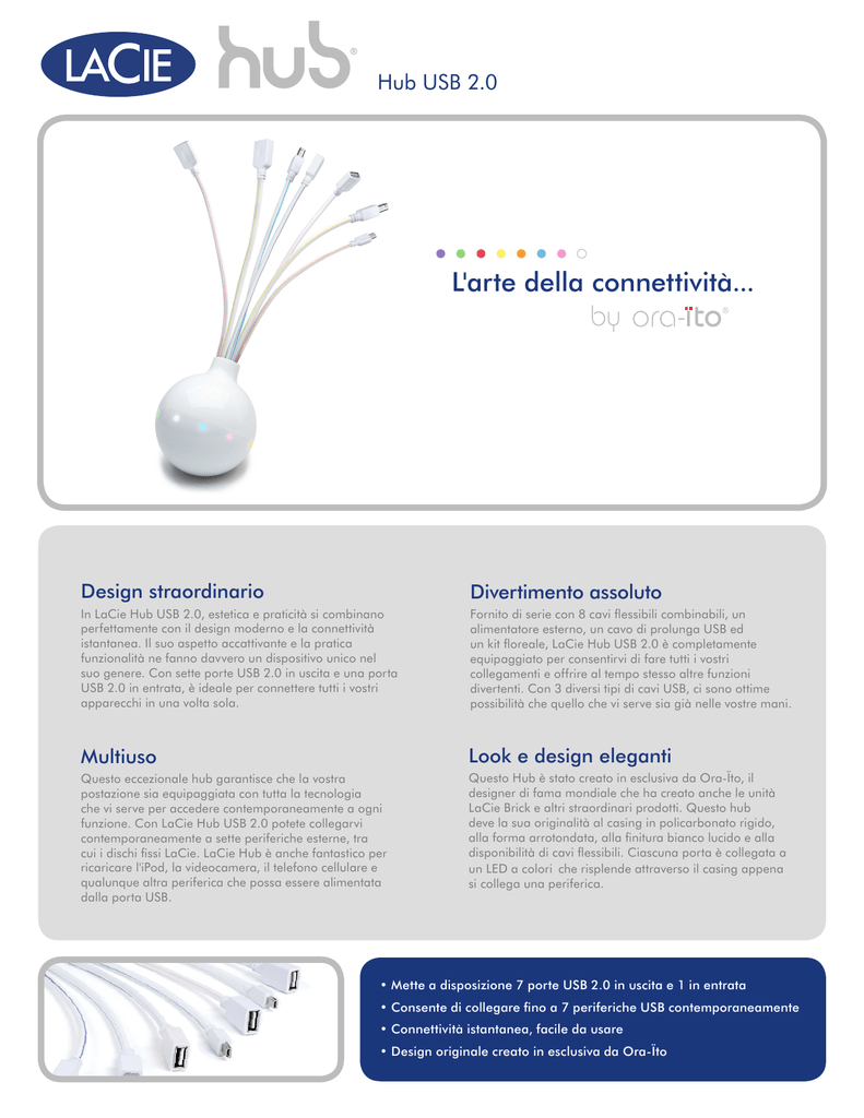 Hub USB 2.0 L'arte connettività... The art della of connectivity... Design straordinario Divertimento assoluto In LaCie Hub USB 2.0, estetica e praticità si combinano perfettamente con il design moderno e la connettività istantanea. Il suo aspetto accattivante e la pratica funzionalità ne fanno davvero un dispositivo unico nel suo genere. Con sette porte USB 2.0 in uscita e una porta USB 2.0 in entrata, è ideale per connettere tutti i vostri apparecchi in una volta sola. Fornito di serie con 8 cavi flessibili combinabili, un alimentatore esterno, un cavo di prolunga USB ed un kit floreale, LaCie Hub USB 2.0 è completamente equipaggiato per consentirvi di fare tutti i vostri collegamenti e offrire al tempo stesso altre funzioni divertenti. Con 3 diversi tipi di cavi USB, ci sono ottime possibilità che quello che vi serve sia già nelle vostre mani. Multiuso Look e design eleganti Questo eccezionale hub garantisce che la vostra postazione sia equipaggiata con tutta la tecnologia che vi serve per accedere contemporaneamente a ogni funzione. Con LaCie Hub USB 2.0 potete collegarvi contemporaneamente a sette periferiche esterne, tra cui i dischi fissi LaCie. LaCie Hub è anche fantastico per ricaricare l'iPod, la videocamera, il telefono cellulare e qualunque altra periferica che possa essere alimentata dalla porta USB. Questo Hub è stato creato in esclusiva da Ora-Ïto, il designer di fama mondiale che ha creato anche le unità LaCie Brick e altri straordinari prodotti. Questo hub deve la sua originalità al casing in policarbonato rigido, alla forma arrotondata, alla finitura bianco lucido e alla disponibilità di cavi flessibili. Ciascuna porta è collegata a un LED a colori che risplende attraverso il casing appena si collega una periferica. • Mette a disposizione 7 porte USB 2.0 in uscita e 1 in entrata • Consente di collegare fino a 7 periferiche USB contemporaneamente • Connettività istantanea, facile da usare • Design originale creato in esclusiva da Ora-Ïto Caratteristiche • 8 cavi flessibili • 8 LED con colori diversi • Plug & play • Collegabile "a caldo": Contenuto della confezione • Hub USB 2.0 LaCie • 2 cavi USB 2.0 (maschio di tipo B/maschio di tipo A) • 2 cavi USB 2.0 (maschio di tipo A/maschio di tipo mini B) • 4 cavi USB 2.0 (maschio di tipo A/femmina di tipo A) • Cavo di prolunga USB • Alimentatore esterno • Kit floreale • Guida d'installazione rapida Requisiti di sistema WHITE PINK VIOLET BLUE • Windows 98SE, Windows Me, Windows 2000, Windows XP, Windows Vista™/ Mac® OS 9, Mac OS X / Linux • Connettore USB 2.0 libero GREEN ® ORANGE RED YELLOW Hub USB 2.0 LaCie Codice prodotto Interfaccia Velocità di trasferimento dell'interfaccia Dimensioni (diametro x altezza) Peso Garanzia 711854 7 porte USB 2.0 (tipo A) in uscita e 1 porta USB 2.0 (tipo B) in entrata Fino a 480 Mbit/s 110 x 130 mm (senza cavi) 900 g 1 anno *I connettori host USB devono essere collegati al computer, altrimenti le porte USB sull'hub non funzionano correttamente. ©2007, LaCie. Il logo LaCie è un marchio di fabbrica di LaCie. Gli altri prodotti e nomi di marchi citati in questo documento possono essere marchi o marchi registrati di proprietà dei rispettivi produttori. Le specifiche e le caratteristiche esteriori sono indicative e possono variare in qualunque momento senza preavviso. www.lacie.com 071009