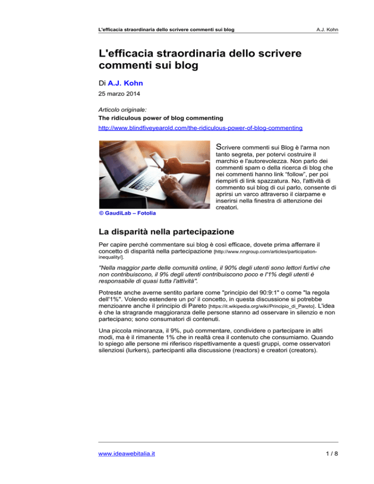 L'efficacia straordinaria dello scrivere commenti sui blog A.J. Kohn L'efficacia straordinaria dello scrivere commenti sui blog Di A.J. Kohn 25 marzo 2014 Articolo originale: The ridiculous power of blog commenting http://www.blindfiveyearold.com/the-ridiculous-power-of-blog-commenting Scrivere commenti sui Blog è l'arma non © GaudiLab – Fotolia tanto segreta, per potervi costruire il marchio e l'autorevolezza. Non parlo dei commenti spam o della ricerca di blog che nei commenti hanno link “follow”, per poi riempirli di link spazzatura. No, l'attività di commento sui blog di cui parlo, consente di aprirsi un varco attraverso il ciarpame e inserirsi nella finestra di attenzione dei creatori. La disparità nella partecipazione Per capire perché commentare sui blog è così efficace, dovete prima afferrare il concetto di disparità nella partecipazione [http://www.nngroup.com/articles/participationinequality/]. "Nella maggior parte delle comunità online, il 90% degli utenti sono lettori furtivi che non contribuiscono, il 9% degli utenti contribuiscono poco e l'1% degli utenti è responsabile di quasi tutta l'attività". Potreste anche averne sentito parlare come "principio del 90:9:1" o come "la regola dell'1%". Volendo estendere un po' il concetto, in questa discussione si potrebbe menzioanre anche il principio di Pareto [https://it.wikipedia.org/wiki/Principio_di_Pareto] . L'idea è che la stragrande maggioranza delle persone stanno ad osservare in silenzio e non partecipano; sono consumatori di contenuti. Una piccola minoranza, il 9%, può commentare, condividere o partecipare in altri modi, ma è il rimanente 1% che in realtà crea il contenuto che consumiamo. Quando lo spiego alle persone mi riferisco rispettivamente a questi gruppi, come osservatori silenziosi (lurkers), partecipanti alla discussione (reactors) e creatori (creators). www.ideawebitalia.it 1/8 L'efficacia straordinaria dello scrivere commenti sui blog A.J. Kohn Piramide della disparità nella partecipazione Ciò che sorprende (almeno me) è che molte persone non hanno ancora afferrato questo concetto. Rimangono scioccati e sconvolti dal fatto che più del 90% delle recensioni di Yelp provengano dall'1% degli utenti [http://officialblog.yelp.com/2011/06/yelpand-the-1990-rule.html]. Usano questo basso livello di attività (misurato come numero di contributi) sui servizi come Twitter e Google+, per sostenere che non sono vitali. Fonte: Twopcharts Attività Twitter per Anno Ora, che tipo di persona pensate che sia più probabile si iscrivesse e usasse Twitter nel 2008? osservatore silenzioso, semplice partecipante alla conversazione, o creatore? Conferitevi una stella d'oro se avete risposto creatore. Ed è per questo che la percentuale di quelli che Tweettavano in quegli anni iniziali era più alto. Come il servizio è diventato più maturo e diffuso, hanno aderito al servizio un numero maggiore di osservatori silenziosi. E questo va bene! Cercare di correggere la disparità nella partecipazione è una battaglia contro la natura umana persa in partenza. La maggior parte delle persone semplicemente non creeranno contenuti per una vasta gamma di motivi. Certo, la tecnologia può www.ideawebitalia.it 2/8 L'efficacia straordinaria dello scrivere commenti sui blog A.J. Kohn smuovere le percentuali di qualche punto, ma non avverranno cambiamenti sostanziali a questa dinamica. I Creatori Se i creatori sono responsabili di quasi tutti i contenuti che consumiamo, allora questo li rende ... piuttosto potenti. Oserei dire che potremmo chiamarli influenzatori. Ora, questo termine non mi piace particolarmente, però in questa definizione c'è del vero. La cosa triste è che la maggior parte dei contenuti che trattano di come "entrare in contatto con gli influencer", ho visto che parlano di come identificare (zzzzzz) mandargli una e-mail, o suggeriscono modi per interagire con loro su Twitter. Suppongo che qualche volta possano funzionare, ma penso le probabilità di garantirsi la loro attenzione in questi modi sia limitata e inefficiente. La gente continua a perseguire questi metodi di ricerca di contatto, per l'enorme vantaggio che deriva dal guadagnare l'attenzione di un creatore. I creatori spesso hanno un grande pubblico, per cui una menzione, o un link nel contenuto che creano, può fornire una grande spinta al vostro brand e alla vostra autorevolezza. Se non avete ancora messo insieme i pezzi da soli, i creatori alimentano il grafo dei link. L'attenzione www.ideawebitalia.it 3/8 L'efficacia straordinaria dello scrivere commenti sui blog A.J. Kohn L'attenzione scarseggia e il vostro compito è di aggiudicarvela [http://www.blindfiveyearold.com/are-you-winning-the-attention-auction] ogni volta che potete ed è ancora più importante che vi guadagnate l'attenzione dei creatori. Purtroppo i creatori potrebbero essere proprio quelli che hanno la minore quantità di attenzione da dare. Perché? Perché sono impegnati a creare contenuti! Scherzi a parte, ci vuole tempo (un sacco), se lo fate nel modo giusto. Non solo, ma se sono dei creatori di successo, la domanda del loro tempo aumenta. Ricevono più email, più richieste, più clienti [http://www.blindfiveyearold.com/what-i-learned-in2013]. Allora, come si fa a ottenere l'attenzione di un creatore? E' buffo, ma in realtà c'è un modo molto semplice per catturare l'attenzione di un creatore. Già, basta scrivere commenti sul suo blog. Sapete che i creatori presteranno attenzione ai commenti sul loro contenuto. Hanno lavorato sodo per produrlo e cercano di capire come viene accolto. Non commettete errori, i creatori amano i feedback e le conferme. I creatori si incontrano nella sezione dei commenti. Approfittate quindi dell'attenzione innata che i creatori pongono sui commenti. Commentare sui blog Il problema di commentare sui blog è che la maggior parte delle persone lo fanno in modo penoso. Non voglio nemmeno parlare della cloaca di commenti che spesso seppelliscono i vi