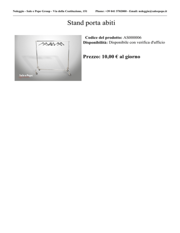 Noleggio - Sale e Pepe Group - Via della Costituzione, 151 Phone: +39 041 5702000 - Email: [email protected] Stand porta abiti Codice del prodotto: AS000006 Disponibilità: Disponibile con verifica d'ufficio Prezzo: 10,00 € al giorno Powered by TCPDF (www.tcpdf.org)