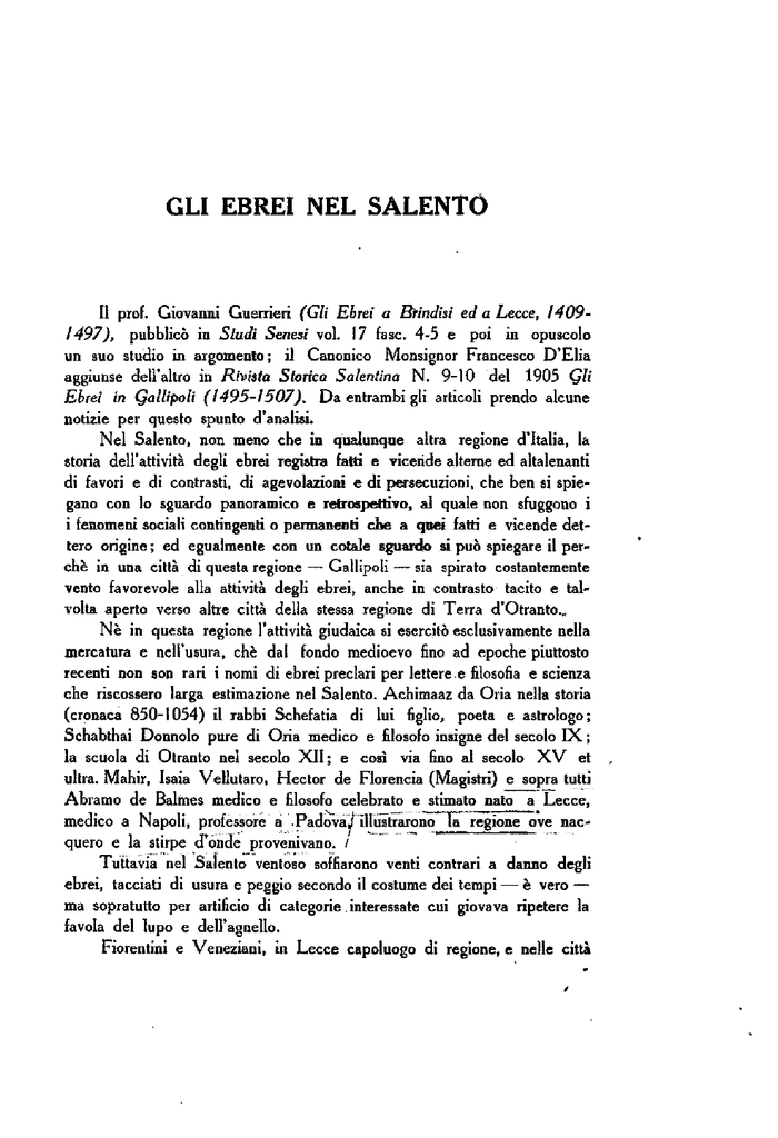GLI EBREI NEL SALENTO Il prof. Giovanni Guerrieri (Gli Ebrei a Brindisi ed a Lecce, 14091497), pubblicò in Studi Senesi vol. 17 fasc. 4-5 e poi in opuscolo un suo studio in argomento; il Canonico Monsignor Francesco D'Elia aggiunse dell'altro in Rivista Storica Salentina N. 9-10 del 1905 Gli Ebrei in Gallipoli (1495-1507). Da entrambi gli articoli prendo alcune notizie per questo spunto d'analisi. Nel Salento, non meno che in qualunque altra regione d'Italia, la storia dell'attività degli ebrei registra fatti e vicende alterne ed altalenanti di favori e di contrasti, di agevolazioni e di persecuzioni, che ben si spiegano con lo sguardo panoramico e retrospettivo, al quale non sfuggono i i fenomeni sociali contingenti o permanenti che a quei fatti e vicende dettero origine; ed egualmente con un cotale sguardo si può spiegare il perchè in una città di questa regione — Gallipoli — sia spirato costantemente vento favorevole alla attività degli ebrei, anche in contrasto tacito e talvolta aperto verso altre città della stessa regione di Terra d'Otranto.. Nè in questa regione l'attività giudaica si esercitò esclusivamente nella mercatura e nell'usura, chè dal fondo medioevo fino ad epoche piuttosto recenti non son rari i nomi di ebrei preclari per lettere .e filosofia e scienza che riscossero larga estimazione nel Salento. Achimaaz da Oria nella storia (cronaca 850-1054) il rabbi Schefatia di lui figlio, poeta e astrologo; Schabthai Donnolo pure di Oria medico e filosofo insigne del secolo IX ; la scuola di Otranto nel secolo XII ; e così via fino al secolo XV et ultra. Mahir, Isaia Vellutaro, Hector de Florencia (Magistri) e sopra tutti Abramo de Balmes medico e filosofo celebrato e stimato nato a Lecce, medico a Napoli, professore a .PadOial illustraronóra—regione ove nacquero e la stirpe d'Onde provenivano. / `I nttavia nel Salento ventoso soffiarono venti contrari a danno degli ebrei, tacciati di usura e peggio secondo il costume dei tempi — è vero — ma sopratutto per artificio di categorie interessate cui giovava ripetere la favola del lupo e dell'agnello. Fiorentini e Veneziani, in Lecce capoluogo di regione, e nelle città 18 Rinascenza Salentina marittime propizie ai traffici, tenevano banchi e mercatura floridamente, e vendevano a sfacciata usura panni, ferri, lignami, pepe et altre mercantie (Libro Rosso di Lecce, pag. 1173 anno 1471) per multo majore prezo che volevano, e i cittadini perdevano da lo comparare a lo vendere talvolta lo terzo et talvolta lo quarto et meno secundo che se potevano accordare, et talvolta lo mercante in la sua medesima apotega comprao quelle robbe che ipso stesso haveva venduto in quello al medesimo per el mancho prezo o vero le faceva comparare d'altri con el quale el mercante era partecipe et haveva intelligencia, et cussì el mercante veneva ad dare dui botte al povero homo, uno al vendere chi lo contava le robhe più che valevano et l'altra al comparare che facevano per minor prezo, et lo povero homo per poter retrahere el denaro li bisognava tacere. Dove si racconta che i cittadini, ricorrendo per prestiti a mercanti Veneziani e Fiorentini, firmavano la dichiarazione di debito per la somma chiesta in prestito, ricevevano merce invece di denaro a calcolo di fame, poi per convertirla nel denaro di cui abbisognavano eran costretti a rivenderla in quello dì medesimo alla stessa bottega a prezzo vile e li bisognava tacere senza dolersi delle dui botte. A cotali mercanti tornava comodo far ciò senza la concorrenza dei banchi ebrei, e soffiavano nel fuoco nell'odio religioso secondo che consentivan le correnti delle stratosfere politiche, come ed esempio all'epoca degli Aragonesi i quali favorivan gli ebrei e seppero le vendette della Serenissima inferte in punti sensibili del Reame come Brindisi e Otranto e sopratutto nella olocausta Gallipoli (1484). Le comunità ebraiche nel Salento furono antiche e numerose. Al dire di Achimaaz da Oria rimontano all'epoca di Tito dopo la distruzione di Gerusalemme, e fiorii ono a Taranto, ad Oria, ad Ostuni, ad Otranto, a Nardò, a Lecce, a Brindisi, a Gallipoli fino al secolo XVI. La produttività della regione. e il suo pingue traffico costiero coi popoli levantini che fu grandioso specialmente nel porto di Gallipoli, resero propizio l'acclimatarsi delle colonie giudaiche nel Salento: non potendo possedere proprietà terriere per il pregiudizio giuridico di quei tempi, investivano i loro capitali nel credito e nella mercatura, mentre gli ebrei poveri vivevano alla periferia della colonia giudaica con i mestieri specializzati (caratteristico quello della tintoria col campeggio, nero — con l'urlaci, indaco — con la chiurazza, giallastro — con lo zuppino, rosso bruno — con la cocciniglia, rosso vivo — con il croco, giallo — con la vetusta porpora Vernole - Gli Ebrei nel Salento ià della conchiglia murex, paonazzo, ecc.) oppure col piccolo commercio di robe usate o di stracci e sopratutto di mercerie e fettucce (zagarelle). Le popolazioni salentine, seguendo l'intolleranza millenaria, non guardavan con simpatia questa gente che adunchi aveva il naso e le mani, ma per necessità dell'agricoltura e del commercio ad essa ricorrevan volentieri e sorridenti per prestiti. E per tale funzione economica e sociale eran tollerati e talvolta carezzati gli ebrei, e per far salvo lo scrupolo religioso li si induceva a farsi cetadini o a farsi christiani : al quale espediente costoro accedevano contro voglia e in apparenza, pur di godere le franchigie largite ai naturali del luogo. La qualcosa non fu una specialità generosa di Gallipoli, come scrisse il Canonico Francesco D'Elia nell'articolo citato in epigrafe — invece fu comune in tutta la regione perchè in ogni luogo di essa si utilizzavan le attività dei tollerati. In Nardò (notisi per quanto dirò) fu prescritto che le 50 case delli giudei contribuiscano come l'altri cetadini (Arch. Prov. di Lecce, Università di Nardò, 1469 e Diplomi de