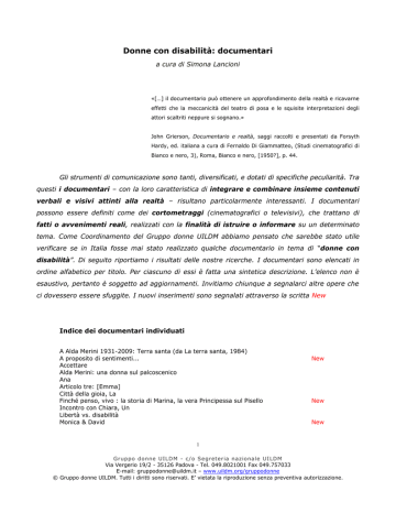 Donne con disabilità: documentari a cura di Simona Lancioni «[…] il documentario può ottenere un approfondimento della realtà e ricavarne effetti che la meccanicità del teatro di posa e le squisite interpretazioni degli attori scaltriti neppure si sognano.» John Grierson, Documentario e realtà, saggi raccolti e presentati da Forsyth Hardy, ed. italiana a cura di Fernaldo Di Giammatteo, (Studi cinematografici di Bianco e nero, 3), Roma, Bianco e nero, [1950?], p. 44. Gli strumenti di comunicazione sono tanti, diversificati, e dotati di specifiche peculiarità. Tra questi i documentari – con la loro caratteristica di integrare e combinare insieme contenuti verbali e visivi attinti alla realtà – risultano particolarmente interessanti. I documentari possono essere definiti come dei cortometraggi (cinematografici o televisivi), che trattano di fatti o avvenimenti reali, realizzati con la finalità di istruire o informare su un determinato tema. Come Coordinamento del Gruppo donne UILDM abbiamo pensato che sarebbe stato utile verificare se in Italia fosse mai stato realizzato qualche documentario in tema di “donne con disabilità”. Di seguito riportiamo i risultati delle nostre ricerche. I documentari sono elencati in ordine alfabetico per titolo. Per ciascuno di essi è fatta una sintetica descrizione. L’elenco non è esaustivo, pertanto è soggetto ad aggiornamenti. Invitiamo chiunque a segnalarci altre opere che ci dovessero essere sfuggite. I nuovi inserimenti sono segnalati attraverso la scritta New Indice dei documentari individuati A Alda Merini 1931-2009: Terra santa (da La terra santa, 1984) A proposito di sentimenti... Accettare Alda Merini: una donna sul palcoscenico Ana Articolo tre: [Emma] Città della gioia, La Finché penso, vivo : la storia di Marina, la vera Principessa sul Pisello Incontro con Chiara, Un Libertà vs. disabilità Monica & David New New New 1 Gruppo donne UI LDM - c/o Segreteria nazionale UILDM Via Vergerio 19/2 - 35126 Padova - Tel. 049.8021001 Fax 049.757033 E-mail: [email protected] – www.uildm.org/gruppodonne © Gruppo donne UILDM. Tutti i diritti sono riservati. E’ vietata la riproduzione senza preventiva autorizzazione. Non sto parlando di nessun’altra: frammenti di vita di donne handicappate e non Rosanna: i libri del cuore Senza copione: Laura, Agnese e Gessica si raccontano Vera storia della principessa sul pisello, La A Alda Merini 1931-2009: Terra santa (da La terra santa, 1984) Editore: GLG factory Altre responsabilità: Merini, Alda (protagonista). Anno: 2009 Descrizione: documentario nel quale Alda Merini (1931-2009), famosa poetessa e scrittrice, recita la poesia "Terra santa" (da "La terra santa", 1984). La poetessa parla anche della sua esperienza in manicomio: gli elettroshock, la sterilizzazione forzata, la violenza nei confronti delle degenti. La voce di Alda Merini è tratta dall'archivio RAI e da "La dismisura dell'anima" (pubblicato da Crocetti editore). Nel filmato sono anche riproposte alcune fotografie sui manicomi tratte della mostra "Il volto della follia. Cent'anni di immagini del dolore" (Reggio Emilia, 2006). Reperibilità e notizie correlate: il documentario è pubblicato alla seguente pagina: http://www.youtube.com/watch?v=a9hsNKTX820 A proposito di sentimenti... New Rregista: Segre, Daniele Interpreti: 15 ragazzi e ragazze con Sindrome di Down Paese di produzione: Italia Anno: 1999 Descrizione: documentario della durata di 35 minuti, prodotto da RAI, Associazione Italiana Persone Down, Fondazione Italiana Verso il Futuro, I Cammelli s.n.c. Coppie di ragazzi con Sindrome di Down, immaginano il proprio futuro insieme, parlando del rapporto che li lega, della possibilità di sposarsi, della difficoltà di trovare casa, del lavoro. Reperibilità e notizie correlate: per informazioni e il reperimento del film rivolgersi a Associazione Italiana Persone Down - Viale delle Milizie, 106 - 00192 Roma – tel. 06.3723909. Accettare Regista: Ferrandini, Pierluigi Altre responsabilità: Cominetti, Claudia (protagonista, autrice dei testi). Anno: 2009 2 Gruppo donne UI LDM - c/o Segreteria nazionale UILDM Via Vergerio 19/2 - 35126 Padova - Tel. 049.8021001 Fax 049.757033 E-mail: [email protected] – www.uildm.org/gruppodonne © Gruppo donne UILDM. Tutti i diritti sono riservati. E’ vietata la riproduzione senza preventiva autorizzazione. Descrizione: cortometraggio realizzato nell’ambito Theleton Italia. In esso Claudia Cominetti racconta com’è cambiata la sua vita da quando, a ventun’anni, si è manifestata la sclerosi laterale amitrofica (SLA). Reperibilità e notizie correlate: il documentario è pubblicato alla seguente pagina: http://www.youtube.com/watch?v=ZjfaeoQ6Cfw Alda Merini: una donna sul palcoscenico Regista: Damato, Cosimo Damiano Altre responsabilità: Merini, Alda (protagonista), Melato, Mariangela (voce narrante), Arcieri, Davide (montaggio). Tumminelli, Angelo (produttore). Anno: 2009 Descrizione: film-documentario, girato nella casa di Alda Merini, nel quale la poetessa si abbandona al racconto di sé mettendo a nudo la propria anima. Sono toccati i temi del dono della poesia, del misticismo, della seduzione, della musica, del dolore, del manicomio, della follia, del mistero di Cristo e della passione. Il documentario è arricchito dalla lettura di alcune poesie inedite della poetessa (lettura realizzata con la voce di Mariangela Melato), ed è stato presentato alla Biennale di Venezia (Giornate degli autori – proiezione speciale) del 2009. Reperibilità e notizie correlate: il documentario è prodotto dalla Star Dust International. E’ possibile consultare una scheda più dettagliata dello stesso alla pagina: http://www.filmitalia.org/film.asp?lang=ita&documentID=55630 Ana Regista: Vergamini, Antonio Altre responsabilità: Vergamini, Antonio (sceneggiatore), Sievi, Walter (camera e montaggio). Anno: 2008 Descrizione: il documentario racconta l'avventura di Ana Heredia, una donna mess