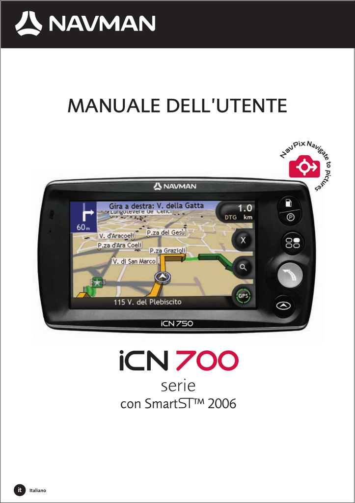 Pix Navig av to pictu r ate N MANUALE DELL’UTENTE es iCN 700 serie con SmartS™ 2006 it Italiano Serie iCN 700 Manuale dell'utente Italiano © 2006 Brunswick New Technologies Asia Pte Limited. Navman è un marchio registrato di Brunswick New Technologies Asia Pte Limited e viene usato su licenza di Navman New Zealand. Tutti i diritti riservati. Il software contiene informazioni di proprietà della Navman; viene fornito con un accordo di licenza che comprende restrizioni sull'uso e la divulgazione ed è protetto dalla legge in materia di diritti d'autore. È proibita la decompilazione del software. Nessuna parte della presente pubblicazione può essere riprodotta, memorizzata in un sistema di ricerca né trasmessa, in nessuna forma e con nessun mezzo, elettronico, meccanico, tramite fotocopia, registrazione o altro, senza il previo consenso scritto di Navman. Back-On-Track, Drive-Away, NavPix, Smart e Turn-by-Turn sono marchi commerciali o marchi registrati di Brunswick New Technologies Asia Pte Limited e vengono usati su licenza di Navman New Zealand. Tutti i diritti riservati. Microsoft Windows 2000 e XP SP1, Microsoft Internet Explorer e ActiveSync sono marchi registrati o marchi di Microsoft Corporation negli Stati Uniti e/o altri Paesi. Tutti i diritti riservati. Adobe and Adobe Reader sono marchi registrati o marchi di Adobe Systems Incorporated negli Stati Uniti e/o altri Paesi. Tutti i diritti riservati. Location Identifiers © 2005 International Air Transport Association. Tutti gli altri marchi e marchi registrati appartengono ai rispettivi proprietari. Pubblicato in Nuova Zelanda. Declinazione di responsabilità Queste informazioni possono subire modifiche senza preavviso a causa del continuo sviluppo del prodotto. La Navman non garantisce che il presente documento sia privo d'errori. Le schermate e le altre presentazioni mostrate in questo manuale dell'utente possono differire dalle schermate effettive generate dal prodotto reale. Tutte queste differenze sono di secondaria importanza: il prodotto reale fornirà sostanzialmente la funzionalità descritta così come viene presentata nel manuale dell'utente. Conformità Questo dispositivo è conforme alla parte 15 delle Regole FCC. L’uso è soggetto alle seguenti due condizioni: (1) il presente dispositivo non deve generare interferenze dannose e (2) il presente dispositivo deve accettare tutte le interferenze ricevute, comprese quelle che potrebbero provocarne un funzionamento indesiderato. Il software è basato in parte sul lavoro dell'Independent JPEG Group. Importanti informazioni per il corretto riciclaggio/smaltimento di questa apparecchiatura Il simbolo qui sotto indicato, riportato sull'apparecchiatura elettronica da Lei acquistata e/o sulla sua confezione, indica che questa apparecchiatura elettronica non potrà essere smaltita come un rifiuto qualunque ma dovrà essere oggetto di raccolta separata. Infatti i rifiuti di apparecchiatura elettroniche ed elettroniche devono essere sottoposti ad uno specifico trattamento, indispensabile per evitare la dispersione degli inquinanti contenuti all''interno delle apparecchiature stesse, a tutela dell'ambiente e della salute umana. Inoltre sarà possibile riutilizzare/riciclare parte dei materiali di cui i rifiuti di apparecchiature elettriche ed elettroniche sono composti, riducendo così l'utilizzo di risorse naturali nonché la quantità di rifiuti da smaltire. E' Sua responsabilità, come utilizzatore di questa apparecchiatura elettronica, provvedere al conferimento della stessa al centro di raccolta di rifiuti di apparecchiature elettriche ed elettroniche predisposto dal Suo Comune. Per maggiori informazioni sul centro di raccolta a Lei più vicino, La invitiamo a contattare i competenti uffici del Suo Comune. Qualora invece avesse deciso di acquistare una nuova apparecchiata elettronica di tipo equivalente e destinata a svolgere le stesse funzioni di quella da smaltire, potrà portare la vecchia apparecchiatura al distributore presso cui acquista la nuova. Il distributore sarà tenuto ritirare gratuitamente la vecchia 1 apparecchiatura . Si tenga presente che l'abbandono ed il deposito incontrollato di rifiuti sono puniti con sanzione amministrativa pecuniaria da € 103 a € 619, salvo che il fatto costituisca più grave reato. Se l'abbandono riguarda rifiuti non pericolosi od ingombranti si applica la sanzione amministrativa pecuniaria da € 25 a € 154. Il suo contributo nella raccolta differenziata dei rifiuti di apparecchiature elettriche ed elettroniche è essenziale per il raggiungimento di tutela della salute umana connessi al corretto smaltimento e recupero delle apparecchiature stesse.Applicable accessory: In-vehicle power adaptor. Le informazioni sopra riportate sono redatte in conformità alla Direttiva 2002/96/CE ed al D. Lgs. 25 luglio 2005, n.151 che prevedono l'obbligatorietà di un sistema di raccolta differenziata nonché particolari modalità di trattamento e smaltimento dei rifiuti di apparecchiature elettriche ed elettroniche (RAEE). 1 Il distributore non sarà tenuto a ritirare l'apparecchiatura elettronica qualora vi sia un rischio di contaminazione del personale incaricati o qualora risulti evidente che l'apparecchiatura in questione non contiene i suoi componenti essenziali o contiene rifiuti diversi da apparecchiature elettriche e/o elettroniche. Serie iCN 700 | Informazioni importanti sulla sicurezza Informazioni importanti sulla sicurezza SI PREGA DI LEGGERE CON ATTENZIONE PRIMA DI INSTALLARE IL PRODOTTO NEL VEICOLO Questo è il simbolo relativo ad un avviso di sicurezza. Viene usato per richiamare l'attenzione sul rischio di lesioni fisiche. Per evitare possibili lesioni o la morte, attenersi a tutti i messaggi di sicurezza che seguono questo simbolo. AVVERTENZA indica una situazione potenzialmente rischiosa che, se non evitata, potrebbe causare la morte o lesioni gravi. ATTENZIONE indica una situazione potenzialmente rischiosa che, se non