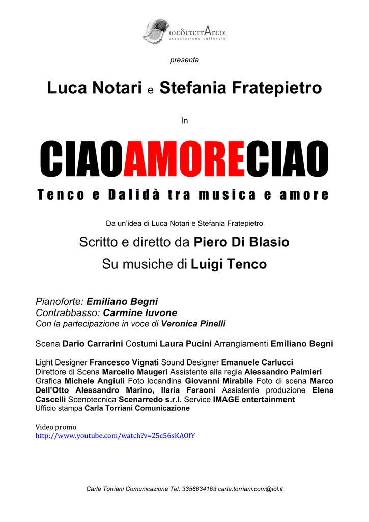 presenta Luca Notari e Stefania Fratepietro In CIAOAMORECIAO Tenco e Dalidà tra musica e amore Da un’idea di Luca Notari e Stefania Fratepietro Scritto e diretto da Piero Di Blasio Su musiche di Luigi Tenco Pianoforte: Emiliano Begni Contrabbasso: Carmine Iuvone Con la partecipazione in voce di Veronica Pinelli Scena Dario Carrarini Costumi Laura Pucini Arrangiamenti Emiliano Begni Light Designer Francesco Vignati Sound Designer Emanuele Carlucci Direttore di Scena Marcello Maugeri Assistente alla regia Alessandro Palmieri Grafica Michele Angiuli Foto locandina Giovanni Mirabile Foto di scena Marco Dell’Otto Alessandro Marino, Ilaria Faraoni Assistente produzione Elena Cascelli Scenotecnica Scenarredo s.r.l. Service IMAGE entertainment Ufficio stampa Carla Torriani Comunicazione Video promo http://www.youtube.com/watch?v=25c56sKAOfY Carla Torriani Comunicazione Tel. 3356634163 [email protected] 1967. Due vite legate da una canzone e forse da qualcosa di più. L’ultimo anno di vita di Luigi Tenco. Il rapporto con Dalidà, le case discografiche e il pubblico italiano, “inconsapevole colpevole” della morte del grande cantautore italiano, strappato troppo presto all’amore e alla musica. “Ciao amore, ciao”, una dichiarazione, ancora prima che una canzone. NOTE DI REGIA Una canzone mai realmente cantata. Un amore troppo chiacchierato e poco vissuto. Uno sparo. Comincia così lo spettacolo “Ciao amore, ciao”. Dalla fine, ma senza analizzarla. Non è un’arringa sulle cause della morte di Luigi Tenco. Non è un’apologia del cantautore scomparso e, tantomeno, non è un recital. È un musical a tutti gli effetti. Anche se preferisco chiamarlo “prosa con musiche”. La parola è fondamentale in questo spettacolo, anche perché, molto spesso, le parole sono mutuate dallo stesso Tenco. Parole profonde e dirette che lasciano poco spazio all’interpretazione. Certamente la musica non fa da contorno, anzi. Come nella migliore tradizione del musical anglosassone, la colonna sonora dello spettacolo, eseguita dal vivo e interamente composta di canzoni del cantautore ligure, non solo descrive le varie scene, ma ne porta avanti la narrazione, ci racconta una storia d’amore. E si, perché con questo spettacolo vogliamo raccontare una storia d’amore. E non ci importa se gli amanti si chiamano Tenco e Dalida. Quello che ci interessa è come si conoscono, come si scoprono, come si amano e come, alla fine, si lasciano. La spettacolo rievoca una vicenda reale. Ma badate bene che ho detto “rievoca”, non ripropone o rappresenta. Infatti con questo spettacolo vogliamo tratteggiare gli aspetti più importanti di due grandi personaggi, ma non farne una copia conforme che potrebbe risultare pedissequa e priva di idee. Noi rappresentiamo l’essenza dei personaggi, non i personaggi stessi. Anche per questo motivo, la maggior parte dei brani dello spettacolo sono splendidamente arrangiati dal Maestro Emiliano Begni. Come dicevo, raccontiamo una storia, scandita dai momenti salienti di quel fatidico Sanremo ’67 Luigi Tenco (Luca Notari) è già un musicista apprezzato e “rivoluzionario” (non dimentichiamoci che la storia si apre nel 1967, un anno prima dello storico periodo di contestazioni sociali). Nel febbraio di quello stesso anno, viene chiamato a Roma da Nanni Ricordi, proprietario della storica casa discografica RCA. La proposta è allettante: il festival di Sanremo. Ma non è allettante per il luogo, di per se non gradito a Luigi, ma per la compagna che lo avrebbe affiancato su quel prestigioso palco: Dalida (Stefania Fratepietro). Un anno insieme. Tra Roma e Parigi, tra alti e bassi, tra amori presunti, dichiarati e non corrisposti. I luoghi sono sempre stilizzati, le scenografie mai descrittive. Ogni ambiente deve poter essere la storia di ognuno di noi. Ogni spettatore deve potersi sentire Luigi o Dalida. Le canzoni, il punto focale della loro vicenda. Conosciamo Luigi attraverso le sue stesse parole. Sappiamo come vede la gente e come la gente vede lui (Io sono uno). L’incontro con Dalida è casuale e maledettamente forte. Lei è bella e algida. Lui la crede viziata e snob, ma la bella francese gli spiega che non è proprio così (Un giorno dopo l’altro). Nasce qualcosa tra i due, qualcosa di non esattamente chiaro. E allora Tenco prova a forzare un po’ la mano. La invita ad uscire… alle tre di notte (Se tu fossi una brava ragazza). La vita romana di Luigi, però, non va come si aspettava e al telefono, con la madre, cerca quel conforto che la distanza non gli permette, anche “mentendo” sul presente e sperando sul futuro (Vedrai, Vedrai). Cominciano i tormenti e le pene d’amore. Dalida è sposata, lui è innamorato… di un’altra donna. (Ho capito che ti amo, Come le altre, Più m’innamoro di te e meno tu mi ami). Il danno è fatto, irreparabile, ma la casa discografica non permette che si sappia della rottura della coppia, anzi ne dichiara l’imminente matrimonio, subito dopo il festival. Dalida è furiosa (Io si). La sera di capodanno, i due si presentano insieme alla casina Valadier, a Roma. Luigi è strano ed ubriaco, lei è fredda e distante. Tra gli auguri e le grida, si regalano un testamento d’amore. Di un amore diverso, già segnato, che solo loro potevano capire (Lontano, Lontano). Arriva finalmente il tanto atteso Sanremo (Ciao amore, Ciao), ma i giochi, per tutti, sono ormai fatti. L’amore, come l’uomo, nasce, cresce e muore. Poco importa chi lo ha ucciso, certo è che non esiste più. È finito. Questo, e molto altro, è “Ciao amore, Ciao”, Tenco e Dalida, tra musica e amore. Luca Notari Cantante attore dalla vocalità versatile, da oltre 16 anni vanta collaborazioni con alcuni tra i più importanti protagonisti della scena italiana. Debutta all’età di 20 anni diretto da Gigi Proietti nello spettacolo MELODICA con Donatella Pandimiglio. Seguono due grandi produzioni con Massimo Ranieri dirette da Giuseppe Patroni Griffi, HOLLY