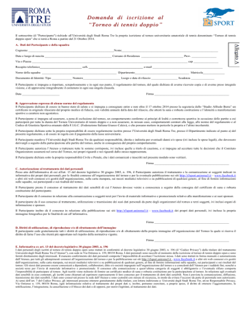 Domanda di iscrizione al “ Torneo di tennis doppio ” Il sottoscritto (il "Partecipante") richiede all’Università degli Studi Roma Tre la propria iscrizione al torneo universitario amatoriale di tennis denominato “Torneo di tennis doppio open” che si terrà a Roma a partire dal 21 Ottobre 2014. Cognome _______________________________________________________Nome______________________________________________________________ Data e luogo di nascita ___________________________________________ Comune di Residenza ___________________________ Prov. ________________ Via o Piazza ____________________________________________________________________________________________________ cap ________________ Allegato A A. Dati del Partecipante e della squadra Recapito telefonico___________________________ cell. ___________________________________ e-mail _____________________________________________ Nome della squadra ________________________________________________ Dipartimento___________________________________ Matricola______________ Documento di Identità: Tipo _____________ Numero________________________ Luogo e data di rilascio _________________ Scadenza _______________ Il Partecipante si impegna a rispettare, scrupolosamente e in ogni suo punto, il regolamento del torneo, del quale dichiara di averne ricevuto copia e di averne preso integrale visione, e di approvarne integralmente il contenuto in ogni sua singola clausola. Data ________________________ Firma ________________________________________________ B. Approvazione espressa di alcune norme del regolamento Il Partecipante dichiara di essere in buono stato di salute e si impegna a consegnare entro e non oltre il 17 ottobre 2014 presso la segreteria dello “Stadio Alfredo Berra” un certificato in originale rilasciato dal proprio medico di fiducia, con validità annuale dalla data del rilascio, che attesti la sana e robusta costituzione e l’idoneità a manifestazioni sportive a carattere non agonistico. Il Partecipante si impegna ad assumere, a pena di esclusione dal torneo, un comportamento conforme ai principi di lealtà e correttezza sportiva in occasione delle partite a cui parteciperà per tutta la durata del Torneo Universitario di tennis doppio e a non assumere, in nessun caso, comportamenti contrari alla legge, alle norme del regolamento e al Codice di Giustizia Sportiva emanato dalla F.I.G.C. (Federazione Italiana Giuoco Calcio), o che possano mettere in pericolo la propria o l’altrui incolumità. Il Partecipante dichiara sotto la propria responsabilità di essere regolarmente iscritto presso l’Università degli Studi Roma Tre, presso il Dipartimento indicato al punto a) del presente regolamento, e di essere in regola con il pagamento della tasse universitarie. Il Partecipante manleva l’Università degli Studi Roma Tre da qualsiasi responsabilità, diretta e indiretta per eventuali danni e/o spese (ivi incluse le spese legali), che dovessero derivargli a seguito della partecipazione alle partite del torneo, anche in conseguenza del proprio comportamento. Il Partecipante autorizza l’Ateneo a trattenere tutte le somme corrisposte, ivi incluse quelle a titolo di cauzione, e si impegna ad accettare tutte le decisioni che il Comitato Organizzatore assumerà nel corso del Torneo, nei propri riguardi e nei riguardi dallo stesso rappresentata. Il Partecipante dichiara sotto la propria responsabilità Civile e Penale, che i dati comunicati e trascritti nel presente modulo sono veritieri. Firma ________________________________________________ C. Autorizzazione al trattamento dei dati personali Preso atto dell'informativa di cui all'art. 13 del decreto legislativo 30 giugno 2003, n. 196, il Partecipante autorizza il trattamento e la comunicazione ai soggetti indicati in informativa dei propri dati personali, per le finalità connesse all’organizzazione del torneo e per la eventuale pubblicazione sui siti http://r3sport.uniroma3.it – www.facebook.it e altri siti web connessi e/o gestiti dall’organizzazione, sulla carta stampata, sui mezzi mediatici televisivi e su pubblicazioni di qualsiasi genere, al fine di fornire informazioni sulle squadre, sui partecipanti e sui risultati del torneo. Il Partecipante presta il consenso al trattamento dei dati sensibili di cui l’Ateneo dovesse venire a conoscenza a seguito della consegna del certificato di sana e robusta costituzione del partecipante. Il Partecipante dà il consenso in relazione alla comunicazione a soggetti terzi per l’invio di materiale informativo e promozionale relativo alla manifestazione e ai suoi sponsor. Il partecipante da il suo consenso al trattamento, utilizzazione e trasmissione dei suoi dati personali da parte degli organizzatori del torneo a terzi soggetti, ivi inclusi organi di informazione e sponsor. Il Partecipante inoltre dà il consenso in relazione alla pubblicazione sui siti http://r3sport.uniroma3.it - www.facebook.it dei propri dati personali, ivi inclusa la propria immagine fotografica per le finalità di cui all’informativa. Firma ________________________________________________ D. Diritti di utilizzazione, di riproduzione e/o di sfruttamento dell’immagine Il partecipante cede gratuitamente tutti i diritti di utilizzazione, di riproduzione e/o di sfruttamento della propria immagine all’organizzazione del Torneo la quale si riserva il diritto di farne l’uso che riterrà più opportuno nel rispetto della normativa vigente. Firma ________________________________________________ E. Informativa ex art. 13 del decreto legislativo 30 giugno 2003, n. 196 I dati personali degli iscritti al torneo di tennis doppio open sono trattati in conformità al decreto legislativo 30 giugno 2003, n. 196 (il “Codice Privacy”) dalla titolare del trattamento Università degli Studi Roma Tre (l’Ateneo”), con sede in Via Ostiense n. 159, 00154 Roma. I dati personali sono raccolti al momento della iscrizione al torneo di tennis doppio open e sono for