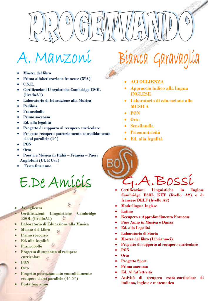 • • • • Mostra del libro Prima alfabetizzazione francese (5°A) C.S.E. Certificazioni Linguistiche Cambridge ESOL (livelloA1) • Laboratorio di Educazione alla Musica • Pedibus • Francobollo • Primo soccorso • Ed. alla legalità • Progetto di supporto al recupero curricolare • Progetto recupero potenziamento consolidamento classi parallele (1^) • PON • Orto • Poesia e Musica in Italia – Francia – Paesi Anglofoni (Uk E Usa) • Festa fine anno • Accoglienza • Certificazioni Linguistiche Cambridge ESOL (livelloA1) • Laboratorio di Educazione alla Musica • Mostra del Libro • Primo soccorso • Ed. alla legalità • Francobollo • Progetto di supporto al recupero curricolare • PON • Orto • Progetto potenziamento consolidamento recupero classi parallele (4^ 5^) • Festa fine anno • ACCOGLIENZA • Approccio ludico alla lingua INGLESE • Laboratorio di educazione alla MUSICA • PON • Orto • Sensilandia • Psicomotricità • Ed. alla legalità • Certificazioni Linguistiche in Inglese Cambridge ESOL KET (livello A2) e di francese DELF (livello A2) • Madrelingua Inglese • Latino • Recupero e Approfondimento Francese • Fine Anno in Musica e Danza • Ed. alla Legalità • Laboratorio di Storia • Mostra del libro (Libriamoci) • Progetto di supporto al recupero curricolare • PON • Orto • Progetto Sport • Primo soccorso • Ed. All’affettività • Attività di recupero extra-curricolare di italiano, inglese e matematica