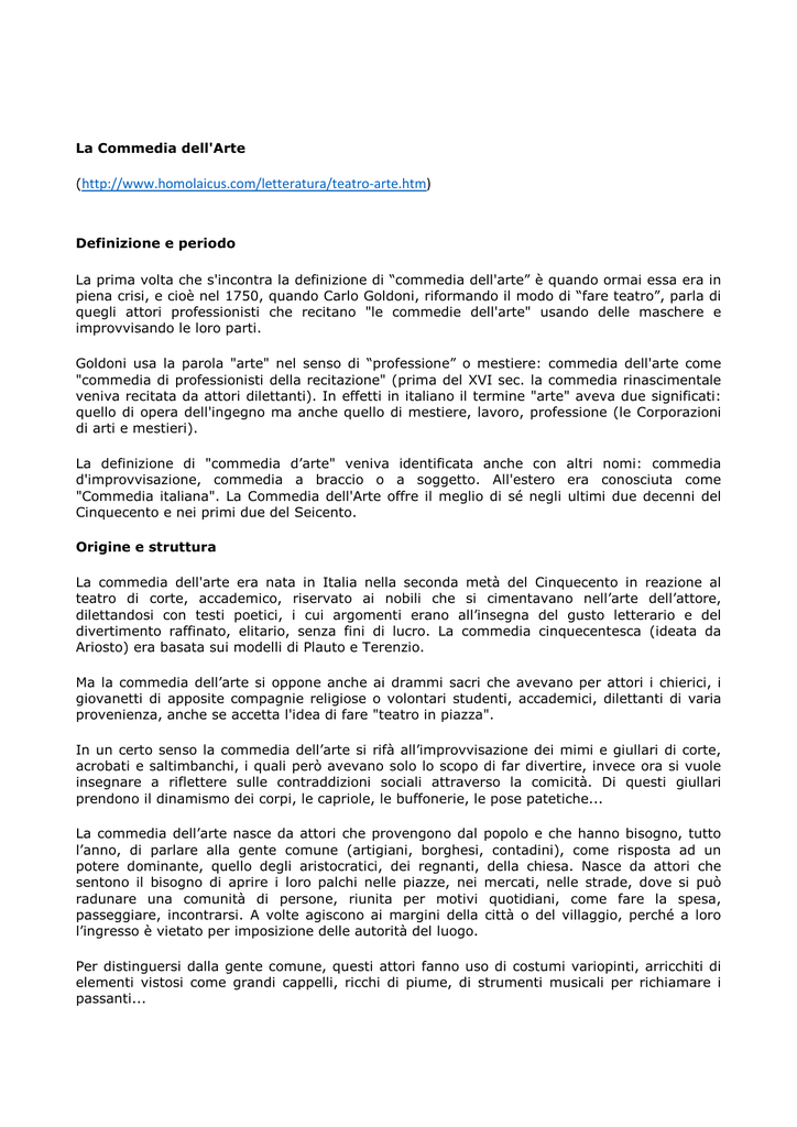 La Commedia dell'Arte (http://www.homolaicus.com/letteratura/teatro-arte.htm) Definizione e periodo La prima volta che s'incontra la definizione di “commedia dell'arte” è quando ormai essa era in piena crisi, e cioè nel 1750, quando Carlo Goldoni, riformando il modo di “fare teatro”, parla di quegli attori professionisti che recitano "le commedie dell'arte" usando delle maschere e improvvisando le loro parti. Goldoni usa la parola "arte" nel senso di “professione” o mestiere: commedia dell'arte come "commedia di professionisti della recitazione" (prima del XVI sec. la commedia rinascimentale veniva recitata da attori dilettanti). In effetti in italiano il termine "arte" aveva due significati: quello di opera dell'ingegno ma anche quello di mestiere, lavoro, professione (le Corporazioni di arti e mestieri). La definizione di "commedia d’arte" veniva identificata anche con altri nomi: commedia d'improvvisazione, commedia a braccio o a soggetto. All'estero era conosciuta come "Commedia italiana". La Commedia dell'Arte offre il meglio di sé negli ultimi due decenni del Cinquecento e nei primi due del Seicento. Origine e struttura La commedia dell'arte era nata in Italia nella seconda metà del Cinquecento in reazione al teatro di corte, accademico, riservato ai nobili che si cimentavano nell’arte dell’attore, dilettandosi con testi poetici, i cui argomenti erano all’insegna del gusto letterario e del divertimento raffinato, elitario, senza fini di lucro. La commedia cinquecentesca (ideata da Ariosto) era basata sui modelli di Plauto e Terenzio. Ma la commedia dell’arte si oppone anche ai drammi sacri che avevano per attori i chierici, i giovanetti di apposite compagnie religiose o volontari studenti, accademici, dilettanti di varia provenienza, anche se accetta l'idea di fare "teatro in piazza". In un certo senso la commedia dell’arte si rifà all’improvvisazione dei mimi e giullari di corte, acrobati e saltimbanchi, i quali però avevano solo lo scopo di far divertire, invece ora si vuole insegnare a riflettere sulle contraddizioni sociali attraverso la comicità. Di questi giullari prendono il dinamismo dei corpi, le capriole, le buffonerie, le pose patetiche... La commedia dell’arte nasce da attori che provengono dal popolo e che hanno bisogno, tutto l’anno, di parlare alla gente comune (artigiani, borghesi, contadini), come risposta ad un potere dominante, quello degli aristocratici, dei regnanti, della chiesa. Nasce da attori che sentono il bisogno di aprire i loro palchi nelle piazze, nei mercati, nelle strade, dove si può radunare una comunità di persone, riunita per motivi quotidiani, come fare la spesa, passeggiare, incontrarsi. A volte agiscono ai margini della città o del villaggio, perché a loro l’ingresso è vietato per imposizione delle autorità del luogo. Per distinguersi dalla gente comune, questi attori fanno uso di costumi variopinti, arricchiti di elementi vistosi come grandi cappelli, ricchi di piume, di strumenti musicali per richiamare i passanti... In genere le compagnie erano composte di dieci persone: otto uomini e due donne (in epoca medievale la donna non poteva recitare: le parti femminili venivano fatte da uomini travestiti). Il primo esempio di una compagnia di comici professionisti fu quella che nel 1545 stese un contratto davanti ad un notaio di Padova, in cui gli attori dichiarano di volersi dividere in parti uguali il ricavato dei loro spettacoli, prestandosi mutuo soccorso in caso di incidenti o malattie. Dalla Commedia al Canovaccio I testi da recitare si limitavano ad un canovaccio (da "panno grossolano a larghe maglie"), dove veniva data una narrazione di massima indicativa di ciò che sarebbe successo sul palco. Quindi niente testi scritti ma scenari, che permettevano agli attori professionisti di una determinata maschera di improvvisare a piacimento. I temi trattati sono sempre dei contrasti comici tra opposte maschere. Il testo in un certo senso si ricompone solo nello spettacolo, sommando le parti di tutti i personaggi. Gli attori professionisti erano fieri di recitare a soggetto, senza battute da imparare a memoria, basandosi esclusivamente sulla loro capacità di improvvisazione e senza dover sottostare a particolari scenografie, illuminazione, oggettistica di scena. Ma per praticare questo genere di teatro occorrevano attori che sapessero fare tutto: cantare, suonare, danzare, recitare, improvvisare… e che sapessero soprattutto calarsi nelle specificità locali delle città ove si esibivano. L'ultima opera teatrale scritta e pubblicata sotto forma di canovaccio fu L'Amore delle tre melarance di Carlo Gozzi del 1761, il maggior avversario della riforma di Goldoni. Teatro in piazza Le compagnie di teatranti si spostano da un paese all’altro, in cerca sempre di nuovo pubblico, e introducono il concetto di biglietto da acquistare per coloro che vogliono assistere seduti stando in un’area circoscritta intorno al palcoscenico, destinata a chi vuol portare una sedia per maggior comodità. Oppure si raccoglie una libera offerta da tutti coloro che stanno al di là dell’area circoscritta di solito con delle transenne. Per potersi spostare agilmente, si organizzano dei carri in cui abitare, dormire e mangiare. Carrozzoni viaggianti in cui poter trasportare costumi, maschere, bauli, strumenti musicali. Queste carovane passano da una regione all’altra, gli attori adottano di conseguenza elementi gergali, espressioni dialettali del posto ove si trovano, per meglio comunicare con il pubblico, si informano sui personaggi più in vista per metterli in ridicolo. Il carrozzone, gli scenari e la maggior parte dei costumi appartenevano di solito al capocomico. La maschera I comici dell'arte s’accorsero che il pubblico, a teatro, veniva attratto non tanto dall'autore di una commedia, quanto dall'attore, per la sua capacità di fare variazioni sul tema, di intrecciare in maniera diversa cose già note. L'uso delle mas