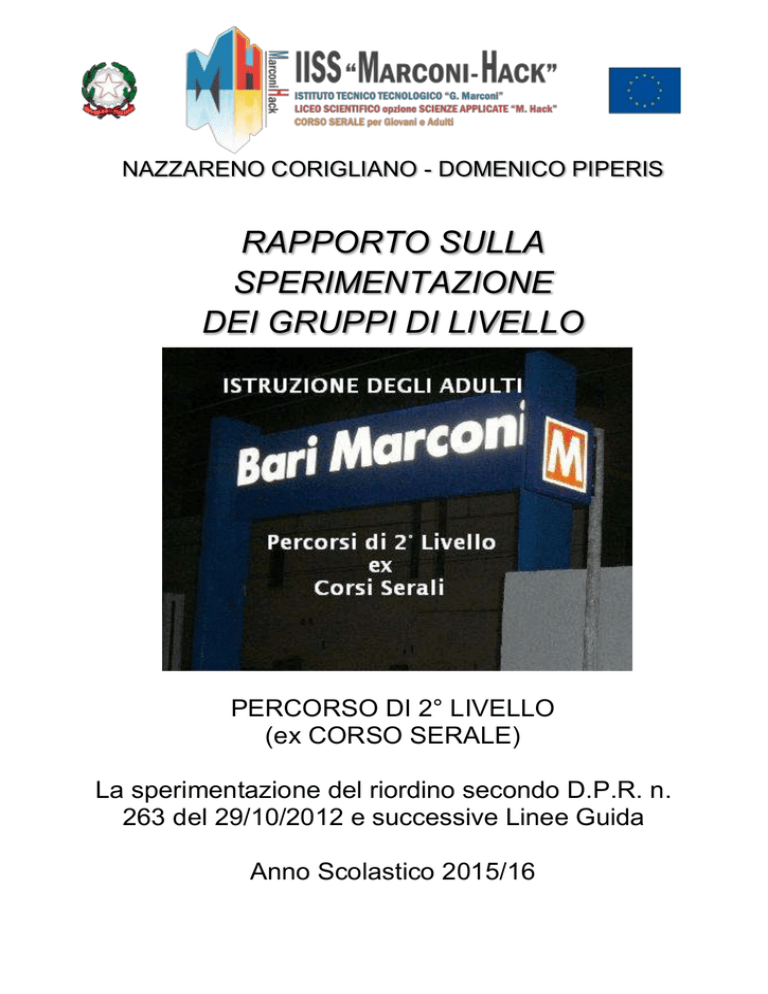 NAZZARENO CORIGLIANO - DOMENICO PIPERIS RAPPORTO SULLA SPERIMENTAZIONE DEI GRUPPI DI LIVELLO PERCORSO DI 2° LIVELLO (ex CORSO SERALE) La sperimentazione del riordino secondo D.P.R. n. 263 del 29/10/2012 e successive Linee Guida Anno Scolastico 2015/16 INDICE 1. INTRODUZIONE .................................................................................................3 2. PRESENTAZIONE DELLA SPERIMENTAZIONE.........................................5 2.1. I Periodi Didattici ........................................................................................ 5 2.2. I Gruppi di Livello ....................................................................................... 7 2.3. I Patti Formativi Individuali ....................................................................... 9 2.4. Le unità di apprendimento...................................................................... 10 3. LE COMMISSIONI DI SUPPORTO ALLA SPERIMENTAZIONE .............11 3.1. Commissione Riconoscimento Crediti Formativi ................................ 11 3.2. Commissione Patto Formativo .............................................................. 12 3.3. Commissione Ricerca e Sviluppo ......................................................... 13 4. COSTITUZIONE E FUNZIONAMENTO DEI GRUPPI DI LIVELLO .........14 5. ACCERTAMENTO DEI CREDITI FORMATIVI E CERTIFICAZIONI .......19 6. IL PATTO FORMATIVO ...................................................................................20 7. I PERIODI TRIMESTRALI, IL QUADRO ORARIO DELLE COMPETENZE ED I PIANI DI LAVORO IN UDA ........................................22 8. ORGANICO DOCENTE E CONSIGLI DI PERIODO DIDATTICO............24 9. ORARIO DELLE LEZIONI ...............................................................................27 10. REGISTRO ELETTRONICO E REGISTRO CARTACEO.........................27 11. RECUPERO DEBITI .......................................................................................31 12. CREDITO SCOLASTICO ...............................................................................33 13. RAPPORTI CON IL CPIA TERRITORIALE.................................................34 14. PUNTI DI FORZA E DI DEBOLEZZA...........................................................35 14.1. Punti di forza ............................................................................................ 36 14.2. Punti di debolezza ................................................................................... 36 15. ALLEGATI .........................................................................................................37 Rapporto sulla Sperimentazione dei Gruppi di Livello – A.S. 2015-2016 - PERCORSI DI 2° LIVELLO - IISS “Marconi - Hack” – Bari pag. 2/37 1. INTRODUZIONE L’anno scolastico 2015-2016, appena concluso, si configura certamente come un anno che rimarrà nella storia dell’Istruzione degli adulti (IDA) della Scuola italiana in quanto, con il riordino previsto dal D.P.R. n. 263 del 29/10/2012 e dalle successive Linee Guida, si sono introdotti mutamenti che, per molti aspetti, hanno stravolto il precedente assetto con il dichiarato intento di migliorarlo. Noi, docenti del percorso di 2° livello (ex Corso Serale SIRIO) dell’I.I.S.S. “Marconi - Hack” di Bari in rete con il CPIA 1 di Bari, dopo un’approfondita lettura dei contenuti sia del DPR 263 sia delle Linee Guida e consapevoli del quadro normativo del settore, abbiamo voluto provare a mettere in pratica quanto dettato dalla normativa, soprattutto in merito al nuovo assetto organizzativo e didattico, nonostante gli innumerevoli ostacoli e/o impedimenti che già in partenza prevedevamo avremmo fronteggiato. Il primo fondamentale ostacolo è derivato dalla scarsità del personale in organico assegnato ancora, in modo riduttivo, con la vecchia logica basata sul numero delle classi e non dei gruppi di livello, la cui istituzione viene ritenuta dalla norma imprescindibile ed essenziale al raggiungimento degli obiettivi prefissati con il riordino. Tale questione è risultata per noi ancor più penalizzante giacché l’USR Puglia, a partire dall’a.s. 2014/2015 in cui si era già avviata la riduzione d’orario fino al 4° anno, ha sostanzialmente ignorato quanto previsto nella C.M. n. 36 del 10/04/2014, ossia che “...per i percorsi di secondo livello (ex corsi serali)...la prevista riduzione dei quadri orari...non comporterà riduzione della dotazione organica e le eventuali economie potranno essere utilizzate prioritariamente per lo sviluppo dei percorsi di secondo livello e in via subordinata per altre esigenze delle Istituzioni di Secondo Grado”, perseverando così nella “dissanguante” politica di tagli e riduzioni che hanno compromesso, come vedremo più nel dettaglio in seguito, la piena attuazione della parte più innovativa ed efficace del riordino, vale a dire l’organizzazione per gruppi di livello. In questa situazione e con le scarsissime risorse a disposizione, abbiamo dovuto progettare, prima di metterlo in pratica, un modello organizzativo per gruppi di livello, giacché il DPR 263 e le successive Linee Guida ne comandavano l’adozione al fine di rendere più agevole e sostenibile il percorso di istruzione per l’adulto, ma senza fornire alcuna indicazione in merito alla loro costituzione, né Rapporto sulla Sperimentazione dei Gruppi di Livello – A.S. 2015-2016 - PERCORSI DI 2° LIVELLO - IISS “Marconi - Hack” – Bari pag. 3/37 esempi di modelli precostituiti. A spingerci, nonostante tutto, su questa strada da un lato la coscienza di chi vuole rispettare le leggi, la volontà e gli obiettivi posti dal legislatore, dall’altro l’esigenza di sperimentare per poter capire, correggere e, se possibile, migliorare senza dare nulla per scontato, intenti a ricavare il modus operandi attraverso il risultato raccolto sul campo dell’esperienza. È questo il metodo scientifico in cui, un po’ per deformazione professionale, abbiamo sempre 