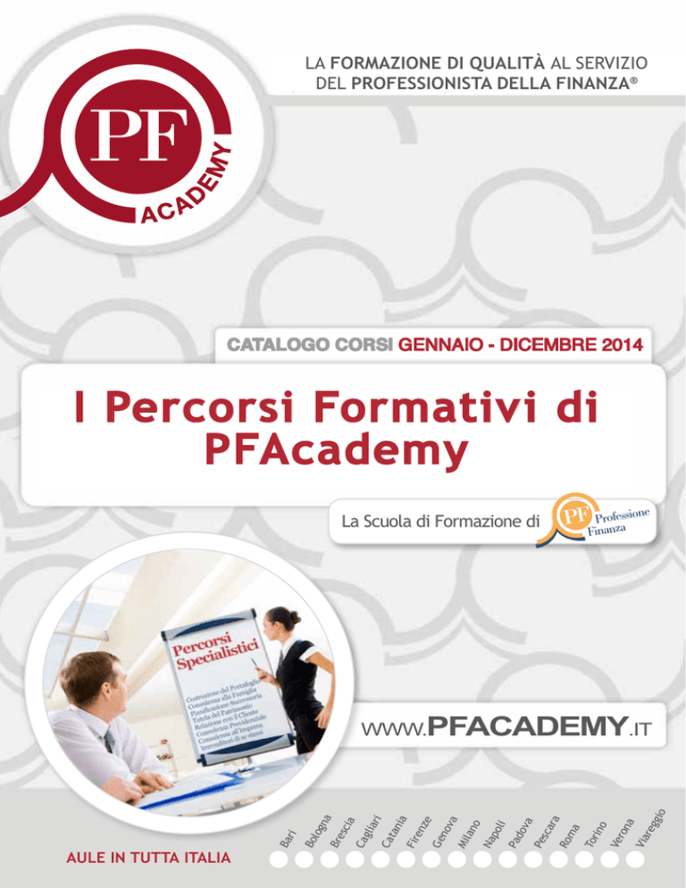 LA FORMAZIONE DI QUALITÀ AL SERVIZIO DEL PROFESSIONISTA DELLA FINANZA® CATALOGO CORSI GENNAIO - DICEMBRE 2014 I Percorsi Formativi di PFAcademy La Scuola di Formazione di PF Praonfezassione Fin Tor ino Ve ron a Via reg gio AULE IN TUTTA ITALIA Ba ri Bo log na Bre sci a Ca gli ari Ca tan ia Fir en ze Ge no va Mil an o Na po li Pa do va Pe sca ra Ro ma WWW.PFACADEMY.IT 1. G PF IN PF INDICE Percorsi Formativi L D HO Costruzione del Portafoglio Analisi ed interpretazione dei principali indicatori Macroeconomici Trasferire il dossier titoli dei propri Clienti: indicazioni pratiche e operative La gestione del Portfolio tattico e Money Management: aspetti operativi a confronto Investire nella finanza sostenibile e responsabile: nuove opportunità per investimenti consapevoli I Mercati Spiegati da un Gestore Indipendente Ciclo di vita del Cliente e modelli avanzati di Consulenza e Pianificazione Advisor e selezione dei fondi per la Clientela Private finanza STORE. L I B R I S O F T W A R E TUTTI I CO SONO D RSI I 8 ORE com T O O L S 8 9 10 11 12 13 14 Consulenza alla Famiglia La Premiazione dei Professionisti della Finanza® che dimostrano di avere le migliori competenze professionali PF Professione Finanza Il contesto famigliare attuale e la consulenza finanziaria: istruzioni per l'uso Redditometro, Indagini finanziarie e Consulenza all’Investitore Il regime Patrimoniale della Famiglia e la Consulenza Finanziaria Il Fondo Patrimoniale come strumento di Tutela del Patrimonio Familiare Il Cliente Private e la fiscalità dei patrimoni mobiliari e immobiliari detenuti all'estero 16 17 18 19 20 Pianificazione Successoria Il Passaggio Generazionale dei Patrimoni Familiari La Pianificazione Successoria tramite le Polizze Vita La Pianificazione e la Gestione della Successione nei rapporti bancari, finanziari e assicurativi Il Private Insurance: strumento di Wealth Management Il passaggio Generazionale delle famiglie HNWI: dalla corporate governance al fondo immobiliare 22 23 24 25 26 Tutela del Patrimonio Tutelare il Patrimonio dell'Imprenditore e del Professionista Impignorabilità ed insequestrabilità delle Polizze Vita a confronto con altri Strumenti Giuridici di Tutela Patrimoniale Il Trust: applicazioni pratiche per imprenditori e professionisti 28 29 30 INDICE Percorsi Formativi Relazione con il Cliente INDICE Percorsi Formativi PF TUTTI I CO SONO D RSI I 8 ORE Approcci e mezzi per la Gestione Emotiva del Cliente L'approccio al Cliente in chiave psicologica. Dalla teoria alla pratica Esperienze passate e Decisioni future. Che cosa pensa realmente il Cliente Investitore La Telefonata di successo per acquisire clienti Tecniche ottenimento referral Come convincere il Cliente con le più avanzate tecniche di vendita Pianificazione finanziaria e contabilità mentale del cliente. Istruzioni per l'uso Il Linguaggio persuasivo nella Promozione Finanziaria L'arte della Negoziazione per superare i conflitti e migliorare le trattative Comunicazione efficace ed Empowerment commerciale Le competenze psicologiche del Consulente Finanziario Pubblic Speaking: convincere, influenzare, persuadere nelle presentazioni in pubblico Imprenditori di se stessi 32 33 34 35 36 37 38 39 40 41 42 43 Corsi di Ottenimento della Certificazione EFA La consulenza finanziaria e patrimoniale agli High Net Worth Individuals 45 46 47 La consulenza al patrimonio internazionale del Cliente Dal Personal Marketing al Personal Branding Pianificazione Successoria e Tutela del Patrimonio Come migliorare i propri skills di vendita Come diventare (e rimanere) un manager di successo Consulenza all'Impresa Conoscere gli indicatori patrimoniali dell'azienda per intraprendere una relazione efficace con l'imprenditore La Pianificazione Successoria del Patrimonio Personale dell'Imprenditore La previsione economico-finanziaria dell'azienda: come pianificare il futuro dell'impresa e dell'imprenditore Il Patto di Famiglia: strumento operativo per gestire il passaggio generazionale dell'impresa La Consulenza Finanziaria e la Pianificazione Fiscale delle attività detenute all'estero del Cliente Imprenditore Costituzione e caratteristiche della Ltd: come gestire le attività oltreconfine-specialistico Il Colloquio di Feedback per motivare le risorse a risultati eccellenti Tecniche di Selezione e Reclutamento Percorsi di approfondimento specialistico Consulenza Previdenziale Come Pianificare gli Investimenti ai fini Previdenziali post riforma Monti La psicologia degli investitori e le scelte di investimento in ambito previdenziale La Pianificazione Previdenziale dell’Imprenditore post ultima riforma - D.L. n.83/2012 “Riforma Fornero” Le nuove tecnologie e il Promotore Finanziario: dal personal branding ai social media Personal Marketing: come organizzare eventi e seminari Clienti La Gestione dello Stress e benessere organizzativo Il Personal Branding e il Consulente Finanziario: come utilizzare al meglio il web e i social network La Gestione efficace della Riunione settimanale con i propri uomini Leadership ed intelligenza emotiva I Corsi E-learning 49 50 51 52 53 54 Serate Clienti Scegli il corso nella tua città I Roadshow Formativi PF TUTTI I CO SONO D RSI I 8 ORE 56 57 58 59 60 61 62 63 64 66 67 68 69 70 71 72 73 75 79 83 NOVITA ' 2014 www.PFAC Costruzione del Portafoglio I Percorsi formativi di PFAcademy ADEMY.it Nel 2014 la proposta formativa di PFAcademy, la scuola di formazione di ProfessioneFinanza, si arricchisce di nuovi corsi e nuove tematiche. Scegli il corso che più si addice alla tua professionalità, tra questi tre livelli di approfondimento: Livello Avanzato consigliati a tutti i Professionisti della Finanza Livello Approfondito consigliato a quei Professionisti che hanno già delle conoscenze in merito o che hanno conseguito almeno la medaglia di bronzo nella specifica tematica agli ultimi PFAwards Livello Specialistico consigliato a quei Professionisti che hanno già delle competenze approfondite in merito o che hanno conse