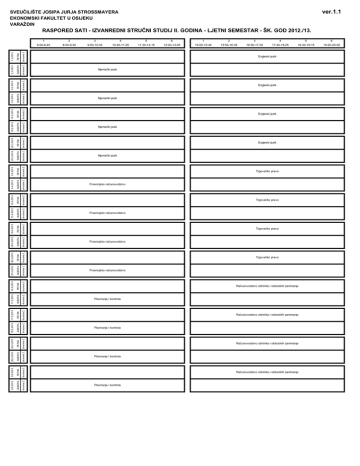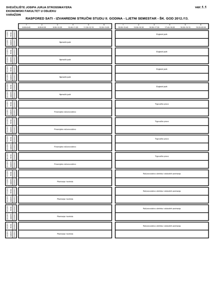 ver.1.1 SVEUČILIŠTE JOSIPA JURJA STROSSMAYERA EKONOMSKI FAKULTET U OSIJEKU VARAŽDIN PETAK dvorana 2. dvorana 2. dvorana 2. dvorana 2. dvorana 2. dvorana 2. dvorana 2. dvorana 2. dvorana 2. dvorana 2. dvorana 2. dvorana 2. dvorana 2. dvorana 2. dvorana 2. dvorana 2. dvorana 2. dvorana 2. dvorana 2. dvorana 2. dvorana 2. dvorana 2. dvorana 2. dvorana 2. 1.3.2013 PETAK PETAK SUBOTA PETAK SUBOTA PETAK PETAK SUBOTA PETAK SUBOTA PETAK SUBOTA PETAK SUBOTA PETAK SUBOTA PETAK SUBOTA PETAK 2.3.2013 8.3.2013 9.3.2013 SUBOTA 15.3.2013 16.3.2013 22.3.2013 23.3.2013 5.4.2013 6.4.2013 SUBOTA 12.4.2013 13.4.2013 19.4.2013 20.4.2013 26.4.2013 27.4.2013 10.5.2013 11.5.2013 17.5.2013 18.5.2013 24.5.2013 25.5.2013 8.6.2013 9.6.2013 SUBOTA SUBOTA RASPORED SATI - IZVANREDNI STRUČNI STUDIJ II. GODINA - LJETNI SEMESTAR - ŠK. GOD 2012./13. 1 2 3 4 5 6 1 2 3 4 5 6 8:00-8:45 8:50-9:35 9:50-10:35 10:40-11:25 11:30-12:15 12:20-13:05 15:00-15:45 15:50-16:35 16:50-17:35 17:40-18:25 18:30-19:15 19:20-20:05 Engleski jezik Njemački jezik ž Engleski jezik Njemački jezik Engleski jezik Njemački jezik Engleski jezik Njemački jezik Trgovačko pravo Financijsko računovodstvo Trgovačko pravo Financijsko računovodstvo Trgovačko pravo Financijsko računovodstvo Trgovačko pravo Financijsko računovodstvo Računovodstvo obrtnika i slobodnih zanimanja Planiranje i kontrola Računovodstvo obrtnika i slobodnih zanimanja Planiranje i kontrola Računovodstvo obrtnika i slobodnih zanimanja Planiranje i kontrola Računovodstvo obrtnika i slobodnih zanimanja Planiranje i kontrola