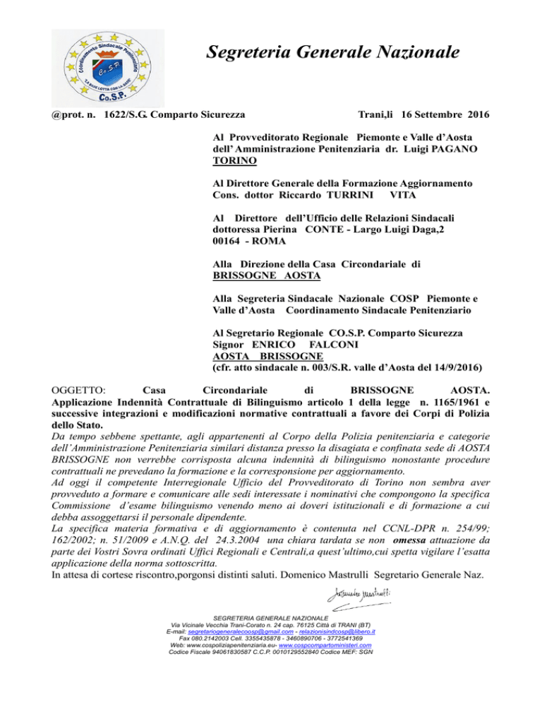 Segreteria Generale Nazionale @prot. n. 1622/S.G. Comparto Sicurezza Trani,li 16 Settembre 2016 Al Provveditorato Regionale Piemonte e Valle d’Aosta dell’ Amministrazione Penitenziaria dr. Luigi PAGANO TORINO Al Direttore Generale della Formazione Aggiornamento Cons. dottor Riccardo TURRINI VITA Al Direttore dell’Ufficio delle Relazioni Sindacali dottoressa Pierina CONTE - Largo Luigi Daga,2 00164 - ROMA Alla Direzione della Casa Circondariale di BRISSOGNE AOSTA Alla Segreteria Sindacale Nazionale COSP Piemonte e Valle d’Aosta Coordinamento Sindacale Penitenziario Al Segretario Regionale CO.S.P. Comparto Sicurezza Signor ENRICO FALCONI AOSTA BRISSOGNE (cfr. atto sindacale n. 003/S.R. valle d’Aosta del 14/9/2016) OGGETTO: Casa Circondariale di BRISSOGNE AOSTA. Applicazione Indennità Contrattuale di Bilinguismo articolo 1 della legge n. 1165/1961 e successive integrazioni e modificazioni normative contrattuali a favore dei Corpi di Polizia dello Stato. Da tempo sebbene spettante, agli appartenenti al Corpo della Polizia penitenziaria e categorie dell’Amministrazione Penitenziaria similari distanza presso la disagiata e confinata sede di AOSTA BRISSOGNE non verrebbe corrisposta alcuna indennità di bilinguismo nonostante procedure contrattuali ne prevedano la formazione e la corresponsione per aggiornamento. Ad oggi il competente Interregionale Ufficio del Provveditorato di Torino non sembra aver provveduto a formare e comunicare alle sedi interessate i nominativi che compongono la specifica Commissione d’esame bilinguismo venendo meno ai doveri istituzionali e di formazione a cui debba assoggettarsi il personale dipendente. La specifica materia formativa e di aggiornamento è contenuta nel CCNL-DPR n. 254/99; 162/2002; n. 51/2009 e A.N.Q. del 24.3.2004 una chiara tardata se non omessa attuazione da parte dei Vostri Sovra ordinati Uffici Regionali e Centrali,a quest’ultimo,cui spetta vigilare l’esatta applicazione della norma sottoscritta. In attesa di cortese riscontro,porgonsi distinti saluti. Domenico Mastrulli Segretario Generale Naz. SEGRETERIA GENERALE NAZIONALE Via Vicinale Vecchia Trani-Corato n. 24 cap. 76125 Città di TRANI (BT) E-mail: [email protected] - [email protected] Fax 080.2142003 Cell. 3355435878 - 3460890706 - 3772541369 Web: www.cospoliziapenitenziaria.eu- www.cospcompartoministeri.com Codice Fiscale 94061830587 C.C.P. 0010129552840 Codice MEF: SGN