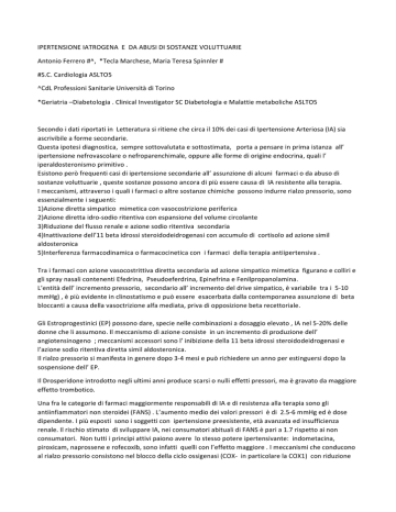 IPERTENSIONE IATROGENA E DA ABUSI DI SOSTANZE VOLUTTUARIE Antonio Ferrero #^, *Tecla Marchese, Maria Teresa Spinnler # #S.C. Cardiologia ASLTO5 ^CdL Professioni Sanitarie Università di Torino *Geriatria –Diabetologia . Clinical Investigator SC Diabetologia e Malattie metaboliche ASLTO5 Secondo i dati riportati in Letteratura si ritiene che circa il 10% dei casi di Ipertensione Arteriosa (IA) sia ascrivibile a forme secondarie. Questa ipotesi diagnostica, sempre sottovalutata e sottostimata, porta a pensare in prima istanza all’ ipertensione nefrovascolare o nefroparenchimale, oppure alle forme di origine endocrina, quali l’ iperaldosteronismo primitivo . Esistono però frequenti casi di ipertensione secondarie all’ assunzione di alcuni farmaci o da abuso di sostanze voluttuarie , queste sostanze possono ancora di più essere causa di IA resistente alla terapia. I meccanismi, attraverso i quali i farmaci o altre sostanze chimiche possono indurre rialzo pressorio, sono essenzialmente i seguenti: 1)Azione diretta simpatico mimetica con vasocostrizione periferica 2)Azione diretta idro-‐sodio ritentiva con espansione del volume circolante 3)Riduzione del flusso renale e azione sodio ritentiva secondaria 4)Inattivazione dell’11 beta idrossi steroidodeidrogenasi con accumulo di cortisolo ad azione simil aldosteronica 5)Interferenza farmacodinamica o farmacocinetica con i farmaci della terapia antiipertensiva . Tra i farmaci con azione vasocostrittiva diretta secondaria ad azione simpatico mimetica figurano e colliri e gli spray nasali contenenti Efedrina, Pseudoeferdrina, Epinefrina e Fenilpropanolamina. L’entità dell’ incremento pressorio, secondario all’ incremento del drive simpatico, è variabile tra i 5-‐10 mmHg) , è più evidente in clinostatismo e può essere esacerbata dalla contemporanea assunzione di beta bloccanti a causa della vasoctrizione alfa mediata, priva di opposizione beta recettoriale. Gli Estroprogestinici (EP) possono dare, specie nelle combinazioni a dosaggio elevato , IA nel 5-‐20% delle donne che li assumono. Il meccanismo dì azione consiste in un incremento di produzione dell’ angiotensinogeno ; meccanismi accessori sono l’ inibizione della 11 beta idrossi steroidodeidrogenasi e l’azione sodio ritentiva diretta simil aldosteronica. Il rialzo pressorio si manifesta in genere dopo 3-‐4 mesi e può richiedere un anno per estinguersi dopo la sospensione dell’ EP. Il Drosperidone introdotto negli ultimi anni produce scarsi o nulli effetti pressori, ma è gravato da maggiore effetto trombotico. Una fra le categorie di farmaci maggiormente responsabili di IA e di resistenza alla terapia sono gli antiinfiammatori non steroidei (FANS) . L’aumento medio dei valori pressori è di 2.5-‐6 mmHg ed è dose dipendente. I più esposti sono i soggetti con ipertensione preesistente, età avanzata ed insufficienza renale. Il rischio stimato di sviluppare IA, nei consumatori abituali di FANS è pari a 1.7 rispetto ai non consumatori. Non tutti i principi attivi paiono avere lo stesso potere ipertensivante: indometacina, piroxicam, naprossene e rofecoxib, sono infatti quelli con l’effetto maggiore . I meccanismi che conducono al rialzo pressorio consistono nel blocco della ciclo ossigenasi (COX-‐ in particolare la COX1) con riduzione della sintesi delle PG renali ad azione natriuretica e conseguente espansione di volume e vasocostrizione renale con riduzione della filtrazione glomerulare. Ulteriori effetti negativi sono legaati all’ aumentata sensibilità periferica all’ AII e all’ endotelina , al reset dei barocettori e, in maniera ancora più rilevante, l’ interferenza con i farmaci antiipertensivi, in particolare beta bloccanti , ACEI e ARB. I farmaci inibitori della COX-‐2 hanno effetti simili sulla PA ad eccezione del Celecoxib, ma sono , notoriamente associati ad un incremento di eventi CV. Altrettanto rilevanti sono l’IA e la resistenza alla terapia indotte dai Glicocorticoidi, secondarie all’ interazione con i recettori mineralcorticoidi e glicocorticoidi che induce sodio ritenzione ed espansione di volume , a saturazione dell’ enzima 11 beta idrossi steroidodeidrogenasi e da sovra-‐espressione del SRAA per aumento della sintesi dell’angiotensinogeno. L’incremento pressorio è pari a 15 mmHg , ha un’ incidenza del 20% circa e si manifesta anche con l’ impiego di preparati topici o spray. Anche molti farmaci antidepressivi hanno un’azione ipertensivante ( e spesso tachicardizzante); tra questi ,gli inibitori del reuptake della Serotonina (SRRI) ( fluoxetina, sertralina, paroxetina, venlafaxina) che attraverso un incremento del drive simpatico producono un innalzamento dose dipendente della PA che può raggiungere i 10 mmHg. Non sono innocui , dal punto di vista pressorio, i Triciclici che esercitano un blocco sul reuptake centrale delle catecolamine simile a quella della cocaina e gli inibitori della monoaminoossidasi (IMAO) che agiscono attraverso un rallentamento del metabolismo delle amine simpaticomimetiche . Ulteriori classi di farmaci, di impiego meno comune, responsabili di possibile IA sono la Ciclosporina che può produrre danno renale da inibizione della calcineurina, con aumento delle resistenze renali e sistemiche e sviluppo di ipertensione nel 40-‐70% dei soggetti trattati . Altri agenti immunosoppressori quali il Tacrolimus e soprattutto la rapamicina che non interagisce con la calcineurina, sembrano provocare scarsi effetti pressori. L’Eritropoietina,induce IA con un’ incidenza pari al 30-‐40% nei pazienti in trattamento,; il meccanismo risiede probabilmente nell’ aumento della viscosità ematica e vasocostrizione da disfunzione endoteliale conseguente a una sovra-‐produzione di endotelina. Tra i farmaci impiegati in Oncologia, alcuni anticorpi monoclonali e anti vascular growth factors ( Bevacizumab, Lapatinib, Sorafenib) inducono disfunzione endoteliale, un’ azione vasocostrittiva d
