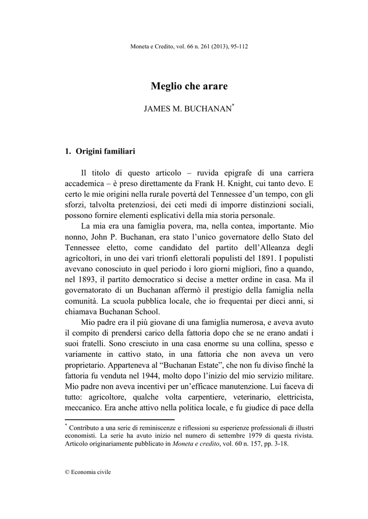 Moneta e Credito, vol. 66 n. 261 (2013), 95-112 Meglio che arare JAMES M. BUCHANAN* 1. Origini familiari Il titolo di questo articolo – ruvida epigrafe di una carriera accademica – è preso direttamente da Frank H. Knight, cui tanto devo. E certo le mie origini nella rurale povertà del Tennessee d’un tempo, con gli sforzi, talvolta pretenziosi, dei ceti medi di imporre distinzioni sociali, possono fornire elementi esplicativi della mia storia personale. La mia era una famiglia povera, ma, nella contea, importante. Mio nonno, John P. Buchanan, era stato l’unico governatore dello Stato del Tennessee eletto, come candidato del partito dell’Alleanza degli agricoltori, in uno dei vari trionfi elettorali populisti del 1891. I populisti avevano conosciuto in quel periodo i loro giorni migliori, fino a quando, nel 1893, il partito democratico si decise a metter ordine in casa. Ma il governatorato di un Buchanan affermò il prestigio della famiglia nella comunità. La scuola pubblica locale, che io frequentai per dieci anni, si chiamava Buchanan School. Mio padre era il più giovane di una famiglia numerosa, e aveva avuto il compito di prendersi carico della fattoria dopo che se ne erano andati i suoi fratelli. Sono cresciuto in una casa enorme su una collina, spesso e variamente in cattivo stato, in una fattoria che non aveva un vero proprietario. Apparteneva al “Buchanan Estate”, che non fu diviso finché la fattoria fu venduta nel 1944, molto dopo l’inizio del mio servizio militare. Mio padre non aveva incentivi per un’efficace manutenzione. Lui faceva di tutto: agricoltore, qualche volta carpentiere, veterinario, elettricista, meccanico. Era anche attivo nella politica locale, e fu giudice di pace della * Contributo a una serie di reminiscenze e riflessioni su esperienze professionali di illustri economisti. La serie ha avuto inizio nel numero di settembre 1979 di questa rivista. Articolo originariamente pubblicato in Moneta e credito, vol. 60 n. 157, pp. 3-18. © Economia civile 96 Moneta e Credito comunità durante la mia infanzia. Bell’uomo, un tempo buon atleta (due anni nella prima squadra di football dell’Università dell’Oklahoma), fornito di sottile umorismo, godeva delle simpatie femminili. Era dotato di un grande coraggio; ma non aveva pretese intellettuali. Mia madre era la migliore e più brillante ragazza di una famiglia di vice-sceriffi e predicatori presbiteriani appartenente all’incirca alla stessa classe sociale della famiglia di mio padre. Ambedue le famiglie, come era normale all’inizio del secolo nelle zone rurali del Tennessee, erano di origine scozzese-irlandese. Mia madre, Lila Scott, finita la scuola superiore, aveva studiato da insegnante, e successivamente insegnato per dieci anni, prima di incontrare mio padre. Era una donna di una curiosità intellettuale straordinaria; divorava qualsiasi cosa trovasse da leggere, senza distinzioni, con interessi che andavano dalla grammatica latina all’analisi matematica, ai western di Zane Grey. Anche lei assunse facilmente posizioni direttive nella comunità locale, organizzando l’associazione dei genitori della scuola e finendo con l’avere incarichi ufficiali a livello della contea e della regione. Ai fini di questo racconto, lei fu la mia insegnante in un senso che va ben oltre il ruolo di insegnante proprio di ogni madre. Mi fece avanzare di due classi grazie alle sue lezioni private, e mi aiutò nello studio durante gli anni del college. 2. Istruzione Fin da piccolo mi era stato assegnato il ruolo di successore del nonno. Dovevo diventare l’avvocato-politico, e la Vanderbilt University (facoltà di giurisprudenza) era predestinata ad essere l’ultimo gradino della mia istruzione. Ben presto la famiglia nutrì dubbi sulla mia personalità; non esibivo l’atteggiamento di esagerata estroversione richiesto a ogni aspirante politico. Ma il diritto rimase il mio obiettivo professionale, e venni addestrato a parlare in pubblico. La realtà economica distrusse questo sogno; la Vanderbilt era al di sopra delle nostre possibilità, stremate dalla Grande Depressione. Il Middle Tennesse State Teachers’ College, a Murfreesboro, era tutto quello che mi potevo permettere; potei così vivere a casa e guadagnare abbastanza per pagare Meglio che arare 97 tasse e libri col lavoro di mungitore, mattina e sera, per quattro anni. La mia istruzione al college fu non sistematica e disordinata. Non aveva i requisiti di un’educazione formale, ed era insufficiente in biologia, psicologia, storia, economia e altre materie. Ma fu arricchita dal mio venire esposto a Shakespeare, alla poesia moderna, alla matematica e alla fisica. Al termine degli studi avevo ottenuto la specializzazione in tre aree: matematica, letteratura inglese e scienze sociali, inclusa l’economia. Questi anni di college furono importanti per costruire la fiducia in me stesso; alla fine del secondo anno i miei risultati accademici erano i migliori del college; il ragazzo di campagna si era fatto valere di fronte ai ragazzi di città. Appena laureato, nel 1940, avevo di fronte tre scelte: insegnante a 65$ al mese; impiego in una banca di Nashville a 75$ al mese; e una fellowship in economia per 50$ al mese all’Università del Tennessee. La mia carriera di economista fu determinata dal prevalere della terza opzione e non dal mio desiderio di salvare il mondo. L’anno accademico 1940-1941 a Knoxville, Tennesse, mi aprì al mondo. Più che l’economia, durante quell’anno imparai in fatto di donne e whisky che, dopo tutto, sono parte importante dell’istruzione di ognuno. C’erano pochi buoni economisti nella facoltà, ma io subii l’influenza di un autentico studioso, un uomo le cui abitudini di lavoro forgiarono le mie. Charles P. White divenne il mio esempio di ricercatore in economia, che prendeva sul serio il suo compito e mi insegnò che, dopo tutto, c’è un elemento morale nell’impiego accademico. Fu lo stesso White che, no