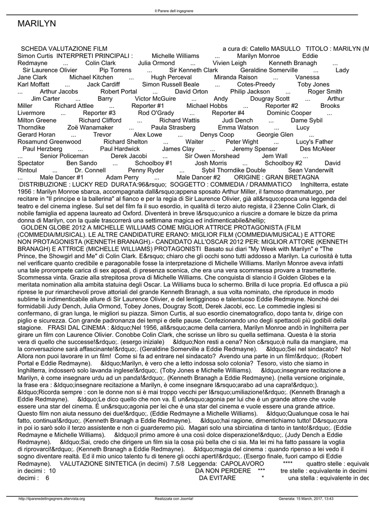 Il Parere dell ingegnere MARILYN SCHEDA VALUTAZIONE FILM a cura di: Catello MASULLO TITOLO : MARILYN (M Simon Curtis INTERPRETI PRINCIPALI : Michelle Williams ... Marilyn Monroe Eddie Redmayne ... Colin Clark Julia Ormond ... Vivien Leigh Kenneth Branagh ... Sir Laurence Olivier Pip Torrens ... Sir Kenneth Clark Geraldine Somerville ... Lady Jane Clark Michael Kitchen ... Hugh Perceval Miranda Raison ... Vanessa Karl Moffatt ... Jack Cardiff Simon Russell Beale ... Cotes-Preedy Toby Jones ... Arthur Jacobs Robert Portal ... David Orton Philip Jackson ... Roger Smith Jim Carter ... Barry Victor McGuire ... Andy Dougray Scott ... Arthur Miller Richard Attlee ... Reporter #1 Michael Hobbs ... Reporter #2 Brooks Livermore ... Reporter #3 Rod O'Grady ... Reporter #4 Dominic Cooper ... Milton Greene Richard Clifford ... Richard Wattis Judi Dench ... Dame Sybil Thorndike Zoë Wanamaker ... Paula Strasberg Emma Watson ... Lucy Gerard Horan ... Trevor Alex Lowe ... Denys Coop Georgie Glen ... Rosamund Greenwood Richard Shelton ... Waiter Peter Wight ... Lucy's Father Paul Herzberg ... Paul Hardwick James Clay ... Jeremy Spenser Des McAleer ... Senior Policeman Derek Jacobi ... Sir Owen Morshead Jem Wall ... Spectator Ben Sando ... Schoolboy #1 Josh Morris ... Schoolboy #2 David Rintoul ... Dr. Connell Penny Ryder ... Sybil Thorndike Double Sean Vanderwilt ... Male Dancer #1 Adam Perry ... Male Dancer #2 ORIGINE : GRAN BRETAGNA DISTRIBUZIONE : LUCKY RED DURATA:96’ SOGGETTO : COMMEDIA / DRAMMATICO Inghilterra, estate 1956 : Marilyn Monroe sbarca, accompagnata dall’appena sposato Arthur Miller, il famoso drammaturgo, per recitare in "Il principe e la ballerina" al fianco e per la regia di Sir Laurence Olivier, già all’epoca una leggenda del teatro e del cinema inglese. Sul set del film fa il suo esordio, in qualità di terzo aiuto regista, il 23enne Colin Clark, di nobile famiglia ed appena laureato ad Oxford. Diventerà in breve l’unico a riuscire a domare le bizze da prima donna di Marilyn, con la quale trascorrerà una settimana magica ed indimenticabile… GOLDEN GLOBE 2012 A MICHELLE WILLIAMS COME MIGLIOR ATTRICE PROTAGONISTA (FILM (COMMEDIA/MUSICAL). LE ALTRE CANDIDATURE ERANO: MIGLIOR FILM (COMMEDIA/MUSICAL) E ATTORE NON PROTAGONISTA (KENNETH BRANAGH).- CANDIDATO ALL'OSCAR 2012 PER: MIGLIOR ATTORE (KENNETH BRANAGH) E ATTRICE (MICHELLE WILLIAMS) PROTAGONISTI Basato sui diari "My Week with Marilyn" e "The Prince, the Showgirl and Me" di Colin Clark. E’ chiaro che gli occhi sono tutti addosso a Marilyn. La curiosità è tutta nel verificare quanto credibile e paragonabile fosse la interpretazione di Michelle Williams. Marilyn Monroe aveva infatti una tale prorompete carica di sex appeal, di presenza scenica, che era una vera scommessa provare a trasmetterle. Scommessa vinta. Grazie alla strepitosa prova di Michelle Williams. Che conquista di slancio il Golden Globes e la meritata nomination alla ambita statuina degli Oscar. La Williams buca lo schermo. Brilla di luce propria. Ed offusca a più riprese le pur rimarchevoli prove attoriali del grande Kenneth Branagh, a sua volta nominato, che riproduce in modo sublime la indimenticabile allure di Sir Laurence Olivier, e del lentigginoso e talentuoso Eddie Redmayne. Nonché dei formidabili Judy Dench, Julia Ormond, Tobey Jones, Dougray Scott, Derek Jacobi, ecc. Le commedie inglesi si confermano, di gran lunga, le migliori su piazza. Simon Curtis, al suo esordio cinematografico, dopo tanta tv, dirige con piglio e sicurezza. Con grande padronanza dei tempi e delle pause. Confezionando uno degli spettacoli più godibili della stagione. FRASI DAL CINEMA : “Nel 1956, all’acme della carriera, Marilyn Monroe andò in Inghilterra per girare un film con Laurence Olivier. Conobbe Colin Clark, che scrisse un libro su quella settimana. Questa è la storia vera di quello che successe!”. (esergo iniziale) “Non resti a cena? Non c’è nulla da mangiare, ma la conversazione sarà affascinante!”. (Geraldine Somerville a Eddie Redmayne). “Sei nel sindacato? No! Allora non puoi lavorare in un film! Come si fa ad entrare nel sindacato? Avendo una parte in un film!”. (Robert Portal e Eddie Redmayne). “Marilyn, è vero che a letto indossa solo colonia? Tesoro, visto che siamo in Inghilterra, indosserò solo lavanda inglese!”. (Toby Jones e Michelle Williams). “insegnare recitazione a Marilyn, è come insegnare urdu ad un panda!”. (Kenneth Branagh a Eddie Redmayne). (nella versione originale, la frase era : “insegnare recitazione a Marilyn, è come insegnare l’arabo ad una capra!”). “Ricorda sempre : con le donne non si è mai troppo vecchi per l’umiliazione!”. (Kenneth Branagh a Eddie Redmayne). “Le dico quello che non va. È un’agonia per lui che è un grande attore che vuole essere una star del cinema. È un’agonia per lei che è una star del cinema e vuole essere una grande attrice. Questo film non aiuta nessuno dei due!”. (Eddie Redmayne a Michelle Williams). “Qualunque cosa le hai fatto, continua!”. (Kenneth Branagh a Eddie Redmayne). “hai ragione, dimentichiamo tutto! D’ora in poi io sarò solo il terzo assistente e non ci guarderemo più. Magari solo una sbirciatina di tanto in tanto!”. (Eddie Redmayne e Michelle Williams). “il primo amore è una così dolce disperazione!”. (Judy Dench a Eddie Redmayne). “Sai, credo che dirigere un film sia la cosa più bella che ci sia. Ma lei mi ha fatto passare la voglia di riprovarci!”. (Kenneth Branagh a Eddie Redmayne). “magia del cinema : quando ripenso a lei vedo il sogno diventare realtà. Ed il mio unico talento fu di tenere gli occhi aperti!”. (Esergo finale, fuori campo di Eddie Redmayne). VALUTAZIONE SINTETICA (in decimi) 7.5/8 Leggenda: CAPOLAVORO **** quattro stelle : equivale in decimi : 10 DA NON PERDERE *** tre stelle : equivalente in decimi decimi : 6 DA EVITARE * una stella : equivalente in dec http://ilpareredellingegnere.altervista.or