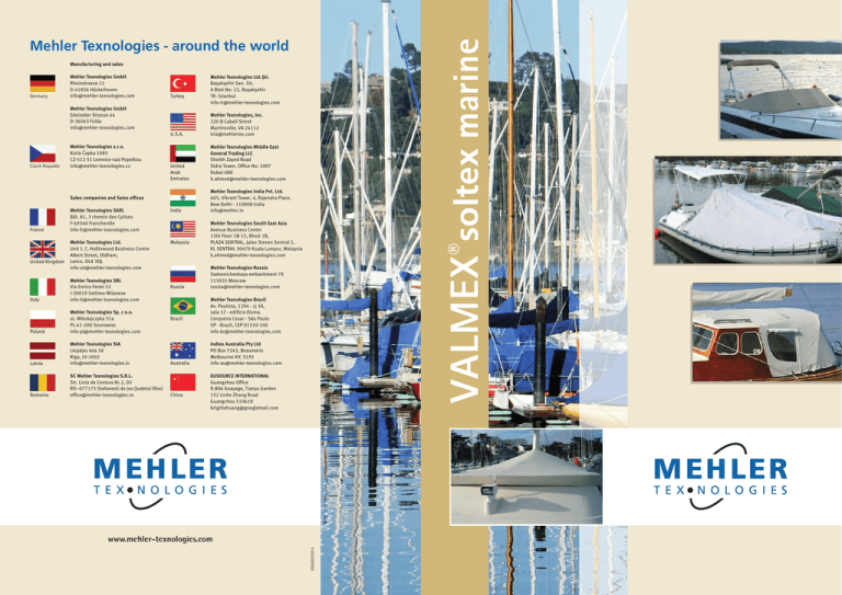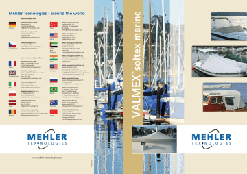 VALMEX soltex marine Mehler Texnologies - around the world Manufacturing and sales Mehler Texnologies GmbH Edelzeller Strasse 44 D-36043 Fulda [email protected] Czech Republic U.S.A. Mehler Texnologies, Inc. 220 B Cabell Street Martinsville, VA 24112 [email protected] United Arab Emirates Mehler Texnologies Middle East General Trading LLC Sheikh Zayed Road Sidra Tower, Office No: 1007 Dubai-UAE [email protected] Mehler Texnologies SARL Bât. A1, 3 chemin des Cytises F-69340 Francheville [email protected] India Mehler Texnologies India Pvt. Ltd. 605, Vikrant Tower, 4, Rajendra Place, New Delhi - 110008 India [email protected] Mehler Texnologies Ltd. Unit 1.7, Hollinwood Business Centre Albert Street, Oldham, Lancs. OL8 3QL [email protected] Malaysia Mehler Texnologies s.r.o. Karla Čapka 1085 CZ-512 51 Lomnice nad Popelkou [email protected] Sales companies and Sales offices France United Kingdom Italy Mehler Texnologies SRL Via Enrico Fermi 52 I-20019 Settimo Milanese [email protected] Poland Mehler Texnologies Sp. z o.o. ul. Mikołajczyka 31a PL-41-200 Sosnowiec [email protected] Latvia Mehler Texnologies SIA Liepājas iela 3d Rīga, LV-1002 [email protected] Romania SC Mehler Texnologies S.R.L. Str. Linia de Centura Nr.2, D2 RO–077175 Stefanesti de Jos (Judetul Ilfov) [email protected] Russia Brazil Australia China Mehler Texnologies South East Asia Avenue Business Center 15th Floor 1B-15, Block 1B, PLAZA SENTRAL, Jalan Stesen Sentral 5, KL SENTRAL 50470 Kuala Lumpur, Malaysia [email protected] ® Turkey Mehler Texnologies Ltd.Şti. Başakşehir San. Sit. A Blok No: 22, Başakşehir TR- İstanbul [email protected] Mehler Texnologies Russia Sadovnicheskaya embankment 79 115035 Moscow [email protected] Mehler Texnologies Brazil Av. Paulista, 1294 - cj 3A, sala 17 - edifício Eluma. Cerqueira Cesar - São Paulo SP - Brazil, CEP 01310-100 [email protected] Indtex Australia Pty Ltd PO Box 7243, Beaumaris Melbourne VIC 3193 [email protected] EUSOURCE INTERNATIONAL Guangzhou Office R.806 Goayage, Tianyu Garden 152 Linhe Zhong Road Guangzhou 510610 [email protected] www.mehler-texnologies.com V059/07/2014 Germany Mehler Texnologies GmbH Rheinstrasse 11 D-41836 Hückelhoven [email protected] VALMEX® soltex marine ist das Ergebnis konsequenter Weiterentwicklung der Produktlinien für Bootsausstattungen. Mit VALMEX® soltex marine bietet Mehler Texnologies eine leichte, PVC-beschichtete Qualität mit textilem Charakter, welche exzellente Fügeeigenschaften, wie Verschweißen und Nähen, bietet. Damit ist dieses Produkt die perfekte Ergänzung zur VALMEX® nautica und VALMEX® pacific-Produktpalette. VALMEX® soltex marine is the result of the consistent further development of product lines for boat equipment. With VALMEX® soltex marine, Mehler Texnologies offers light, PVC-coated quality with a textile character which offers excellent joining properties for welding and stitching, for example. This makes the product the perfect complement to the VALMEX® nautica and VALMEX® pacific product range. Anwendungen: Bimini-Verdeck, Cockpit-Plane, Sonnensegel, Wetterschutzsegel, Kuchenbude etc. Applications: Bimini tops, cockpit tarpaulins, sun shades, weather-protection covers, cockpit tents, etc. Einsatzzwecke: Sonnen- und Wetterschutz, Beschattung Purposes: Protection from sun and weather, shade Eigenschaften: • sehr geringes Flächengewicht von 360 g/m² • verschweißbar bei textil anmutender Oberflächentextur • einfach zu konfektionieren durch weichen Warenausfall und Knickunempfindlichkeit • witterungsbeständig durch ausgeklügelte Beschichtungsrezeptur • wasserdicht durch beidseitige Beschichtung • langlebig durch optimalen Schutz des Gewebes vor UV-Einwirkung • salzwasserbeständig • verletzungsunempfindlich durch optimale Gewebestärke • dimensionsstabil durch den Einsatz hochwertiger Garne • schmutzabweisend und pflegeleicht durch Acrylat basiertes Top-Finish • geringe Dochtwirkung durch spezielle Beschichtungstechnologie • pilzhemmend ausgerüstet • effektive Beschattung durch gezielte Pigmentierung Properties: • very low weight per unit area of 360 g/m² • capable of welding, yet with a textile-like surface texture • easy to manufacture thanks to soft behaviour of material and crack insensitiviness • weather-resistant thanks to a sophisticated coating formula • waterproof thanks to two-sided coating • durable thanks to the optimum protection of the fabric from UV radiation • resistant to salt water • damage-resistant thanks to optimum fabric strength • dimensionally stable thanks to the use of high-quality yarns • dirt-resistant and low-maintenance thanks to an acrylate-based top finish • low wicking thanks to special coating technology • finished fungus-retardant • provides effective shade thanks to targeted pigmentation VALMEX® soltex marine est le résultat du développement permanent de nouveaux produits pour l´équipement des bateaux. Avec VALMEX® soltex marine Mehler Texnologies offre une toile enduite PVC légère d´aspect textile avec d´excellentes qualités d´assemblage par soudures et coutures. Ainsi, ce tissu est le parfait complément de nos gammes VALMEX® nautica et VALMEX® pacific. VALMEX® soltex marine è il risultato di continui sviluppi della nostra linea di prodotti per il mondo della nautica. Con VALMEX® soltex marine Mehler Texnologies offre un prodotto spalmato in pvc dall’aspetto tessile, leggero, saldabile o cucibile, caratteristiche eccellenti e uniche che completano in modo perfetto la nostra gamma VALMEX® nautica e VALMEX® pacific. Applications: Biminis, tauds de cockpit, tauds de soleil, tauds de protection, fermetures de gouvernails etc Utilisation: Protection solaire, protection contre les intempéries, ombrage VALMEX® soltex marine Propriétés: • poids très faible: 360g/m² • soudable tout en conservant un aspect textile • souplesse et résistance aux pliures pour une confection aisé