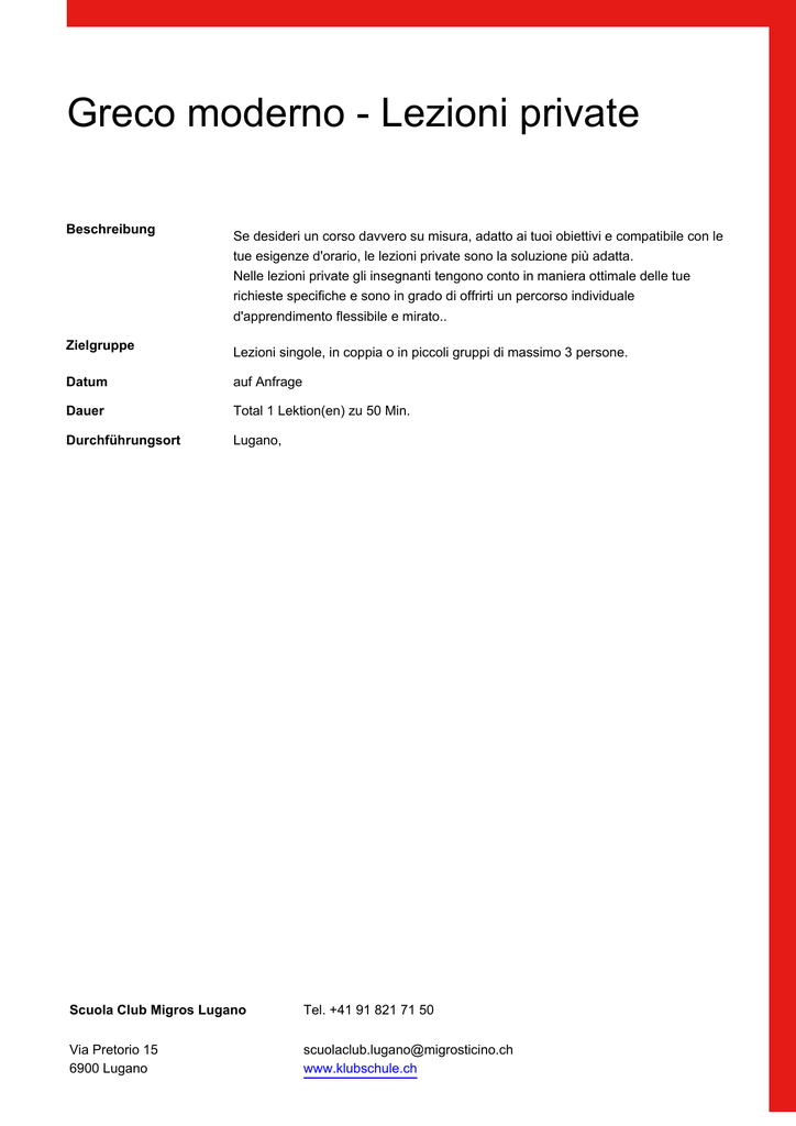 Greco moderno - Lezioni private Beschreibung Se desideri un corso davvero su misura, adatto ai tuoi obiettivi e compatibile con le tue esigenze d'orario, le lezioni private sono la soluzione più adatta. Nelle lezioni private gli insegnanti tengono conto in maniera ottimale delle tue richieste specifiche e sono in grado di offrirti un percorso individuale d'apprendimento flessibile e mirato.. Zielgruppe Lezioni singole, in coppia o in piccoli gruppi di massimo 3 persone. Datum auf Anfrage Dauer Total 1 Lektion(en) zu 50 Min. Durchführungsort Lugano, Scuola Club Migros Lugano l Tel. +41 91 821 71 50 Via Pretorio 15 6900 Lugano [email protected] www.klubschule.ch