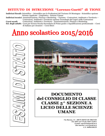 ISTITUTO DI ISTRUZIONE “Lorenzo Guetti” di TIONE Indirizzi liceali: Scientifico – Scientifico per le Professioni del Turismo Di Montagna - Scientifico opzione Scienze Applicate - Linguistico - Scienze Umane Indirizzi tecnici: Amministrazione, Finanza e Marketing – Turismo - Costruzioni, Ambiente e Territorio – Costruzioni, Ambiente e Territorio opzione Tecnologia del Legno nelle Costruzioni Corsi serali: Costruzioni, Ambiente e Territorio - Amministrazione, Finanza e Marketing Ed. degli adulti: Corsi per licenza Scuola Secondaria di Primo grado e riqualificazione professionale – Corsi di italiano per stranieri – Corsi liberi DOCUMENTO del CONSIGLIO DI CLASSE CLASSE 5^ SEZIONE A LICEO DELLE SCIENZE U M A NE Via Durone, 53 - 38079 TIONE DI TRENTO Tel. 0465-321735 fax 0465-322811 E-mail: [email protected] Sito internet: www.guetti.tn.it C.F. 86004180229 Documento finale del Consiglio di classe - Classe 5^ SUA - Anno scolastico 2015-16 SOMMARIO CONSIGLIO DI CLASSE p. 3 1. PRESENTAZIONE DELL’ISTITUTO 1.1 Il contesto e gli impegni della nostra scuola 1.2 Caratteristiche specifiche dell’indirizzo e profilo in uscita p. 4 p. 5 2. PRESENTAZIONE DELLA CLASSE 2.1 Profilo della classe 2.2 Quadro orario e relative docenze – Tabella A, Tabella B e C p. 6 p. 7 3. PERCORSO FORMATIVO 3.1 Organizzazione delle attività curricolari, extracurricolari ed integrative 3.2 Tipologia delle metodologie e degli strumenti didattici 3.3 Modalità di verifica utilizzate e numero di prove effettuate p. 9 p. 12 p. 12 4. CRITERI DI VALUTAZIONE DEL CREDITO SCOLASTICO E FORMATIVO 4.1 Simulazioni di terza prova 4.2 Valutazione del credito scolastico e formativo p. 13 p. 14 5. PROGRAMMA SVOLTO NELLE SINGOLE MATERIE 5.1 ITALIANO – Prof. Ezio Salvaterra 5.2 LATINO – Prof. Ezio Salvaterra 5.3 INGLESE – Prof.ssa Ilaria Morini 5.4 FILOSOFIA – Prof. Alberto Garniga 5.5 STORIA – Prof. Alberto Garniga 5.6 SCIENZE UMANE – Prof.ssa Laura Rossi 5.7 MATEMATICA – Prof. Carmelo Faraci 5.8 FISICA – Prof. Carmelo Faraci 5.9 SCIENZE NATURALI – Prof.ssa Daniela Cason/Nora Nicolli (CLIL) 5.10 STORIA DELL’ARTE – Prof.ssa Antonia Nardella 5.11 SCIENZE MOTORIE – Prof.ssa Laura Trojano 5.12 RELIGIONE – Prof.ssa Ida Pellegrini p. 16 p. 21 p. 24 p. 28 p. 36 p. 44 p. 50 p. 52 p. 54 p. 57 p. 61 p. 63 FIRME DEI COMPONENTI DEL CONSIGLIO DI CLASSE p. 64 FIRME DELLE STUDENTESSE p. 64 2 Documento finale del Consiglio di classe - Classe 5^ SUA - Anno scolastico 2015-16 CONSIGLIO DI CLASSE Dott.ssa Viviana SBARDELLA DIRIGENTE SCOLASTICO DOCENTI Prof. Ezio SALVATERRA ITALIANO e LATINO Prof.ssa Ilaria MORINI LINGUA INGLESE Prof. Alberto GARNIGA STORIA e FILOSOFIA Prof.ssa Laura ROSSI SCIENZE UMANE Prof. Carmelo FARACI MATEMATICA E FISICA Prof.ssa Daniela CASON SCIENZE NATURALI Prof.ssa Nora NICOLLI SCIENZE NATURALI (CLIL) Prof. Antonia NARDELLA DISEGNO e STORIA DELL’ARTE Prof.ssa Laura TROJANO EDUCAZIONE FISICA Prof.ssa Ida PELLEGRINI RELIGIONE RAPPRESENTANTI DELLE STUDENTESSE Lavezzari Anna Parolari Silvia 3 Documento finale del Consiglio di classe - Classe 5^ SUA - Anno scolastico 2015-16 1. PRESENTAZIONE DELL’ISTITUTO 1.1 Il contesto e gli impegni della nostra Scuola Gli studenti del nostro Istituto provengono dall’intero Comprensorio delle Giudicarie, un territorio molto esteso con numerosi piccoli centri distribuiti in quattro aree omogenee corrispondenti alla Busa di Tione, alle Giudicarie Esteriori, alla Val Rendena e alla Valle del Chiese. A Tione si concentrano i servizi e le attività del terziario in genere, la Val Rendena ha una spiccata vocazione turistica, nelle Giudicarie Esteriori sono fiorenti agricoltura e turismo, nella Valle del Chiese prevalgono l’industria e l’artigianato. Al di là di queste caratterizzazioni particolari, le Giudicarie tuttavia sono accomunate dall’essere terra di montagna sempre più aperta ed esposta agli influssi del mondo e alle trasformazioni sociali e culturali vertiginose degli ultimi decenni. Con i fenomeni grandiosi della globalizzazione, che nascondono insidie e ricchezza, questo territorio è chiamato, come gli altri, a fare i conti, interagendo con essi a partire dai suoi presidi forti che sono le famiglie e un tessuto associativo e istituzionale responsabile e capace di grandi sforzi di integrazione. Non è facile tuttavia rispondere a questa sfida che investe specialmente i giovani e di conseguenza la scuola, quella secondaria in particolar modo, che è il luogo di aggregazione e di confronto più ampio e dinamico della nostra comunità e la sede di incontro e di sintesi dei suoi sforzi formativi. L’istituto “Lorenzo Guetti” cerca di attivare un’offerta culturale all’altezza dei suoi compiti istituzionali e delle attese espresse dalla popolazione giudicariese. Ascoltando le esigenze e i progetti delle componenti sociali del territorio e utilizzando le risorse umane, tecniche, finanziarie e organizzative di cui dispone, ha elaborato un Progetto di Istituto orientato al raggiungimento di obiettivi legati ai bisogni e alle aspirazioni di giovani che vivono in un mondo di grandi opportunità, di diffuso benessere, ma anche di rischi più o meno percepiti nella loro realtà concreta. Si punta prima di tutto a formare persone aperte, che sappiano guardare oltre l’orizzonte delle nostre incantevoli montagne, che non cerchino rifugio in un benessere scontato quanto dimentico del passato e timoroso del futuro, persone che sappiano fruire dei vantaggi dell’oggi creando e ricreando uno sviluppo dalle radici solide e vigorose. A questi obiettivi ci si avvicina, come si è detto, con una articolata offerta culturale, prima di tutto attraverso i piani di studi dei diversi indirizzi e quindi attraverso una molteplicità organizzata di progetti di vario genere. Oggi lo sforzo principale della nostra, come di tutta la scuola, è di generare, dentro alla propria comunità, motivazione ad apprendere, ad assumere responsabilità, a capire che il destino d