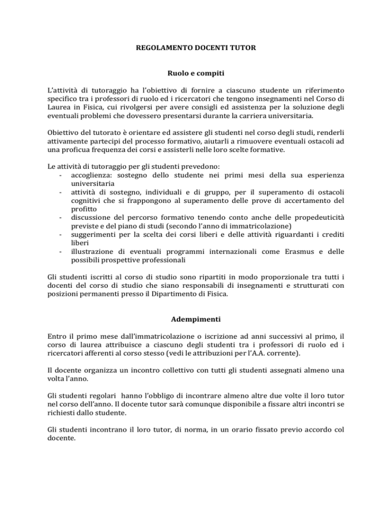 REGOLAMENTO DOCENTI TUTOR Ruolo e compiti L’attività di tutoraggio ha l’obiettivo di fornire a ciascuno studente un riferimento specifico tra i professori di ruolo ed i ricercatori che tengono insegnamenti nel Corso di Laurea in Fisica, cui rivolgersi per avere consigli ed assistenza per la soluzione degli eventuali problemi che dovessero presentarsi durante la carriera universitaria. Obiettivo del tutorato è orientare ed assistere gli studenti nel corso degli studi, renderli attivamente partecipi del processo formativo, aiutarli a rimuovere eventuali ostacoli ad una proficua frequenza dei corsi e assisterli nelle loro scelte formative. Le attività di tutoraggio per gli studenti prevedono: -‐ accoglienza: sostegno dello studente nei primi mesi della sua esperienza universitaria -‐ attività di sostegno, individuali e di gruppo, per il superamento di ostacoli cognitivi che si frappongono al superamento delle prove di accertamento del profitto -‐ discussione del percorso formativo tenendo conto anche delle propedeuticità previste e del piano di studi (secondo l’anno di immatricolazione) -‐ suggerimenti per la scelta dei corsi liberi e delle attività riguardanti i crediti liberi -‐ illustrazione di eventuali programmi internazionali come Erasmus e delle possibili prospettive professionali Gli studenti iscritti al corso di studio sono ripartiti in modo proporzionale tra tutti i docenti del corso di studio che siano responsabili di insegnamenti e strutturati con posizioni permanenti presso il Dipartimento di Fisica. Adempimenti Entro il primo mese dall’immatricolazione o iscrizione ad anni successivi al primo, il corso di laurea attribuisce a ciascuno degli studenti tra i professori di ruolo ed i ricercatori afferenti al corso stesso (vedi le attribuzioni per l’A.A. corrente). Il docente organizza un incontro collettivo con tutti gli studenti assegnati almeno una volta l’anno. Gli studenti regolari hanno l’obbligo di incontrare almeno altre due volte il loro tutor nel corso dell’anno. Il docente tutor sarà comunque disponibile a fissare altri incontri se richiesti dallo studente. Gli studenti incontrano il loro tutor, di norma, in un orario fissato previo accordo col docente. I docenti tutor sono designati dal Presidente del Corso di Laurea. Sono esclusi dall’obbligo di svolgere il ruolo di docente tutor i Colleghi che occupano le seguenti cariche istituzionali comunque dovute: • Direttore del Dipartimento di Fisica • Coordinatore CCS-‐Fisica • Coordinatore Scuola di Dottorato in Fisica