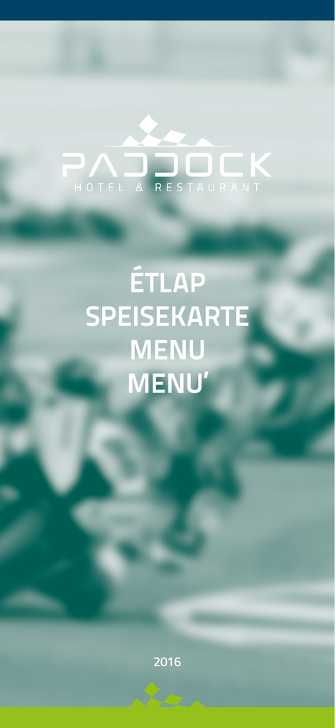 2016 Szobatípus és árak: Paddock egyágyas 12 180 Ft / szoba / éj Paddock kétágyas 17 400 Ft / szoba / éj Paddock háromágyas 23 490 Ft / szoba / éj IFA: 300 Ft / fő / éj A szobaár tartalmazza: svédasztalos reggeli, törölköző, internet, ÁFA. Zimmertyp und Preise: Paddock Einzelzimmer 42 EUR / Zimmer/ Nacht Paddock Zweibettzimmer 60 EUR/ Zimmer / Nacht Paddock Dreibettzimmer 81 EUR/ Zimmer / Nacht Kurtaxe : 1,10 EUR / Person / Nacht In diesem Preis sind: Frühstücksbuffet, Handtuch, Wi-Fi, Mwst. Room and prices: Paddock Single room 42 EUR / room / night Paddock Double room 60 EUR / room / night Paddock Triple room 81 EUR / room / night Tax: 1,10 EUR / person / night This price includes: Buffet breakfast, towel, Wi-Fi, VAT. H-9512 Ostffyasszonyfa, hrsz 0179 +36 20 360 76 42 [email protected] www.paddockring.com Az ételek és italok allergén tartalmára vonatkozó információt kérje a felszolgálótól! Den Allergengehalt der Speisen und Getränke können Sie bei den Kellnern erfragen! The allergen content of food and beverages can be obtained from the waiters! Reggelik • Frühstücken • Breakfasts • La colazione Büféreggeli • Frühstücksbüfett Buffet Breakfast • Buffet colazione 2175 7,50 Tatár beefsteak • Tataren beefsteak Beefsteak Tatar • Bistecca alla tartara 2060 7,10 Bruschetta • Bruschetta Bruschetta • Bruschetta 1335 4,60 Bazsalikomos mozzarella Mozzarella mit Basilikum gewürzt mit Tomaten Mozzarella with basil and tomato Mozzarella con basilico 1435 4,95 Újházy tyúkhúsleves Újházy Hühnersuppe Chicken soup a’la Újházy Brodo di gallina alla Újházy 1030 3,55 Fridattó leves Fritattensuppe Fridatto soup Consomme’ al fridatto (con tagliatelle di crepes) 870 3,00 Májgombócleves Leberknödelsuppe Liver dumpling soup Fegato zuppa gnocco 1030 3,55 Fokhagyma krémleves sonkachipssel Knoblauchcremesuppe mit Schinkenchips Garlic crem soup with ham chips Crema di aglio con crostini di speck 1030 3,55 Spagetti Carbonara • Spaghetti Carbonara Spaghetti carbonara • Spaghetti alla carbonara 1770 6,10 Bolognai spagetti • Spaghetti Bolognese Spaghetti bolognese • Spaghetti alla Bolognese 1915 6,60 Spagetti aglio olio • Spaghetti aglio olio Spaghetti aglio olio • Spaghetti aglio e olio 1770 6,10 Füstölt makrélás tagliatelle Tagliatelle mit geräucherter Makrele Tagliatelle with smoked mackerel Tagliatelle con sgombro affumicato 1915 6,60 Fogasfilé roston sült zöldséggel Zanderfilet vom Rost mit gebratene Gemüse Pike perch fillet with fried vegetables Filetto di dentice al forno con verdure al forno 2885 9,95 Fogasfilé roston pestoval, frisskevert salátával Zanderfilet vom Rost mit Pesto und gemischter Salat Pike fillet grilled with pesto and mixed salad Filetto di dentice alla griglia con pesto e insalata mista 2885 9,95 Rántott csirkemell hasábburgonyával Gebackene Hühnerbrust mit Pommes frites Fried chicken breast with french fries Petto di pollo impanato con patatine fritte 2380 8,20 Cordon Bleu rizzsel “Cordon Bleu” mit Reis ”Cordon Bleu” with rice “Cordon Bleu” con contorno di riso 2670 9,20 Csípős csirkeszárny hasábburgonyával Pikante Hühnerflügel mit Pommes frites Spicy chicken wings with french fries Ali di pollo piccanti con patate fritte 1915 6,60 Pármai sonkás csirkemell mozzarellával, friss kevert salátával Hühnerbrust in Parmaschinken mit Mozzarella und gemischter Salat Chicken breast in Parma ham with mozzarella and mixed salad Petto di pollo in prosciutto di Parma con mozzarella e insalata mista 2670 9,20 Rántott sertésborda hasábburgonyával Gebackener Schweineschnitzel mit Pommes frites Fried pork rib chop with French fries Cotoletta impanata con patatine fritte 2350 8,10 Szűzérmék zöldbors mártással, hasábburgonyával Jungfernmedallion vom Rost mit grüner Pfeffersauce und Pommes frites Pork medallions with green pepper sauce with French fries Medaglioni di maiale al pepe verde con patatine fritte 2985 10,30 Szűzérmék erdei gombamártással, burgonyakrokettel Jungfernmedallion vom Rost mit Waldpilzsosse und Kartoffelkroketten Pork medallions with forest mushroom sauce and Potato Croquettes Medaglioni di maiale Foresta salsa di funghi con Crocchette di patate 2985 10,30 Szűzérmék zöldfűszeres sajtmártással, burgonyakrokettel Jungfernmedallion vom Rost mit Grüngewürz-Käsesauce und Kartoffelkroketten Pork medallions with green spice cheese sauce and Potato Croquettes Medaglioni di maiale con verde spice salsa di formaggio e Crocchette di patate 2985 10,30 Bélszín zöldfűszeres sajtmártással, rizzsel Beefsteak mit Grüngewürz-Käsesauce und Reis Beefsteak with green spice cheese sauce and rice Bistecca con verde spice salsa di formaggio e riso 5160 17,80 Bélszín hagymával, hasábburgonyával Beefsteak mit gebratener Zwiebel und Pommes frites Beefsteak with baked onion and French fries Bistecca di manzo con cippola fritta e patatine fritte 5160 17,80 Bélszín zöldbors mártással, rizzsel Beefsteak mit grüner Pfeffersauce und Reis Beefsteak with green pepper sauce and rice Bistecca al pepe verde con riso 5160 17,80 Bélszín tükörtojással, hasábburgonyával Beefsteak mit Spiegelei und Pommes frites Beefsteak with fried egg and French fries Bistecca alla Bismarck con patatine fritte 5160 17,80 Camembert magvas bundában, rizzsel és áfonyával Gebackener Camembert im Kernschlafrock mit Reis und Preiselbeeren Fried Camembert in sesame coat with rice and cranberries Camembert impanato ai semi di sesamo con riso e mirtilli rossi 1915 6,60 Bélszín csíkok balzsamikóval, salátaágyon Lendenbraten Streifen mit Balsamico auf Salatplatte Beef strip steak with basil on salad bed Tagliata di bistecca al balsamico su letto di insalata 2985 10,30 Fenyőmagvas csirkemell parmezánnal, salátával Hühnerbrust mit Kieferkerne, Parmezankäse und Salat Chicken breast with pine nuts, parmesan and salad bed Petto di pollo con pinoli, parmigiano e i