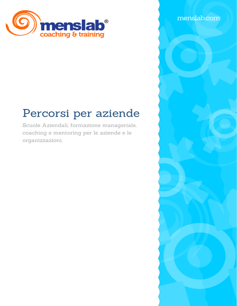 Percorsi per Aziende I programmi di formazione al coaching, al mentoring e alla leadership Percorsi per aziende Scuole Aziendali, formazione manageriale, coaching e mentoring per le aziende e le organizzazioni. Percorsi per aziende Percorsi per aziende Desideri che i tuoi investimenti in coaching e formazione producano risultati concreti? Vuoi che la tua azienda benefici di programmi innovativi ed efficaci? Cerchi coach e trainer di reale esperienza che possano aiutarti a fare la differenza sul mercato? I programmi di formazione manageriale e coaching per le aziende e le organizzazioni di menslab – il laboratorio della mente - sono tesi a produrre risultati concreti utilizzando gli approcci più efficaci che consentono di ottimizzare gli investimenti e sviluppare, con gli strumenti più idonei, le risorse ed i team aziendali. Ogni percorso è stato pensato, testato e perfezionato per garantire lo sviluppo di specifiche competenze e per accompagnare coloro che lo frequentano ad un reale utilizzo delle stesse, promuovendo responsabilità, collaborazione e motivazione. Le nostre aree di eccellenza: FORMAZIONE MANAGERIALE SCUOLE AZIENDALI COACHING E MENTORING Ver. 00.docx. 2 Percorsi per aziende Formazione manageriale Quali sono le competenze che permettono a un manager di essere una guida ed un modello per il suo team? Come si può misurare la reale efficacia degli investimenti formativi? La formazione di menslab per le aziende e le organizzazioni è costantemente perfezionata grazie al lavoro del team di progettazione e ai feedback dei nostri clienti. Il nostro credo è offrire solo corsi di formazione manageriale e professionale che realmente servono e producono risultati. Numerosi approcci, quali il coaching, la precisione linguistica e la sistemica, rese semplici e concrete sono alla base dei nostri corsi di formazione. Le aziende possono beneficiare di programmi realizzati all’interno dell’organizzazione o possono scegliere di formare i loro manager in programmi interaziendali, promuovendo, in questo modo, il confronto, la visione di insieme e lo sviluppo del network Le nostre aree di eccellenza sono: COACHING PER I LEADER Un corso di coaching destinato ai manager e a coloro che gestiscono risorse. La formazione consente di imparare ad usare le competenze di coaching durante la normale attività gestionale quotidiana e fornendo strumenti pratici utili a sviluppare la responsabilità e l’autonomia dei collaboratori. MENTORING AZIENDALE Un programma formativo sviluppato per valorizzare l’esperienza delle risorse interne aziendali e per gestire e trasformare in una grande opportunità il fenomeno dell’aging, diffondendo i valori e la cultura aziendale e preservando il know how distintivo dell’organizzazione. COMUNICAZIONE STRATEGICA Si tratta di corsi di formazione per imparare le più evolute metodologie e tecniche comunicative che consentono di creare un’immediata relazione positiva e produttiva con gli interlocutori. Ver. 00.docx. 3 Percorsi per aziende PUBLIC SPEAKING – INSPIRING PRESENTATIONS I percorsi che consentono di sviluppare la propria abilità e sicurezza nel parlare in pubblico, gestire riunioni di lavoro, presentare i propri lavori ai meeting aziendali. I corsi sono orientati allo sviluppo delle tecniche e delle strategie di public speaking e alla valorizzazione delle qualità individuali, per rendere le presentazioni fonte di ispirazione e motivazione per il pubblico. FORMAZIONE PERSONALIZZATA Sono i programmi di formazione manageriale innovativi sviluppati dal nostro team internazionale per accompagnare le aziende e le organizzazioni nei loro programmi di sviluppo. Ver. 00.docx. 4 Percorsi per aziende Scuole aziendali Che benefici si possono ottenere con programmi di sviluppo professionale costruiti totalmente sulla cultura e sulle sfide della tua organizzazione? In che modo è possibile ottimizzare gli investimenti sviluppando un know–how che rimane di proprietà della tua azienda? Quali vantaggi si possono ottenere rendendo disponibile in modo concreto le migliori competenze presenti in azienda? Le scuole aziendali progettate secondo le più efficaci e sperimentate metodologie di formazione, coaching e mentoring consentono alle organizzazioni che decidono di investire sullo sviluppo professionale dei loro collaboratori di ottenere risultati concreti, misurabili e coerenti con la cultura e gli obiettivi di sviluppo dell’impresa. Il nostro team internazionale progetta e gestisce l’avvio e l’evoluzione delle scuole interne aziendali offrendo: Studio e progettazione dei programmi formativi strategici per l’evoluzione dell’organizzazione Formazione formatori aziendali, da coinvolgere nei programmi didattici Formazione con i maggiori esperti del settore, per promuovere l’innovazione e l’efficacia Coaching e mentoring, per concretizzare i risultati formativi e promuovere l’autonomia La partnership con Menslab consente di attivare una scuola interna all’organizzazione partendo da zero o di arricchire le scuole aziendali già esistenti con metodologie e programmi innovativi e di eccellenza. Il nostro team è un riferimento per: FORMAZIONE DEI COACH, ANCHE ATTRAVERSO PROGRAMMI ACCREDITATI A LIVELLO INTERNAZIONALE SVILUPPO DEI LEADER, ATTRAVERSO PROGRAMMI CHE STIMOLANO LA VISIONE STRATEGICA E LA CAPACITÀ DI ISPIRARE E MOTIVARE CULTURA DELL’INNOVAZIONE, PER GENERARE CAMBIAMENTI EVOLUTIVI E FACILITARE LA PROATTIVITÀ Ver. 00.docx. 5 Percorsi per aziende FORMAZIONE DI MENTOR AZIENDALI, PER RENDERE DISPONIBILI LE COMPETENZE STRATEGICHE DELLE RISORSE PIÙ ESPERTE ESPRESSIONE DEI TALENTI, CON PROGRAMMI CHE L’ARRICCHIMENTO DELLE ATTITUDINI INDIVIDUALI CONSENTONO LA SPERIMENTAZIONE E Tutti i programmi delle scuole aziendali possono essere realizzati avvalendosi di collaboratori interni e di consulenti, coach e formatori che operano a livello internazionale. Ver. 00.docx. 6 Percorsi per aziende Coaching e mentoring Quali sono gli approcci che perm