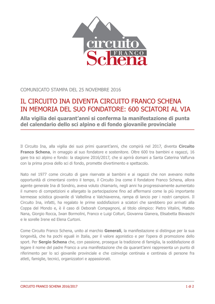 ! ! ! ! ! ! ! ! ! ! ! ! ! COMUNICATO STAMPA DEL 25 NOVEMBRE 2016 ! IL CIRCUITO INA DIVENTA CIRCUITO FRANCO SCHENA IN ! MEMORIA DEL SUO FONDATORE: 600 SCIATORI AL VIA Alla vigilia dei quarant’anni si conferma la manifestazione di punta del calendario dello sci alpino e di fondo giovanile provinciale ! ! ! Il Circuito Ina, alla vigilia dei suoi primi quarant’anni, che compirà nel 2017, diventa Circuito Franco Schena, in omaggio al suo fondatore e sostenitore. Oltre 600 tra bambini e ragazzi, 16 gare tra sci alpino e fondo: la stagione 2016/2017, che si aprirà domani a Santa Caterina Valfurva con la prima prova dello sci di fondo, promette divertimento e spettacolo. ! Nato nel 1977 come circuito di gare riservate ai bambini e ai ragazzi che non avevano molte opportunità di cimentarsi contro il tempo, il Circuito Ina come il fondatore Franco Schena, allora agente generale Ina di Sondrio, aveva voluto chiamarlo, negli anni ha progressivamente aumentato il numero di competizioni e allargato la partecipazione fino ad affermarsi come la più importante kermesse sciistica giovanile di Valtellina e Valchiavenna, rampa di lancio per i nostri campioni. Il Circuito Ina, infatti, ha regalato le prime soddisfazioni a sciatori che sarebbero poi arrivati alla Coppa del Mondo e, è il caso di Deborah Compagnoni, al titolo olimpico: Pietro Vitalini, Matteo Nana, Giorgio Rocca, Iwan Bormolini, Franco e Luigi Colturi, Giovanna Gianera, Elisabetta Biavaschi e le sorelle Irene ed Elena Curtoni. ! Come Circuito Franco Schena, unito al marchio Generali, la manifestazione si distingue per la sua longevità, che ha pochi eguali in Italia, per il valore agonistico e per l’opera di promozione dello sport. Per Sergio Schena che, con passione, prosegue la tradizione di famiglia, la soddisfazione di legare il nome del padre Franco a una manifestazione che da quarant’anni rappresenta un punto di riferimento per lo sci giovanile provinciale e che coinvolge centinaia e centinaia di persone fra atleti, famiglie, tecnici, organizzatori e appassionati. ! ! ! CIRCUITO FRANCO SCHENA 2016/2017 !1 di 2 ! Quattro le gare per lo sci di fondo, aperte alle categorie da baby sprint a allievi, dagli 8 ai 16 anni, con il coinvolgimento di circa 150 atleti tesserati per i cinque sci club della provincia di Sondrio impegnati in questa disciplina: Sci Club Valmalenco, C.A.I. Tirano, Polisportiva Le Prese, Sci Club Alta Valtellina e Sporting Livigno. Dopo la prima gara di Santa Caterina si proseguirà il 18 dicembre a Livigno con le gare individuali a tecnica classica, il 14 gennaio a Lanzada con la gimcana a tecnica libera per concludere il 5 febbraio a Trivigno con il Mass Start a tecnica libera. ! Nel frattempo, con il 2017, concluse le festività natalizie, inizieranno le gare dello sci alpino, 12 in totale, divise tra slalom speciale, gigante e super G, che coinvolgeranno circa 450 sciatori delle categorie cuccioli, baby, allievi e ragazzi e che si svolgeranno a Livigno, Bormio, Aprica, Madesimo, Santa Caterina e Chiesa in Valmalenco. Da circa 15 anni, le singole competizioni del circuito sono valide per la partecipazione degli atleti ai campionati regionali di sci alpino della Fisi: in ogni gara vengono assegnati punti ai primi 30 classificati con 100 al primo, 80 al secondo, 60 al terzo e così via fino a 1 punto per il trentesimo. Per la selezione si considerano i tre migliori punteggi ottenuti nelle diverse gare. ! ! ! ! ! ! ! ! ! ! ! ! ! ! ! ! ! ! ! ! ! ! ! ! ! CIRCUITO FRANCO SCHENA 2016/2017 !2 di 2 !