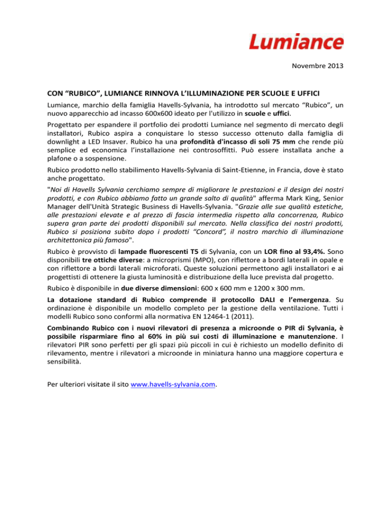 Novembre 2013 CON “RUBICO”, LUMIANCE RINNOVA L’ILLUMINAZIONE PER SCUOLE E UFFICI Lumiance, marchio della famiglia Havells-Sylvania, ha introdotto sul mercato “Rubico”, un nuovo apparecchio ad incasso 600x600 ideato per l'utilizzo in scuole e uffici. Progettato per espandere il portfolio dei prodotti Lumiance nel segmento di mercato degli installatori, Rubico aspira a conquistare lo stesso successo ottenuto dalla famiglia di downlight a LED Insaver. Rubico ha una profondità d'incasso di soli 75 mm che rende più semplice ed economica l’installazione nei controsoffitti. Può essere installata anche a plafone o a sospensione. Rubico prodotto nello stabilimento Havells-Sylvania di Saint-Etienne, in Francia, dove è stato anche progettato. "Noi di Havells Sylvania cerchiamo sempre di migliorare le prestazioni e il design dei nostri prodotti, e con Rubico abbiamo fatto un grande salto di qualità" afferma Mark King, Senior Manager dell'Unità Strategic Business di Havells-Sylvania. "Grazie alle sue qualità estetiche, alle prestazioni elevate e al prezzo di fascia intermedia rispetto alla concorrenza, Rubico supera gran parte dei prodotti disponibili sul mercato. Nella classifica dei nostri prodotti, Rubico si posiziona subito dopo i prodotti “Concord”, il nostro marchio di illuminazione architettonica più famoso". Rubico è provvisto di lampade fluorescenti T5 di Sylvania, con un LOR fino al 93,4%. Sono disponibili tre ottiche diverse: a microprismi (MPO), con riflettore a bordi laterali in opale e con riflettore a bordi laterali microforati. Queste soluzioni permettono agli installatori e ai progettisti di ottenere la giusta luminosità e distribuzione della luce prevista dal progetto. Rubico è disponibile in due diverse dimensioni: 600 x 600 mm e 1200 x 300 mm. La dotazione standard di Rubico comprende il protocollo DALI e l’emergenza. Su ordinazione è disponibile un modello completo per la gestione della ventilazione. Tutti i modelli Rubico sono conformi alla normativa EN 12464-1 (2011). Combinando Rubico con i nuovi rilevatori di presenza a microonde o PIR di Sylvania, è possibile risparmiare fino al 60% in più sui costi di illuminazione e manutenzione. I rilevatori PIR sono perfetti per gli spazi più piccoli in cui è richiesto un modello definito di rilevamento, mentre i rilevatori a microonde in miniatura hanno una maggiore copertura e sensibilità. Per ulteriori visitate il sito www.havells-sylvania.com. Apparecchi di illuminazione Lumiance di Havells-Sylvania Il marchio Lumiance, fondato nei Paesi Bassi nel lontano 1934, e oggi proprietà di Havells-Sylvania, è sinonimo di “facilità di installazione”, caratteristica che insieme al design senza tempo e all’elevata funzionalità e sicurezza dei suoi prodotti ne fa uno dei marchi più richiesti da installatori e contractors. L’ampia gamma di lampade Lumiance, costituita prevalentemente da faretti ed incassi, è studiata per applicazioni professionali in ogni ambiente contract, come negozi, uffici, aree commerciali e residenziali, hotel e ristoranti. La costante rielaborazione dei propri prodotti, l’integrazione delle ultime novità tecnologiche e la profonda conoscenza delle esigenze dell’architettura moderna, ha portato ad ampliare alcune gamme di prodotti storicamente conosciute per la loro efficienza e funzionalità. Così per esempio la gamma di faretti INSAVER, tra le più complete e performanti del mercato, viene oggi proposta con grande successo in 3 nuove varianti a LED di diverse dimensioni e prestazioni. L’alta qualità della tecnologia LED utilizzata garantisce bassi consumi energetici, elevati indici di resa cromatica, basse temperature di funzionamento e flussi luminosi ottimizzati per rispondere alle normative esistenti ma soprattutto per avere ambienti gradevoli e ben illuminati. www.lumiance.com HAVELLS-SYLVANIA ITALIA Via Don Enrico Mapelli 75 - 20099 Sesto San Giovanni MI - T +39 02 24125811 – [email protected] www.havells-sylvania.com Contatti per la stampa Damiani Communication - Gaia Damiani – mob. + 39 347 5129797 - [email protected] www.damianicommunication.it