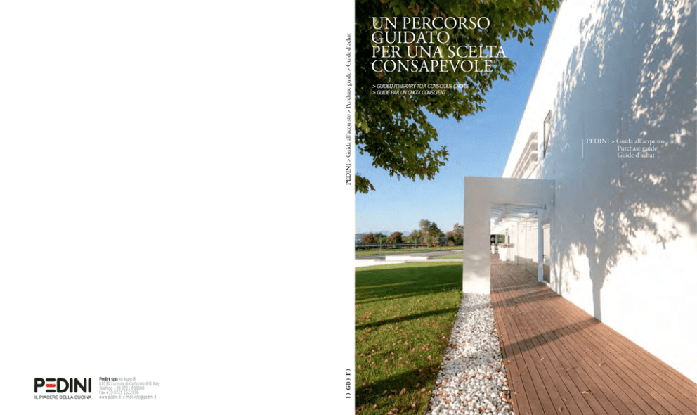 PEDINI > Guida all’acquisto > Purchase guide > Guide d’achat I ) GB ) F ) IL PIACERE DELLA CUCINA Pedini spa via Aspio 8 61030 Lucrezia di Cartoceto (PU) Italy Telefono +39 0721 899988 Fax +39 0721 1622096 www.pedini.it e-mail:[email protected] UN PERCORSO GUIDATO PER UNA SCELTA CONSAPEVOLE > GUIDED ITINERARY TO A CONSCIOUS CHOICE > GUIDÉ PAR UN CHOIX CONSCIENT PEDINI > Guida all’acquisto Purchase guide Guide d’achat 1 ) inunaprogress. storia italiana Protagonista di una storia imprenditoriale di successo. Ricerca e sviluppo, progettazione e design, tecnologie produttive, supply chain management, certificazioni di qualità, servizi commerciali... sono questi i temi sui quali l’azienda lavora da sempre assieme a collaudate collaborazioni esterne, senza dimenticare il fattore umano e professionale che si esprime nell’originalità del prodotto e nell’impegno alla sua evoluzione. In sintesi, l’azienda, persegue la qualità e la ricerca, più che la quantità. A tutto questo fa leva il valore aggiunto del Made in Italy e il concetto di brand, da sempre riconosciuto ai prodotti Pedini. An Italian history in progress. Une histoire italienne en cours. Made in Italy 100% Certificate PEDINI È UN MARCHIO CERTIFICATO AVENTE I REQUISITI DEL SISTEMA IT01 100% QUALITÀ ORIGINALE ITALIANA acts according to system IT01 100% Original Italian Quality The protagonist of a story of entrepreneurial success. Research and development, engineering and design, manufacturing technology, supply chain management, quality certification, business services ... these are the issues on which the company has always worked together with proven external collaborations, without forgetting the human and professional factor which is expressed in the originality of the product and commitment to its evolution. In brief, the company pursues quality and research, rather than the quantity. All this builds the added value of Made in Italy and the concept of brand which has always been granted to Pedini products. Le protagoniste de l'histoire et de la réussite en entreprise. La recherche et le développement, l'ingénierie et la conception, la technologie de fabrication, la gestion de la chaîne d’approvisionnement, la certification de la qualité, les services commerciaux ... sont les points essentiels sur lesquelles la société a toujours travaillé s’appuyant sur des collaborations externes éprouvées, sans oublier le facteur humain et professionnel qui s’exprime dans l'originalité du produit et dans l'engagement de son évolution. En résumé, la société poursuit la qualité et la recherche, plutôt que le quantitatif. Tout cela crée de la valeur ajoutée au Made in Italie et au prestige de la marque, qui a toujours été accordé aux produits Pedini. Pedini > nelle colline marchigiane. > A POCHI PASSI DA LUOGHI RICCHI DI STORIA, IN QUESTO ANGOLO DELLE MARCHE, DOVE LE GENTI SONO STATE CAPACI DI VIVERE IN ARMONIA ED IN PERFETTO EQUILIBRIO CON QUELLA CHE POSSIAMO DEFINIRE LA STORIA POST-RURALE ED INDUSTRIALE ITALIANA, LA PEDINI, HA SAPUTO CONIUGARE LA SECOLARE SAPIENZA CONTADINA E LA MAESTRIA DEI SUOI ARTIGIANI CON LE PIÙ MODERNE TECNOLOGIE, RIUSCENDO COSÍ A PRODURRE CUCINE DALL’ESTETICA UNICA E DALLE QUALITÀ INSUPERABILI. > PEDINI, MARCHE HILLS. WITHIN WALKING DISTANCE TO PLACES RICH IN HISTORY, IN THIS CORNER OF THE MARCHE WHERE PEOPLE WERE ABLE TO LIVE IN HARMONY AND IN PERFECT BALANCE WITH WHAT WE MIGHT CALL THE HISTORY OF POST-INDUSTRIAL AND RURAL ITALY, PEDINI HAS MANAGED TO COMBINE THE CENTURIES-OLD PEASANT WISDOM AND SKILL OF ITS CRAFTSMEN WITH THE LATEST TECHNOLOGY, BEING ABLE TO PRODUCE KITCHENS AESTHETICALLY UNIQUE AND UNSURPASSED IN QUALITY. > PEDINI, SITUÉ AU CŒUR DES COLLINES DE LA RÉGION MARCHE.PROCHE DE LIEUX RICHES EN HISTOIRE, DANS CETTE RÉGION MARCHE, OÙ LES GENS ÉTAIENT CAPABLES DE VIVRE EN HARMONIE ET EN ÉQUILIBRE PARFAIT AVEC CE QU'ON POURRAIT APPELER L'HISTOIRE POST-INDUSTRIEL ET RURAL ITALIEN, PEDINI A RÉUSSI À AJUSTER LA SÉCULAIRE SAGESSE PAYSANNE ET L'HABILETÉ DE SES ARTISANS AVEC LES DERNIÈRES TECHNOLOGIES, AFIN D'ÊTRE EN MESURE DE PRODUIRE DES CUISINES DE QUALITÉ, D’UNE ESTHÉTIQUE UNIQUE ET INÉGALÉE. 2 ) un progettto articolato in continua evoluzione. An articulated project in continuous evolution. Un projet articulé en constante évolution. Rifondata nel 1992 Pedini rappresenta l’evoluzione, in chiave industriale, di un’impresa artigiana nata nel 1957. Al centro di oltre 40.000 metri quadri di superficie di proprietà, circondata dal verde dove il mattino presto non di rado capita di vedere alcuni daini al pascolo, sorge il moderno stabilimento della Pedini, un concentrato di artigianalità e sofisticate tecnologie, il giusto mix fra l’esperienza di mastri artigiani e la precisione millimetrica di macchinari all’avanguardia, che consentono di raggiungere un livello qualitativo curato nei minimi dettagli. Con a disposizione attuali sistemi informatici e la consumata esperienza di capaci architetti, vengono continuamente sviluppati nuovi progetti che consentono di presentarsi sempre con una nuova veste ai sempre più esigenti mercati internazionali. Re-founded in 1992 Pedini represents the evolution in industrial key of an artisan business born in 1957. In the middle of more than 40,000 square meters of property, surrounded by greenery is the modern factory of Pedini, a blend of craftsmanship and modern technology, the right mix between the experience of master craftsmen and the pinpoint precision of modern machinery, which allow you to reach a level of quality attention to detail. Thanks to current IT systems and the consummate experience of skilled architects, new projects are continuously developed presenting themselves with a new look to the increasingly demanding international markets. IL “CAMPUS” PEDINI 17.000 m2 la superficie totale dell’unità produttiva integrata nel territorio rispettando le qualità naturali e paesaggistiche.