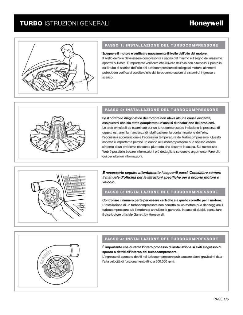 TURBO ISTRUZIONI GENERALI PAS S O 1: I N S TALLAZ I ON E DEL T U R B OCOMPR E SSO RE Spegnere il motore e verificare nuovamente il livello dell’olio del motore. Il livello dell’olio deve essere compreso tra il segno del minimo e il segno del massimo riportati sull’asta. È importante verificare che il livello dell’olio non oltrepassi il punto in cui il tubo di scarico dell’olio del turbocompressore si collega al motore, altrimenti potrebbero verificarsi perdite d’olio dal turbocompressore ai sistemi di ingresso e scarico. PAS S O 2: I N S TALLAZ I ON E DEL T U R B OCOMPR E SSO RE Se il controllo diagnostico del motore non rileva alcuna causa evidente, assicurarsi che sia stata completata un’analisi di risoluzione dei problemi. Le aree principali da esaminare per un turbocompressore includono la presenza di oggetti estranei, la mancanza di lubrificazione, la contaminazione dell’olio, l’eccessiva accelerazione e l’eccessiva temperatura del turbocompressore. Questo aspetto è importante perché un danno al turbocompressore può spesso essere sintomo di un problema nascosto piuttosto che esserne la causa. Sul nostro sito Web è possibile trovare informazioni più dettagliate su questo argomento. Fare clic qui per ulteriori informazioni. DFK SDKJ LKR KSNYU BFK SDKJ LKR KSDFS OPK SDKJ LKR KSYHU 0000000 0000000 0000000 0000000 0000000 0000000 0000000 EEK SDKJ LKR KSDFS SFK SDKJ LKR KSERF 0000000 0000000 0000000 0000000 0000000 00000 0 -00 00000-000 00000 AFK SDKJ LKR KSDFS DFK SDKJ LKR KSCVE NMK SDKJ LKR KSDFS DFK SDKJ LKR KSDFS DFK SDKJ LKR KSWRT YTK SDKJ LKR KSDFS DFK SDKJ LKR KSWXC È necessario seguire attentamente i seguenti passi. Consultare sempre il manuale d’officina per le istruzioni specifiche per il proprio motore o veicolo. PAS S O 3: I N S TALLAZ I ON E DEL T U R B OCOMPR E SSO RE Controllare il numero parte per essere certi che sia quello corretto per il motore. L’installazione di un turbocompressore non corretto su un motore può danneggiare il turbocompressore e/o il motore e annullare la garanzia. In caso di dubbi, consultare il distributore ufficiale Garrett by Honeywell. PAS S O 4: I N S TALLAZ I ON E DEL T U R B OCOMPR E SSO RE È importante che durante l’intero processo di installazione si eviti l’ingresso di sporco o detriti all’interno del turbocompressore. L’ingresso di sporco o detriti nel turbocompressore può causare danni gravissimi data l’alta velocità di funzionamento (fino a 300.000 rpm). PAGE 1/5 TURBO ISTRUZIONI GENERALI PAS S O 5: I N S TALLAZ I ON E DEL T U R B OCOMPR E SSO RE Accertarsi di utilizzare le guarnizioni corrette. Ad esempio, il foro centrale della guarnizione deve essere perfettamente allineato al foro centrale della flangia del turbocompressore. Alcuni turbocompressori utilizzano un connettore filettato al posto della guarnizione, mentre altri usano un “raccordo a occhio”. In questo caso, è necessario usare guarnizioni/rondelle nuove. Avvertenza importante: Non utilizzare sigillanti o guarnizioni liquide, in particolare per l’ingresso o l’uscita dell’olio, poiché nel turbocompressore può entrare troppo materiale, riducendo o interrompendo il flusso dell’olio. PAS S O 6: I N S TALLAZ I ON E DEL T U R B OCOMPR E SSO RE Si consiglia di utilizzare nuovi filtri per aria, olio e carburante e olio del motore pulito come specificato dal produttore del veicolo o del motore. Durante l’installazione del nuovo filtro dell’olio, se possibile, inserire olio del motore pulito. Se accessibile, procedere anche con il riempimento della linea di pressione dalla pompa dell’olio al filtro. Questa operazione è particolarmente importante per i motori ad alto chilometraggio, per i quali la linea di pressione dell’olio può svuotarsi durante la sostituzione dell’olio stesso. PAS S O 7: I N S TALLAZ I ON E DEL T U R B OCOMPR E SSO RE Prima dell’installazione del turbocompressore, verificare che tutti i manicotti dell’aria collegati al turbocompressore siano perfettamente puliti e non danneggiati. PAS S O 8: I N S TALLAZ I ON E DEL T U R B OCOMPR E SSO RE Il filtro dell’aria e il suo alloggiamento devono essere completamente puliti e privi di detriti. PAGE 2/5 TURBO ISTRUZIONI GENERALI PAS S O 9: I N S TALLAZ I ON E DEL T U R B OCOMPR E SSO RE Pulire il sistema di sfiato del motore (sistema di ventilazione positiva del carter) e verificarne il corretto funzionamento. Qualsiasi ostruzione o malfunzionamento può causare una pressione elevata nel carter e determinare perdite di olio dal turbocompressore nei sistemi di ingresso e scarico. PAS S O 10: I N S TALLAZ I ON E DEL T U R B OCOMPRE SSO RE Rimuovere il materiale della vecchia guarnizione dal collettore dello scarico e dalle tubazioni. Le superfici della flangia devono essere pulite e non danneggiate. Rimuovere successivamente i tappi di chiusura in plastica o schiuma dal turbocompressore. PAS S O 11: I N S TALLAZ I ON E DEL T U R B OCOMPRE SSO RE Posizionare il turbocompressore sul collettore o sul blocco motore utilizzando una guarnizione o guarnizione circolare nuova e corretta, quindi ricollegare il tubo di scarico. Serrare tutti i dadi e i bulloni. Avvertenza Importante: Per informazioni sull’olio, sulla coppia di serraggio e sui dettagli dell’installazione, fare sempre riferimento ai dati e ai manuali di servizio del produttore del veicolo o del motore. Avvertenza importante per i passi da 12-15: Prestare particolare attenzione ai tubi di drenaggio e alimentazione dell’olio, che devono essere perfettamente puliti e privi di danni per garantire un flusso dell’olio senza limitazioni. Accertarsi che le canne dei tubi flessibili non siano collassate internamente e che la tubazione di alimentazione dell’olio non sia troppo vicina a una fonte di calore per evitare eventuali danni interni. Questo danno è frequente in alcune tipologie di veicolo ed è difficilmente individuabile se non tagliando le tubazioni. Per questo motivo è consigliabile 