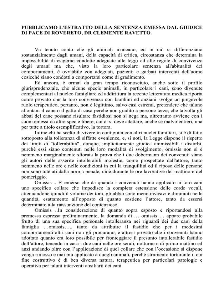 PUBBLICAMO L'ESTRATTO DELLA SENTENZA EMESSA DAL GIUDICE DI PACE DI ROVERETO, DR CLEMENTE RAVETTO. Va tenuto conto che gli animali mancano, ed in ciò si differenziano sostanzialmente dagli umani, della capacità di critica, circostanza che determina la impossibilità di esigerne condotte adeguate alle leggi ed alle regole di convivenza degli umani ma che, visto la loro particolare sentenza all'abitualità dei comportamenti, è ovviabile con adeguati, pazienti e garbati interventi dell'uomo cosicchè siano condotti a comportarsi come di gradimento. Ed ancora, è ormai da gran tempo riconosciuto, anche sotto il profilo giurisprudenziale, che alcune specie animali, in particolare i cani, sono divenute complementari al nucleo famigliare ed addirittura la recente letteratura medica riporta come provato che la loro convivenza con bambini ed anziani svolge un pregevole ruolo terapeutico, pertanto, non è legittimo, salvo casi estremi, pretendere che taluno allontani il cane o il gatto di casa perchè non gradito a persone terze; che talvolta gli abbai del cane possano risultare fastidiosi non si nega ma, altrettanto avviene con i suoni emessi da altre specie libere, cui ci si deve adattare, anche se malvolentieri, una per tutte a titolo esemplificativo, la tortora. Infine chi ha scelto di vivere in contiguità con altri nuclei familiari, si è di fatto sottoposto alla tolleranza di siffatte evenienze, e, si noti, la Legge dispone il rispetto dei limiti di "tollerabilità", dunque, implicitamente giudica ammissibili i disturbi, purchè essi siano contenuti nelle loro modalità di svolgimento. omissis non si è nemmeno marginalmente sfiorata la prova che i due dobermann dei convenuti siano gli autori delle asserite intollerabili molestie, come prospettate dall'attore, tanto nemmeno nelle ore e nelle condizioni in cui la tranquillità ed il riposo delle persone non sono tutelati dalla norma penale, cioè durante le ore lavorative del mattino e del pomeriggio. Omissis .. E' emerso che da quando i convenuti hanno applicato ai loro cani uno specifico collare che impedisce la completa estensione delle corde vocali, attenuandone quindi il volume dei toni, gli abbai sono meno invasivi e diminuiti nella quantità, esattamente all’opposto di quanto sostiene l’attore, tanto da essersi determinato alla riassunzione del contenzioso. Omissis ..In considerazione di quanto sopra esposto e riportandosi alla premessa espressa preliminarmente, la domanda di … omissis … appare probabile frutto di una sua specifica personale intolleranza nei riguardi dei due cani della famiglia …omissis…., tanto da attribuire il fastidio che per i medesimi comportamenti altri cani non gli procurano; è altresì provato che i convenuti hanno adottato quanto era loro possibile per fronteggiare il presunto intollerabile fastidio dell’attore, tenendo in casa i due cani nelle ore serali, notturne e di primo mattino ed anzi andando oltre con l’applicazione di quel collare che con l’occasione si dispone venga rimosso e mai più applicato a quegli animali, perché strumento torturante il cui fine costruttivo è di ben diversa natura, terapeutica per particolari patologie e operativa per taluni interventi ausiliarii dei cani. Tutto ciò non esime, tuttavia i convenuti dal vegliare costantemente e che i due cani Dobermann non diano luogo a lagnanze superando quel limite di ragionevole tollerabilità che i contigui residenti sono tenuti, appunto, a dover tollerare, volendo significare che, come detto in premessa, gli animali non sono autonomamente in grado di distinguere tra tollerabilità o meno dei loro comportamenti. Riassumendo la domanda non trova accoglimento perché non sorretta da elementi probatori di responsabilità a carico dei convenuti ed il medesimo è condannato alla rifusione in loro favore delle spese legali sostenute pel presente giudizio che si liquidano nella complessiva somma ..omissis… I convenuti …omissis … sono diffidati ponendo in essere quanto si rende necessario nel rispetto comunque dei diritti esistenziali degli animali con loro conviventi, affinchè i medesimi non producano molestie o turbamenti per le persone in genere. Il Giudice di Pace Dr Clemente Ravetto OSSERVAZIONI: Sentenza di valore notevole con alcuni importanti aspetti innovativi sotto il profilo giurisprudenziale. Ritenendo non provata la violazione del Codice Civile riguardo l’articolo 844 e sulla quale non voglio e non posso entrare, ritenendo comunque ineccepibile la sentenza, dal punto di vista di studioso del comportamento animale e di animalista noto una inconsueta modernità nella valutazione anche di quanto messo in essere dagli stessi convenuti per limitare le immissioni sonore con metodi non eticamente accettabili. In primo piano l’affermazione che l’abbaio rientra nel comune comportamento canino e che, questo è da considerare nella normale tollerabilità, quando non si infrangono le comuni regole civili. Un altro aspetto, affrontando il moderno aspetto della contiguità tra le abitazioni, fotografa l’attualità e invita a tener conto che tale vicinanza, conduce inevitabilmente ad un incremento delle cause di disturbo, ritenendo tale aspetto come una sorta di rinuncia alla quiete ed alla tranquillità, raggiungibili solo in altri contesti urbanistici. Rilevante la parte nella quale, il Giudice, condanna espressamente anche i convenuti, a desistere dall’utilizzo di mezzi di correzione del comportamento, quali i collari elettrici che possono e devono essere usati solo in casi molto particolari e da professionisti qualificati e di utilizzare invece, “metodi rispettosi dei diritti esistenziali degli animali”, in quanto, “a comportamenti che esulassero dalla normalità, “si può ovviare con adeguati, pazienti e garbati interventi dell’uomo, cosicché siano condotti a comportarsi come di gradimento.” Abbiamo assistito ad una lezione magistrale di un alto operatore di Giustizia che riconosce giuridicame