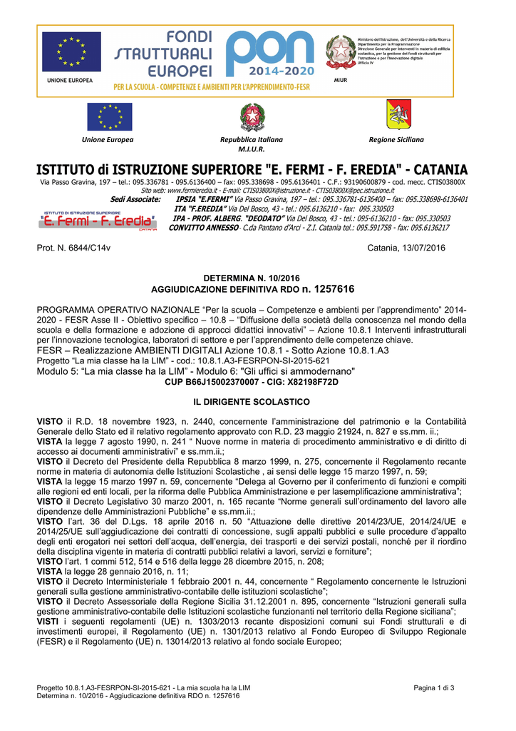 Unione Europea Repubblica Italiana M.I.U.R. Regione Siciliana ISTITUTO di ISTRUZIONE SUPERIORE "E. FERMI - F. EREDIA" - CATANIA Via Passo Gravina, 197 – tel.: 095.336781 - 095.6136400 – fax: 095.338698 - 095.6136401 - C.F.: 93190600879 - cod. mecc. CTIS03800X Sito web: www.fermieredia.it - E-mail: [email protected] - [email protected] Sedi Associate: IPSIA “E.FERMI” Via Passo Gravina, 197 – tel.: 095.336781-6136400 – fax: 095.338698-6136401 ITA “F.EREDIA” Via Del Bosco, 43 - tel.: 095.6136210 - fax: 095.330503 IPA - PROF. ALBERG. “DEODATO” Via Del Bosco, 43 - tel.: 095-6136210 - fax: 095.330503 CONVITTO ANNESSO - C.da Pantano d’Arci - Z.I. Catania tel.: 095.591758 - fax: 095.6136217 Prot. N. 6844/C14v Catania, 13/07/2016 DETERMINA N. 10/2016 AGGIUDICAZIONE DEFINITIVA RDO n. 1257616 PROGRAMMA OPERATIVO NAZIONALE “Per la scuola – Competenze e ambienti per l’apprendimento” 20142020 - FESR Asse II - Obiettivo specifico – 10.8 – “Diffusione della società della conoscenza nel mondo della scuola e della formazione e adozione di approcci didattici innovativi” – Azione 10.8.1 Interventi infrastrutturali per l’innovazione tecnologica, laboratori di settore e per l’apprendimento delle competenze chiave. FESR – Realizzazione AMBIENTI DIGITALI Azione 10.8.1 - Sotto Azione 10.8.1.A3 Progetto “La mia classe ha la LIM” - cod.: 10.8.1.A3-FESRPON-SI-2015-621 Modulo 5: “La mia classe ha la LIM” - Modulo 6: "Gli uffici si ammodernano" CUP B66J15002370007 - CIG: X82198F72D IL DIRIGENTE SCOLASTICO VISTO il R.D. 18 novembre 1923, n. 2440, concernente l’amministrazione del patrimonio e la Contabilità Generale dello Stato ed il relativo regolamento approvato con R.D. 23 maggio 21924, n. 827 e ss.mm. ii.; VISTA la legge 7 agosto 1990, n. 241 “ Nuove norme in materia di procedimento amministrativo e di diritto di accesso ai documenti amministrativi” e ss.mm.ii.; VISTO il Decreto del Presidente della Repubblica 8 marzo 1999, n. 275, concernente il Regolamento recante norme in materia di autonomia delle Istituzioni Scolastiche , ai sensi delle legge 15 marzo 1997, n. 59; VISTA la legge 15 marzo 1997 n. 59, concernente “Delega al Governo per il conferimento di funzioni e compiti alle regioni ed enti locali, per la riforma delle Pubblica Amministrazione e per lasemplificazione amministrativa”; VISTO il Decreto Legislativo 30 marzo 2001, n. 165 recante “Norme generali sull’ordinamento del lavoro alle dipendenze delle Amministrazioni Pubbliche” e ss.mm.ii.; VISTO l’art. 36 del D.Lgs. 18 aprile 2016 n. 50 “Attuazione delle direttive 2014/23/UE, 2014/24/UE e 2014/25/UE sull’aggiudicazione dei contratti di concessione, sugli appalti pubblici e sulle procedure d’appalto degli enti erogatori nei settori dell’acqua, dell’energia, dei trasporti e dei servizi postali, nonché per il riordino della disciplina vigente in materia di contratti pubblici relativi a lavori, servizi e forniture”; VISTO l’art. 1 commi 512, 514 e 516 della legge 28 dicembre 2015, n. 208; VISTA la legge 28 gennaio 2016, n. 11; VISTO il Decreto Interministeriale 1 febbraio 2001 n. 44, concernente “ Regolamento concernente le Istruzioni generali sulla gestione amministrativo-contabile delle istituzioni scolastiche”; VISTO il Decreto Assessoriale della Regione Sicilia 31.12.2001 n. 895, concernente “Istruzioni generali sulla gestione amministrativo-contabile delle Istituzioni scolastiche funzionanti nel territorio della Regione siciliana”; VISTI i seguenti regolamenti (UE) n. 1303/2013 recante disposizioni comuni sui Fondi strutturali e di investimenti europei, il Regolamento (UE) n. 1301/2013 relativo al Fondo Europeo di Sviluppo Regionale (FESR) e il Regolamento (UE) n. 13014/2013 relativo al fondo sociale Europeo; Progetto 10.8.1.A3-FESRPON-SI-2015-621 - La mia scuola ha la LIM Determina n. 10/2016 - Aggiudicazione definitiva RDO n. 1257616 Pagina 1 di 3 VISTA la Circolare del Ministero del Lavoro, della Salute e delle Politiche Sociali del 2 febbraio 2009, n. 2 “Tipologia dei soggetti promotori, ammissibilità delle spese e massimali di costo per le attività rendicontate a costi reali cofinanziate dal Fondo Sociale Europeo 2007/2013 nell’ambito dei Programmi Operativi Nazionali”; VISTO il PON Programma Operativo Nazionale 2014T05M2OP001 ”Per la scuola – competenze e ambienti per l’apprendimento” approvato con Decisione C (2014) n. 9952, del 17 dicembre 2014 della Commissione Europea; VISTA la Delibera del Collegio dei docenti n. 24 del 27/11/2015 con la quale è stata deliberata la candidatura e l'inserimento nel POF 2015-2016 del progetto "La mia classe ha la LIM", finalizzato alla promozione della didattica laboratoriale tramite l'acquisizione di LIM e PC portatili, oltre che ad incrementare le dotazioni tecnologiche degli uffici di segreteria; VISTA la Delibera del Consiglio di Istituto n. 40 del 27/11/2015 con la quale è stata approvata la candidatura n. 11331 e l'inserimento nel POF 2015-2016del progetto "La mia classe ha la LIM", di cui all'Avviso prot. n. AOODGEFID/12810 del 15/10/2015, con un importo totale richiesto pari a € 22.000,00, suddiviso in due moduli: modulo 5 "La mia classe ha la LIM" (tipologia Aule "aumentate" dalla tecnologia); modulo 6 "Gli uffici si ammodernano" (tipologia "Postazioni informatiche e per l'accesso dell'utenza e delle segreterie ai dati ed ai servizi digitali della scuola); VISTA la nota del MIUR Prot. AOODGEFID/5876 del 30/03/2016, indirizzata a questa istituzione scolastica, avente il seguente oggetto: - Fondi Strutturali Europei – P.O.N. “Per la scuola, competenze e ambienti per l’apprendimento” 2014-2020 Autorizzazione progetto e impegno di spesa a valere sull’Avviso pubblico prot. n. AOODGEFID\12810 del 15 ottobre 2015, finalizzato alla realizzazione di ambienti digitali; VISTO il Regolamento d’Istituto approvato con delibera n. 16 verbale n. 8 del 26 febbraio 2014 che disciplina le moda