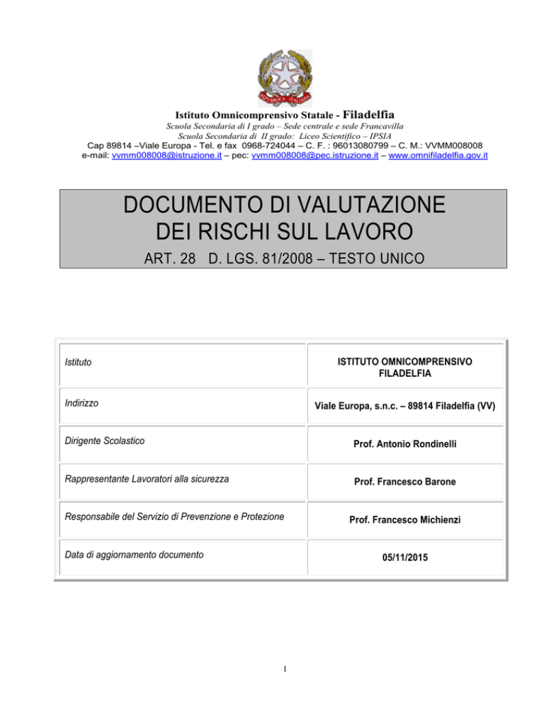 Istituto Omnicomprensivo Statale - Filadelfia Scuola Secondaria di I grado – Sede centrale e sede Francavilla Scuola Secondaria di II grado: Liceo Scientifico – IPSIA Cap 89814 –Viale Europa - Tel. e fax 0968-724044 – C. F. : 96013080799 – C. M.: VVMM008008 e-mail: [email protected] – pec: [email protected] – www.omnifiladelfia.gov.it DOCUMENTO DI VALUTAZIONE DEI RISCHI SUL LAVORO ART. 28 D. LGS. 81/2008 – TESTO UNICO ISTITUTO OMNICOMPRENSIVO FILADELFIA Istituto Indirizzo Viale Europa, s.n.c. – 89814 Filadelfia (VV) Dirigente Scolastico Prof. Antonio Rondinelli Rappresentante Lavoratori alla sicurezza Prof. Francesco Barone Responsabile del Servizio di Prevenzione e Protezione Data di aggiornamento documento Prof. Francesco Michienzi 05/11/2015 1 FIRME DOCUMENTO Il presente DOCUMENTO (art.28, DLgs 81/08 è stato elaborato in collaborazione con il responsabile del servizio di prevenzione e protezione, del rappresentante dei lavoratori per la sicurezza e del medico competente che ha partecipato alla valutazione del rischio per quanto previsto dall’articolo 28, comma 2, lettera e, DLgs 81/08. Il Responsabile del Servizio Prevenzione e Protezione: Cognome Michienzi Il Medico Competente: Cognome ----------------- Nome Firma Francesco Nome Firma --------------- Il documento è stato elaborato previa consultazione del Rappresentante dei Lavoratori per la Sicurezza Per presa visione del Rappresentante dei Lavoratori per la Sicurezza: Cognome Nome Barone Firma Francesco Il Rappresentante Legale dell’Istituto: Cognome Nome Rondinelli Antonio Data certa di elaborazione del documento (comma 2 art. 28 DLgs 81/08): Filadelfia, 05 Novembre 2015 Numero protocollo 2 Firma Indice: 1. DATI GENERALI DELL’ISTITUTO SCOLASTICO 2. DATI IDENTIFICATIVI DEL PLESSO E DEL SISTEMA PREVENZIONISTICO INTERNO 3. CARATTERISTICHE GENERALI DELL’EDIFICIO SCOLASTICO 4. ELENCO DOCUMENTAZIONI OBBLIGATORIE E SPECIFICHE 4.1 - Documentazione Obbligatoria Generale 4.2 - Documentazione Obbligatoria Specifica 4.3 - Documentazione necessaria per la Valutazione dei Rischi 5. METODOLOGIA 5.1 - Fattori di rischio 5.2 - Norme tecniche di riferimento 6. RELAZIONE SULLA VALUTAZIONE DEI RISCHI CON ESPLICITATI I CRITERI ADOTTATI PER LA VALUTAZIONE STESSA 6.1 - Criteri di valutazione utilizzati 6.2 - Identificazione dei fattori di rischio (potenziali fonti di pericolo) 6.3 - Identificazione dei lavoratori esposti 6.4 - Quantificazione dei rischi (stima dell’entità dell’esposizione e della gravità degli effetti) 6.5 - Definizione delle priorità degli interventi necessari 6.6 - Individuazione, programmazione e messa in atto delle misure di prevenzione / protezione necessarie 7. OBIETTIVI COMUNI PER GARANTIRE L’ADESIONE A UN MODELLO DI ORGANIZZAZIONE E DI GESTIONE SECONDO GLI ARTT. 6 E 7 DEL D.LGS. 8 GIUGNO 2001, N. 231 7.1 - Politica per la sicurezza e la salute dei lavoratori (SSL) 7.2 - Aspetti organizzativi e gestionali 7.2.1 - Organizzazione del lavoro 7.2.2 - Compiti, funzioni e responsabilità 7.2.3 - Analisi, pianificazione e controllo 7.2.4 - Informazione - formazione 7.2.5 - Partecipazione 7.2.6 - Norme e procedure di lavoro 7.2.7 - Dispositivi di protezione individuale 7.2.8 - Emergenza e pronto soccorso 7.2.9 - Sorveglianza sanitaria / vaccinazioni 7.2.10 -Lavori in appalto 7.3 - Analisi della esposizione ai rischi specifici 7.3.1 - Impianto elettrico 7.3.2 - Rischio incendio 7.4 - Rischi fisici 7.4.1 - Rumore e comfort acustico 7.4.2 - Carico lavoro fisico 7.4.3 - Microclima 7.4.4 - Temperatura dei locali 7.4.5 - Illuminazione 7.4.6 - Arredi 7.4.7 - Attrezzature 7.5 - Rischi legati alle attività svolte in ambienti specifici 7.5.1 - Aule per attività didattiche normali 7.5.2 - Aule per attività didattiche speciali / laboratori 7.5.3 - Aula magna / auditorio 7.5.4 - Uffici (direzione e amministrazione) 7.5.5 - Biblioteca 7.5.6 - Refettorio 7.5.7 - Attività sportive (palestre e spazi esterni attrezzati) 7.5.8 - Servizi e spogliatoi 7.5.9 - Barriere architettoniche 3 7.5.10 - Parco giochi e area cortiliva 7.5.11 - Rischio fumo 8. VALUTAZIONE DEI RISCHI PER GRUPPI OMOGENEI DEI LAVORATORI 8.1 - Personale direttivo 8.1.1 - DSGA/assistente amministrativo 8.2 - Docente 8.3 - Assistente tecnico 8.4 - Cuoco 8.5 - Collaboratore scolastico 8.6 – Studenti 10. VALUTAZIONE DA RISCHIO DA STRESS LAVORO - CORRELATO 10.1 - Definizioni 10.2 - Aspetti del lavoro potenzialmente stressanti in ambito scolastico 10.3 - Modalità di individuazione dello stress lavoro-correlato 10.4 - Interventi di bonifica 11. COINVOLGIMENTO DEL PERSONALE 12. PROFESSIONALITÀ E RISORSE IMPIEGATE 13. RISULTATI DELLA VALUTAZIONE - PROGRAMMA DI ATTUAZIONE 14. LISTA DI CONTROLLO (Check List) d) l’individuazione delle procedure per l’attuazione delle misure da realizzare, nonché dei ruoli dell’organizzazione aziendale che vi debbono provvedere, a cui devono essere assegnati unicamente soggetti in possesso di adeguate competenze e poteri; 4 1. DATI GENERALI DELL’ISTITUTO SCOLASTICO Datore di Lavoro (art. 1 DM 21 giugno 1996, n. 292) Dirigente scolastico Rondinelli Antonio nato a Filadelfia il 12.04.1951, a seguito di accettazione di titolarità dell’attività e di incarico di Dirigenza presso la sede legale dell’Istituto Omnicomprensivo Via Viale Europa, n° civico 9, Cap 89814, Località. Filadelfia; (VV) Plesso oggetto della valutazione Istituto Omnicomprensivo Viale Europa, s.n.c. Cap 89814, Località Filadelfia;(VV) Proprietario dell’edificio (art. 3 , legge 11 gennaio 1996, n. 23) Ragione sociale Amm. Comunale/Provinciale Via C.so Castelmonardo, n° civico / Cap 89814, Località Filadelfia;(VV) Referente per l’edificio scolastico Ufficio tecnico comunale STUDENTI N. Totale 439 N. femmine 198 N. maschi 241 PERSONALE DIPENDENTE N. Totale 72 2 6 14 CORPO DOCENTE ASSISTENTI TECNICI ASSISTENTI AMMINISTRATIVI COLLABORATORI SCOLASTICI N. femmine 52 0 3 3 N. maschi 20 2 3 11 DOCENTI COLLABORATORI DEL DIRIGENTE SCOLASTICO Docente