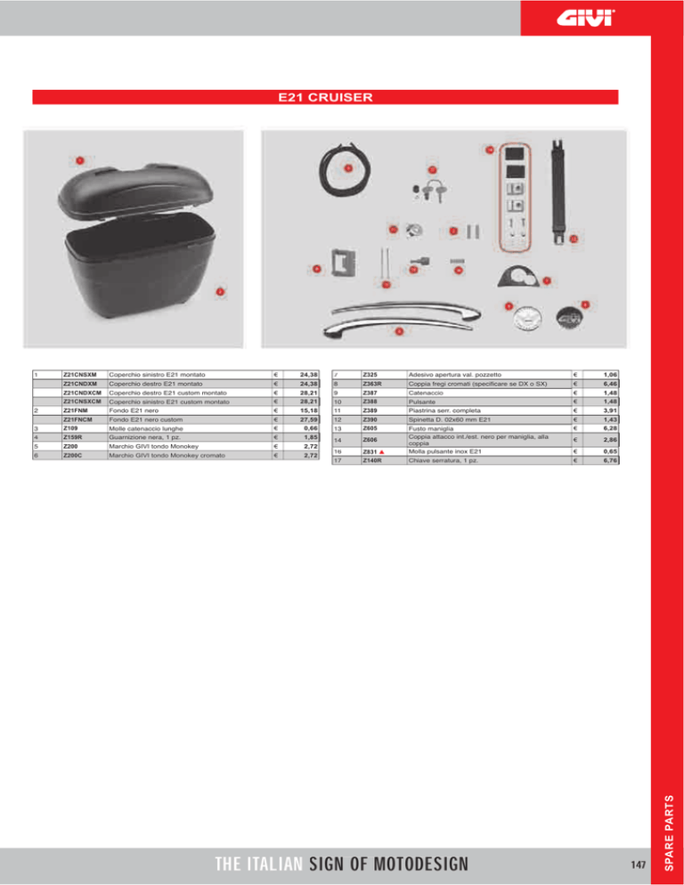 Z21CNSXM Coperchio sinistro E21 montato € 24,38 7 Z325 Adesivo apertura val. pozzetto € 1,06 Z21CNDXM Coperchio destro E21 montato € 24,38 8 Z363R Coppia fregi cromati (specificare se DX o SX) € 6,46 Z21CNDXCM Coperchio destro E21 custom montato € 28,21 9 Z387 Catenaccio € 1,48 Z21CNSXCM Coperchio sinistro E21 custom montato € 28,21 10 Z388 Pulsante € 1,48 Z21FNM Fondo E21 nero € 15,18 11 Z389 Piastrina serr. completa € 3,91 Z21FNCM Fondo E21 nero custom € 27,59 12 Z390 Spinetta D. 02x60 mm E21 € 1,43 3 Z109 Molle catenaccio lunghe € 0,66 13 Z605 € 6,28 4 Z159R Guarnizione nera, 1 pz. € 1,85 14 Z606 € 2,86 5 Z200 Marchio GIVI tondo Monokey € 2,72 6 Z200C Marchio GIVI tondo Monokey cromato € 2,72 16 Z831 S Fusto maniglia Coppia attacco int./est. nero per maniglia, alla coppia Molla pulsante inox E21 € 0,65 17 Z140R Chiave serratura, 1 pz. € 6,76 1 2 THE ITALIAN SIGN OF MOTODESIGN SPARE PARTS E21 CRUISER