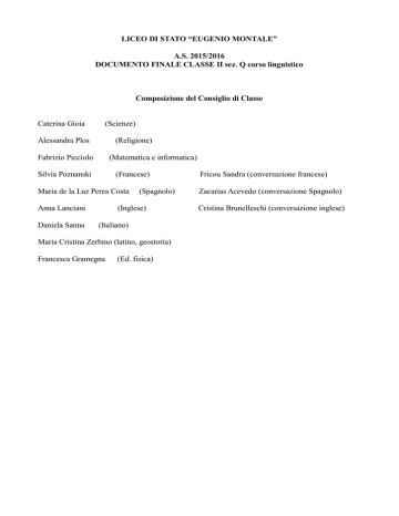 LICEO DI STATO “EUGENIO MONTALE” A.S. 2015/2016 DOCUMENTO FINALE CLASSE II sez. Q corso linguistico Composizione del Consiglio di Classe Caterina Gioia (Scienze) Alessandra Plos (Religione) Fabrizio Picciolo (Matematica e informatica) Silvia Poznanski (Francese) Maria de la Luz Perea Costa Anna Lanciani Daniela Sanna (Spagnolo) (Inglese) (Italiano) Maria Cristina Zerbino (latino, geostoria) Francesca Gramegna (Ed. fisica) Fricou Sandra (conversazione francese) Zacarias Acevedo (conversazione Spagnolo) Cristina Brunelleschi (conversazione inglese) PROGRAMMA SVOLTO Scienze Naturali (indirizzo linguistico) Anno Scolastico 2015/2016 Prof.ssa Caterina Gioia Ore settimanali : 2 Classe 2Q CHIMICA Le trasformazioni chimiche della materia: elementi e composti, la teoria atomica, le leggi ponderali. La struttura dell’atomo: le particelle subatomiche, i modelli atomici Thomson, Rutherford. La mole: la mole, la massa molare, volume molare di un gas, formula empirica e formula molecolare, concentrazione molare di una soluzione. Gli elettroni nell’atomo: la luce come un’onda, il modello di Bohr, il modello quanto-meccanico e le configurazioni elettroniche degli elementi, il sistema periodico degli elementi, le proprietà periodiche degli elementi. I legami chimici: legame ionico, legame covalente puro e polare, legame ad idrogeno, legame metallico, ibridazione, simbologia di Lewis. Nomenclatura dei composti inorganici: formule chimiche, la nomenclatura chimica dei composti binari e ternari molecolari e ionici. BIOLOGIA La struttura della materia: proprietà dell’acqua. le molecole della vita: carboidrati, lipidi e proteine, gli acidi nucleici. Origine ed evoluzione delle cellule: cellule procariote ed eucariote, organismi autotrofi ed eterotrofi. La cellula strutture e funzioni: organuli cellulari. I processi energetici della cellula: gli enzimi, l’ATP valuta energetica delle cellule, come le sostanze entrano e escono dalla cellula: diffusione, osmosi e trasporto attivo, la fotosintesi clorofilliana e la respirazione cellulare. La divisione cellulare: il ciclo cellulare, la mitosi SCIENZE DELLA TERRA Minerali e rocce, il ciclo delle rocce. ATTIVITA’ SVOLTE DALL’INTERA CLASSE O DA ALCUNI ALUNNI DELLA CLASSE AIRC “Le Arance della salute” Progetto “Riciclando” educare alla salute personale e collettiva, che passa attraverso la gestione oculata di tutte le attività antropiche. Le competenze da raggiungere sono quelle del riconoscere il “rifiuto” come un oggetto ancora pieno di valore in termini di materia prima o di riutilizzo tale quale. Visita didattica al Museo di Zoologia di Roma Visita didattica al Museo dell’Orto Botanico di Roma Campus “Terminillo” conoscenza geologico-naturalistica del territorio del M. Terminillo. Osservazione e riconoscimento di litotipi , costruzione di profili topografici osservazione e riconoscimento di specie botaniche, osservazioni di preparati vegetali al microscopio ottico. ATTIVITA’ LABORATORIALI . Durante il campus Terminillo riconoscimento macroscopico di specie vegetali e riconoscimento al microscopio ottico di parti di cellule vegetali stomi, cloroplasti, parete cellulare. . Riconoscimento di litotipi sedimentari. Costruzione di un profilo topografico. LIBRI DI TESTO “Esplorare la Chimica” tomo A di P. Ristarà ed. Atlas Biologia Al cuore della Biologia primo biennio di E. Simon linx ed. Pearson Roma, 31 maggio 2016 LICEO CLASSICO “EUGENIO MONTALE” Programma dell'Insegnamento della Religione cattolica. Prof. Alessandra Plos Anno Scolastico 2015-2016 Obiettivi minimi Saper descrivere la dimensione religiosa contenuta nelle domande di senso Conoscere le teorie religiose circa l’aldilà Comprendere Il valore della vita umana. Conoscere le principali tappe della vita di Gesù e della prima comunità cristiana Conoscenze raggiunte Riconoscere gli interrogativi universali dell’uomo: origine e futuro, bene e male, senso della vita e della morte, speranze e paure dell’umanità; le risposte che dà il Cristianesimo, anche a confronto con le altre religioni Consocere le caratteristiche della morale cristiana: libertà di coscienza e responsabilità nell’ambito della sessualità umana e della società multietnica Approfondire la conoscenza della persona e del messaggio di salvezza di Gesù: il suo stile di vita, la sua relazione con Dio e con le persone, le sue scelte, così come documentato dai vangeli e da altri documenti Ripercorrere gli eventi principali della vita della Chiesa nel primo millennio Abilità raggiunte Comprendere che la dimensione spirituale è la più profonda dell’essere umana Confrontare le risposte alle domande di senso date dalle varie religioni, soprattutto in relazione a: Dio, senso della vita, Morte e aldilà Analizzare le caratteristiche della morale cattolica nell’ambito della sessualità e della società multietnica Individuare le tappe salienti della vita di Gesù e della prima comunità cristiana Competenze raggiunte Saper leggere alcuni atteggiamenti giovanili come bisogno di senso I giovani davanti a Dio, alla morte, al dolore, al senso della vita Individuare le differenze fra le diverse religioni rispetto alle risposte alle domande esistenziali Esplicitare le caratteristiche della Morale cristiana ed in particolar la visione cattolica della sessualità e della fraternità La sessualità umana: lo sviluppo sessuale dall’infanzia all’età adulta Giovani e sessualità Posizioni etiche Riconoscere le tappe salienti della vita di Gesù e della Chiesa primitiva Gesù storico, Cristo della fede La sindone: testimonianza nella tradizione della morte e resurrezione di Gesù Strumenti usati Libro di testo, video e film, canzoni, fotocopie fornite dall’insegnante, mezzi digitali, internet. Metodi usati lezione frontale, cineforum, disco forum, lettura e commento di testi vari, braistorming, problem solving, giochi di ruolo. Valutazione All’inizio e alla fine di ogni lezione: brevi domande