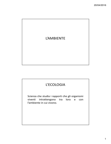 20/04/2016 L’AMBIENTE L’ECOLOGIA Scienza che studia i rapporti che gli organismi viventi intrattengono tra loro e con l’ambiente in cui vivono. 1 20/04/2016 L’ECOLOGIA Livelli di relazione: • popolazione: relazione tra individui della stessa specie; • comunità: relazione tra individui di specie diverse; • ecosistema: relazione tra le comunità e l’ambiente in cui vivono; • biosfera: relazione tra ecosistemi diversi. LA POPOLAZIONE È l’insieme degli organismi della stessa specie che occupano un dato spazio. ex. Gazzelle che vivono nella savana Habitat: luogo in cui vive una specie ex. La savana è l’habitat delle gazzelle Nello stesso habitat possono vivere specie diverse. ex. La savana è l’habitat del leone, delle giraffe, delle zebre, dei cespugli, … La nicchia ecologica è il ruolo della popolazione nel suo habitat. ex. Le gazzelle mangiano l’erba, il leone mangia la gazzella, i cespugli assorbono acqua e sali minerali, … 2 20/04/2016 LA COMUNITÀ È l’insieme delle popolazioni che vivono nello stesso habitat. ex. La comunità della savana è formata dalla popolazione delle gazzelle, da quella del leone, dai cespugli ed altre specie animali e vegetali. LA COMUNITÀ - INTERAZIONI Le interazioni tra le popolazioni possono essere: • commensalismo e mutualismo: relazioni vantaggiose (SIMBIOSI) • competizione, predazione e parassitismo: relazioni svantaggiose 3 20/04/2016 LA COMUNITÀ - COMMENSALISMO Una delle due popolazioni trae beneficio, mentre l’altra non ne è influenzata. ex. Batteri intestinali – uomo; ex. Uccelli che mangiano gli insetti del bisonte LA COMUNITÀ - MUTUALISMO Interazione obbligata tra due specie: necessaria alla loro sopravvivenza. ex. I licheni e i funghi: I funghi proteggono l’organismo dalla disidratazione e assorbono dal terreno sostanze nutritive; in cambio, ricevono dalle alghe i carboidrati che esse producono tramite la fotosintesi. ex. Una specie di attinia e un paguro: la prima si attacca alla conchiglia abitata dal secondo, si nutre dei suoi avanzi di cibo e si fa trasportare da questo piccolo crostaceo, mentre quest’ultimo viene camuffato e al tempo stesso difeso dai tentacoli urticanti dell’attinia. 4 20/04/2016 LA COMUNITÀ - COMPETIZIONE Lotta, diretta o indiretta, tra diversi organismi appartenenti a una stessa specie (c. intraspecifica) o a specie diverse (c. interspecifica), per l'utilizzazione di una risorsa. ex. Tutti gli animali sono in competizione, sia per procurarsi il cibo, sia per un luogo di nidificazione o di un territorio, sia per conquistare un partner; ciò vale anche per le piante che, in particolare, sono in competizione per l'utilizzo della luce. LA COMUNITÀ - PREDAZIONE Uccisione di un organismo da parte di un altro vivente che se ne ciba. ex. Sono predatori i carnivori, che si cibano di erbivori; ma anche gli erbivori, che si nutrono di vegetali, o, ancora, le piante carnivore, che catturano insetti. 5 20/04/2016 LA COMUNITÀ - PREDAZIONE Uccisione di un organismo (preda) da parte di un altro vivente che se ne ciba (predatore). ex. Sono predatori i carnivori, che si cibano di erbivori; ma anche gli erbivori, che si nutrono di vegetali, o, ancora, le piante carnivore, che catturano insetti. LA COMUNITÀ - PREDAZIONE La crescita della popolazione delle prede dipende dalla crescita della popolazione del predatore. Le prede si difendono fuggendo velocemente, producendo sostanze irritanti o odorose, mimetizzandosi. 6 20/04/2016 LA COMUNITÀ - PARASSITISMO Relazione di tipo asimmetrico tra due organismi che risulta vantaggiosa per l'uno (parassita) e dannosa per l'altro (ospite): il parassita si nutre a spese dell’ospite. ex. Il cuculo depone le sue uova nel nido di uccelli di altre specie; il vischio succhia la linfa degli alberi sui quali si impianta. Spesso, il parassita è molto più piccolo del suo ospite e può collocarsi all'esterno del corpo di questo (ectoparassita) o all'interno (endoparassita). L’ECOSISTEMA ECOSISTEMA = COMUNITÀ + AMBIENTE COMPONENTE BIOTICA COMPONENTE ABIOTICA 7 20/04/2016 L’ECOSISTEMA Se cambia un solo fattore, ne risente l’intero ecosistema. L’ECOSISTEMA COMPONENTE ABIOTICA Sono le condizioni ambientali come: • temperatura • luce • acqua • composizione del suolo •… 8 20/04/2016 L’ECOSISTEMA COMPONENTE ABIOTICA TEMPERATURA: da essa dipende lo svolgimento delle funzioni vitali delle popolazioni. ex. Per adattarsi al freddo le piante sono coperte da peluria o sono basse o sono aghiformi; gli animali hanno la pelliccia o uno strato di grasso o vanno in letargo o ibernazione. 9 20/04/2016 ex. Per adattarsi al caldo le piante riducono le foglie a spine; gli animali sono notturni. L’ECOSISTEMA COMPONENTE ABIOTICA LUCE: è indispensabile per la fotosintesi clorofilliana, influenza la fioritura delle piante, influenza la vita degli animali. 10 20/04/2016 L’ECOSISTEMA COMPONENTE ABIOTICA ACQUA: è indispensabile per la vita di tutti gli esseri viventi, infatti tutti sono costituiti per gran parte d’acqua. ex. specie xerofile ( = amante dell’ambiente arido) 11 20/04/2016 ex. specie idrofile ( = amante dell’acqua) ex. specie igrofile ( = amante dell’ambiente umido) 12 20/04/2016 L’ECOSISTEMA CATENA ALIMENTARE Sequenza di rapporti alimentari esistente tra gli organismi di un ecosistema che si nutrono l’uno dell’altro. La catena alimentare va considerata come un’astrazione semplificata di una realtà ecologica molto complessa. ex. catena alimentare 13 20/04/2016 ex. catena alimentare ex. catena alimentare 14 20/04/2016 L’ECOSISTEMA RETE ALIMENTARE In uno stesso ambiente si trovano più catene alimentari, che formano una rete alimentare. ex. rete alimentare 15 20/04/2016 ex. rete alimentare 16