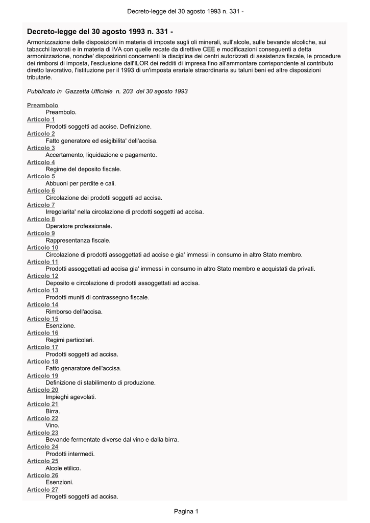 Decreto-legge del 30 agosto 1993 n. 331 - Decreto-legge del 30 agosto 1993 n. 331 Armonizzazione delle disposizioni in materia di imposte sugli oli minerali, sull'alcole, sulle bevande alcoliche, sui tabacchi lavorati e in materia di IVA con quelle recate da direttive CEE e modificazioni conseguenti a detta armonizzazione, nonche' disposizioni concernenti la disciplina dei centri autorizzati di assistenza fiscale, le procedure dei rimborsi di imposta, l'esclusione dall'ILOR dei redditi di impresa fino all'ammontare corrispondente al contributo diretto lavorativo, l'istituzione per il 1993 di un'imposta erariale straordinaria su taluni beni ed altre disposizioni tributarie. Pubblicato in Gazzetta Ufficiale n. 203 del 30 agosto 1993 Preambolo Preambolo. Articolo 1 Prodotti soggetti ad accise. Definizione. Articolo 2 Fatto generatore ed esigibilita' dell'accisa. Articolo 3 Accertamento, liquidazione e pagamento. Articolo 4 Regime del deposito fiscale. Articolo 5 Abbuoni per perdite e cali. Articolo 6 Circolazione dei prodotti soggetti ad accisa. Articolo 7 Irregolarita' nella circolazione di prodotti soggetti ad accisa. Articolo 8 Operatore professionale. Articolo 9 Rappresentanza fiscale. Articolo 10 Circolazione di prodotti assoggettati ad accise e gia' immessi in consumo in altro Stato membro. Articolo 11 Prodotti assoggettati ad accisa gia' immessi in consumo in altro Stato membro e acquistati da privati. Articolo 12 Deposito e circolazione di prodotti assoggettati ad accisa. Articolo 13 Prodotti muniti di contrassegno fiscale. Articolo 14 Rimborso dell'accisa. Articolo 15 Esenzione. Articolo 16 Regimi particolari. Articolo 17 Prodotti soggetti ad accisa. Articolo 18 Fatto genaratore dell'accisa. Articolo 19 Definizione di stabilimento di produzione. Articolo 20 Impieghi agevolati. Articolo 21 Birra. Articolo 22 Vino. Articolo 23 Bevande fermentate diverse dal vino e dalla birra. Articolo 24 Prodotti intermedi. Articolo 25 Alcole etilico. Articolo 26 Esenzioni. Articolo 27 Progetti soggetti ad accisa. Pagina 1 Decreto-legge del 30 agosto 1993 n. 331 Articolo 28 Aliquote. Articolo 29 Criteri generali. Articolo 29 bis Contributo di riciclaggio sul polietilene. Articolo 30 Imposizioni sugli oli lubrificanti e sui bitumi di petrolio. Articolo 31 Mutua assistenza per recupero crediti. Articolo 32 Compiti del Dipartimento delle Dogane e imposte indirette vigilanza su alcoli superiori e sanzioni. Articolo 33 Disposizioni transitorie. Articolo 34 Adeguamenti alla normativa comunitaria. Articolo 35 Soppressione d'imposta. Articolo 36 Modifiche di talune aliquote. Articolo 37 Operazioni intracomunitarie. Articolo 38 Acquisti intracomunitari. Articolo 39 Effettuazione dell'acquisto intracomunitario. Articolo 40 Territorialita' delle operazioni intracomunitarie. Articolo 41 Cessioni intracomunitarie non imponibili. Articolo 42 Acquisti non imponibili o esenti. Articolo 43 Base imponibile ed aliquota. (N.D.R.: Per l'applicazione delle disposizioni del presente articolo vedasi il comma 8 dell'art.24 legge 7 luglio 2009 n.88.) Articolo 44 Soggetti passivi. Articolo 45 Detrazione. Articolo 46 Fatturazione delle operazioni intracomunitarie. Articolo 47 Registrazione delle operazioni intracomunitarie. Articolo 48 Liquidazioni periodiche e dichiarazione annuale. Articolo 49 Dichiarazione e versamenti dell'imposta per gli enti non commerciali e per i prodotti soggetti ad accisa. Articolo 50 Obblighi connessi agli scambi intracomunitari. Articolo 50 bis Depositi fiscali ai fini IVA. Articolo 51 Disposizioni relative ai prodotti agricoli. Articolo 52 Concessioni ai viaggiatori. Articolo 53 Disposizioni relative ai mezzi di trasporto nuovi. Articolo 54 Sanzioni. Articolo 55 Collaborazione nei controlli ai fini dell'imposta sul valore aggiunto con la Amministrazioni degli altri Stati membri. Articolo 56 Norme applicabili. Articolo 57 Adeguamento dell'imposta sul valore aggiunto. Articolo 58 Pagina 2 Decreto-legge del 30 agosto 1993 n. 331 Operazioni non imponibili. Articolo 59 Rimborsi a soggetti non residenti e controlli dell'esportazione. Articolo 60 Disposizioni transitorie. Articolo 61 Tasse di concessione governative per l'iscrizione delle societa' nel registro delle imprese e per l'attribuzione del numero di partita IVA. Articolo 62 Modificazioni della disciplina dei centri autorizzati di assistenza fiscale e dei rimborsi d'imposta. Articolo 62 bis Studi di settore. Articolo 62 ter Accertamento induttivo sulla base del contributo diretto lavorativo. Articolo 62 quater Modifiche alla disciplina dell'accertamento induttivo nella base dei coeffienti presuntivi. Articolo 62 quinquies Accertamento parziale e iscrizione provvisoria a ruolo. Abrogazioni. Articolo 62 sexies Attivita' di accertamento nei riguardi dei contribuenti obbligati alla tenuta delle scritture contabili. Articolo 63 Disposizioni relative alla imposta sulle successioni, all'imposta sugli spettacoli e quelle sulle concessioni e locazioni di beni pubblici. Articolo 64 Disposizioni per l'attribuzione del codice fiscale e per i controlli e i riscontri. Articolo 65 Imposta straordinaria su autovetture, autoveicoli e motocicli di lusso. (N.D.R.: Con decreto del 6 giugno 2003 il termine di pagamento della tassa annuale di stazione, di cui al comma 6 del presente articolo, per l'anno 2003 e' stato differito al 31 ottobre 2003.) Articolo 66 Modificazioni di disposizioni agevolative. Articolo 67 Disposizione in materia di imposizione fiscale delle cessioni a termine. Articolo 68 Modifiche alla tabella collegata alla legge 20 ottobre 1991, n.358. Articolo 69 Disposizioni in materia di contenzioso tributario. Articolo 70 Entrata in vigore. Tabella A (TABELLA A: Impieghi degli oli minerali che comportano l'esenzione delle accise o l'applicazione di un'aliquota ridotta, sotto l'osservanza delle norme prescritte) (*). TABELLA A-BIS (articolo 50-bis comma 4, lettera d) Pagina 3 Decreto-legge del 30 agosto 1993 n. 331 - Preambolo - Preambolo. In vigore dal 