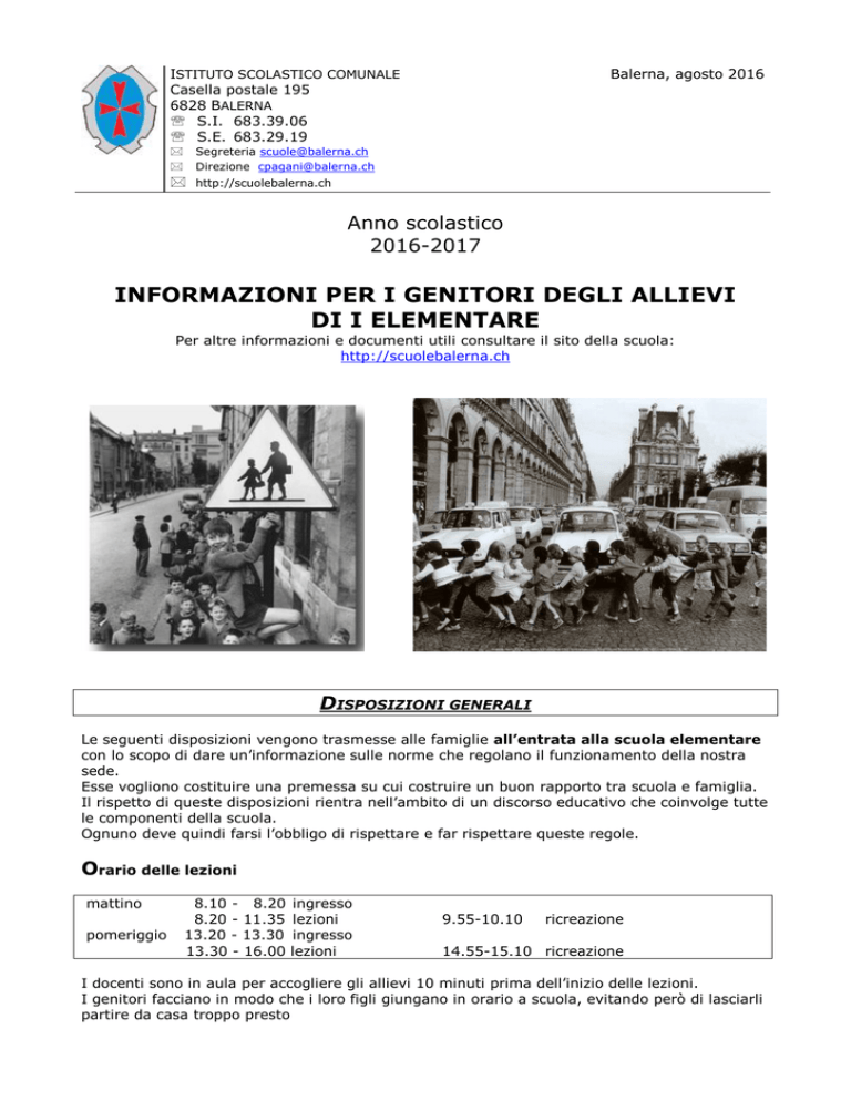 ISTITUTO SCOLASTICO COMUNALE Casella postale 195 6828 BALERNA S.I. 683.39.06 S.E. 683.29.19 Balerna, agosto 2016 Segreteria [email protected] Direzione [email protected] http://scuolebalerna.ch Anno scolastico 2016-2017 INFORMAZIONI PER I GENITORI DEGLI ALLIEVI DI I ELEMENTARE Per altre informazioni e documenti utili consultare il sito della scuola: http://scuolebalerna.ch DISPOSIZIONI GENERALI Le seguenti disposizioni vengono trasmesse alle famiglie all’entrata alla scuola elementare con lo scopo di dare un’informazione sulle norme che regolano il funzionamento della nostra sede. Esse vogliono costituire una premessa su cui costruire un buon rapporto tra scuola e famiglia. Il rispetto di queste disposizioni rientra nell’ambito di un discorso educativo che coinvolge tutte le componenti della scuola. Ognuno deve quindi farsi l’obbligo di rispettare e far rispettare queste regole. Orario delle lezioni mattino pomeriggio 8.10 - 8.20 8.20 - 11.35 13.20 - 13.30 13.30 - 16.00 ingresso lezioni ingresso lezioni 9.55-10.10 ricreazione 14.55-15.10 ricreazione I docenti sono in aula per accogliere gli allievi 10 minuti prima dell’inizio delle lezioni. I genitori facciano in modo che i loro figli giungano in orario a scuola, evitando però di lasciarli partire da casa troppo presto Assenze Ogni assenza deve essere comunicata tempestivamente ai/alle docenti prima dell’inizio delle lezioni. Il certificato medico deve essere presentato per le assenze superiori alle 2 settimane. Dopo una malattia infettiva (parotite epidemica, rosolia, morbillo, pertosse, …) il rientro a scuola potrà avvenire unicamente con la presentazione di un certificato rilasciato da un medico autorizzato all’esercizio della professione in un Cantone svizzero comprovante la cessazione del pericolo di contagio; VARICELLA E SCARLATTINA SONO ESCLUSE DA QUESTA DISPOSIZIONE. Domanda di sospensione temporanea della frequenza scolastica L'art. 8 del Reg. Legge sulla S.I. e sulla S.E., per quanto riguarda le assenze degli allievi, sancisce che : Non sono consentite deroghe alla frequenza scolastica, se non per motivi gravi di ordine 1 familiare o per malattia. Tutte le assenze dalla scuola devono essere immediatamente giustificate dai genitori al 2 docente titolare. Per assenze dovute a malattia o infortunio superiori ai 14 giorni è richiesto il certificato 3 medico. Per poter concedere una deroga alla frequenza scolastica obbligatoria, è quindi necessario che nella giustificazione la famiglia indichi con precisione i motivi che impongono un'assenza da scuola. Tutte le assenze che non hanno quale motivazione quanto prescritto dalla legge, saranno considerate assenze arbitrarie. Vi preghiamo cortesemente di programmare le vostre vacanze tenendo in debita considerazione il calendario scolastico. In questi ultimi anni abbiamo notato un proliferare di richieste, in particolare per prolungare a una settimana intera la vacanza quando ci sono ponti o giornate di festa infrasettimanali. Dispense dall’educazione fisica Eventuali richieste di dispensa dalle lezioni di educazione fisica o di nuoto devono essere comunicate in forma scritta al docente di classe, anche per periodi limitati; in caso di manifesta impossibilità alla frequenza (es. traumi fissati con gesso..), la presentazione del certificato non é necessaria. Piano settimanale delle lezioni Durante la prima settimana di scuola il docente trasmetterà alle famiglie il piano settimanale delle lezioni speciali affinché ogni allievo possa sempre giungere a scuola con il materiale necessario. Effetti personali Ogni allievo deve avere: una cartella o uno zainetto per il trasporto ordinato di libri, quaderni e materiale scolastico, un paio di pantofole, un sacchetto da ginnastica contenente un paio di scarpette per la palestra e un paio per l’esterno, calzoncini e maglietta per la ginnastica. Necessario per le lezioni di nuoto (solo per gli allievi dalla seconda alla quinta elementare). Materiale scolastico Il materiale scolastico necessario é fornito gratuitamente dalla scuola. La spesa per materiale perso o reso inservibile per negligenza, può essere addebitata alla famiglia. Il materiale consegnato dalla scuola e quello personale deve essere tenuto con cura. Si consiglia di evitare l’acquisto di costosi astucci contenenti colori, riga, squadra, ecc. Per il materiale distribuito dai docenti è sufficiente un astuccio a busta (vuoto). Attività speciali Le disposizioni riguardanti il doposcuola-opzionale, la scuola fuori sede e altre attività parascolastiche saranno comunicate ai genitori al momento opportuno. Scuola Montana Prevista per il periodo per le sezioni di IV e V elementare (da lunedì a venerdì compresi). Nel periodo autunnale o primaverile (scuola verde) per le III, IV e le V. Indicazioni più precise seguiranno. Biblioteca scolastica La nostra scuola è dotata di una stupenda biblioteca scolastica con all’incirca 30'000 libri. La bibliotecaria, Sig.ra Sonia Ostini, distribuirà ad ogni allievo la tessera del Sistema bibliotecario ticinese necessaria per l’ottenimento dei libri in prestito. Per gli allievi più piccoli la tessera sarà custodita in biblioteca. Doposcuola sociale e mensa L’Associazione famiglie diurne del Mendrisiotto offre la possibilità ai bambini dai 3 agli 11 anni di frequentare il doposcuola sociale e la mensa scolastica. Per maggiori informazioni rivolgersi a Lo scoiattolo – Associazione fam. Diurne del Mendrisiotto Sig.ra Simona Sandrinelli - tel. 091 682.14.19 e-mail: [email protected] RAPPORTI SCUOLA - FAMIGLIA Un sereno e costruttivo rapporto tra scuola e famiglia é necessario affinché l’intervento educativo della scuola trovi continuità e coerenza presso i genitori. È importante che ognuno si attenga al proprio ruolo e alle proprie competenze e che la collaborazione sia impostata all’insegna del rispetto reciproco. Ci si incontra per conoscersi, informarsi, collaborare e partecipare ricordando che gli obietti