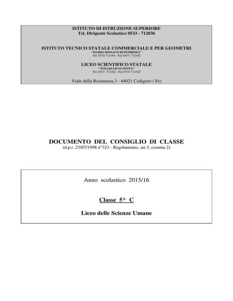 ISTITUTO DI ISTRUZIONE SUPERIORE Tel. Dirigente Scolastico 0533 - 712036 ISTITUTO TECNICO STATALE COMMERCIALE E PER GEOMETRI “GUIDO MONACO DI POMPOSA” Tel. 0533-712164 - Fax 0533- 712162 LICEO SCIENTIFICO STATALE “TULLIO LEVI CIVITA” Tel. 0533- 712162 - Fax 0533-712162 Viale della Resistenza,3 - 44021 Codigoro ( Fe) DOCUMENTO DEL CONSIGLIO DI CLASSE (d.p.r. 23/07/1998 n°323 - Regolamento, art.5, comma 2) Anno scolastico 2015/16 Classe 5^ C Liceo delle Scienze Umane INDICE Elenco studenti Pag. 1 Profilo della classe 1 Elenco docenti 2 Quadro orario 3 Obiettivi generali raggiunti 4 Metodi e strumenti didattici 5 Moduli a carattere multidisciplinare 6 Attività extracurricolari 8 Tipologia e caratteristiche delle simulazioni Terza prova 9 Valutazione 10 Griglia di valutazione Prima prova scritta 11 Griglia di valutazione Seconda prova scritta 12 Griglia di valutazione Terza prova scritta 13 Relazioni disciplinari: Storia dell’Arte 16 Matematica e Fisica 18 Scienze motorie e sportive 21 Lingua e cultura inglese 22 Scienze umane 25 Lingua e Letteratura italiana 28 Lingua e Letteratura latina 33 Storia 35 Scienze naturali 37 Religione 40 Filosofia 42 Firmario 45 Allegati: testi delle simulazioni di Terza prova scritta 14 Elenco studenti 1 2 3 4 5 6 7 8 9 10 11 12 13 14 15 16 17 18 19 20 21 22 23 24 25 Bandini Elisa Bruni Elisa Cavaletti Tommaso Cavazzini Giorgia De Luca Daniela Fabbri Riccardo Farinelli Vanessa Feggi Giorgia Finotti Chiara Fogli Valentina Gazzuola Sara Giudici Allison Maccanti Sara Mangherini Melania Mannarino Sarah Marinelli Valentina Miozzi Sara Nonnato Matilde Pavani Sara Telloli Aurora Telloli Giulia Tirsu Cozmin Gabriel Trapella Desi Trasforini Francesca Zamboni Lara Profilo della classe La storia della classe è caratterizzata da accorpamenti, scomposizioni e nuovi accorpamenti che sono avvenuti fino al 4° anno di corso; un gruppo di allievi, infatti, ha costituito la sezione D di una classe articolata per il primo biennio, nel corso del 3° anno un gruppetto della sezione C è stato distaccato dalla classe di origine per la formazione di due classi terze che in 4° sono state nuovamente accorpate in un’unica classe che corrisponde all’attuale 5°. Tutto ciò è stato motivato soprattutto dalle mancate ammissioni agli anni successivi che hanno modificato il numero degli allievi durante il primo e il secondo biennio. Questi eventi hanno suggerito ai Docenti di curare con attenzione il clima relazionale tra gli allievi, stimolando quelli che tendevano a rimanere più in ombra e frenando i caratteri più esuberanti; da parte loro i ragazzi hanno dovuto sviluppare notevoli capacità di adattamento al gruppo affinando le loro abilità comunicative. La classe (composta da 25 allievi: 22 femmine e 3 maschi) mostra la presenza di gruppi diversi, che però hanno vissuto gli ultimi due anni in un clima di disponibilità reciproca, tolleranza e spirito di solidarietà. Hanno dimostrato sempre molto interesse per le attività didattiche, anche di tipo extra-curricolare, proposte dai Docenti del Consiglio di Classe o da altri insegnanti dell’Istituto; si sono, infatti, resi disponibili per l’Orientamento in entrata con attività di laboratorio, educazione peer to peer o partecipazione a 1 Scuola Aperta; hanno accolto con favore ed entusiasmo attività legate alla lotta contro la Violenza sulle donne proposte dall’ Amministrazione comunale di Codigoro in anni successivi. Ciò che, infatti, li caratterizza è sicuramente l’interesse per le tematiche del mondo contemporaneo, soprattutto se legate a realtà di debolezza o fragilità sociale. Gli obiettivi fissati dal Consiglio di Classe sono stati raggiunti da parte di tutti gli allievi anche se in modo diverso: a fronte di un gruppo che ha maturato un sicuro metodo di studio e un’ottima preparazione in tutte le discipline, ci sono allievi che sono rimasti ancorati ad uno studio un po’ più mnemonico e meno personale. Se entriamo nello specifico delle aree disciplinari, le debolezze più evidenti si registrano nelle materie come Matematica e Fisica, dove l’avvicendarsi di molti insegnanti diversi nel corso dei cinque anni, ed anche durante uno stesso anno, ha provocato una certa insicurezza. La storia della classe, sopra descritta, infatti, ha avuto come naturale conseguenza una forte discontinuità didattica e solo le docenti di Italiano e Scienze naturali conoscono tutti gli allievi fin dal primo anno. Elenco Docenti Docente Materia Baricordi Roberto Storia dell’arte Matematica Bellotti Davide Fisica Borgiani Andrea Scienze Motorie Caracciolo Maria Cristina Lingua e letteratura inglese Carli Pieredgardo Scienze Umane Demaria Barbara Lingua e letteratura italiana Lingua e letteratura latina Storia Gennari Silvia Scienze Naturali Martucci Nicola Religione Parolini Rocco Filosofia Coordinatore di classe 2 Quadro orario del Liceo delle Scienze Umane Discipline Religione Italiano Latino Inglese Storia dell'Arte Geografia e Storia Storia Filosofia Diritto ed Economia Scienze umane Fisica Matematica Scienze naturali Scienze motorie e sportive Totale I 1 4 3 3 3 2 4 3 2 2 27 II 1 4 3 3 3 2 4 3 2 2 27 III 1 4 2 3 2 2 3 5 2 2 2 2 30 IV 1 4 2 3 2 2 3 5 2 2 2 2 30 V 1 4 2 3 2 2 3 5 2 2 2 2 30 3 Obiettivi raggiunti A) OBIETTIVI FORMATIVI GENERALI Gli allievi hanno dimostrato di: - saper comunicare e sapersi relazionare nel rispetto delle regole di convivenza civile e democratica; - saper trasmettere il rispetto per le persone e per l’ambiente; - aver acquisito la consapevolezza del proprio metodo di studio; - saper organizzare, in modo sufficientemente efficace, il proprio lavoro individualmente e in gruppo; - aver potenziato le capacità personali. B) OBIETTIVI COGNITIVI Conoscenze Gli allievi hanno acquisito mediamente una più che discreta: - Conoscenza dei contenuti delle singole discipline sia nelle parti che nell’insieme; - Conoscenza degli ambiti disciplinari in modo da riuscire a stabilire collegamenti e 