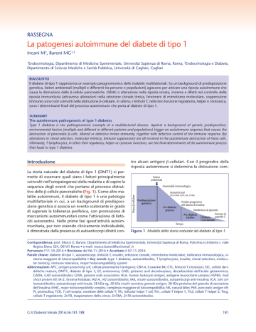 RASSEGNA La patogenesi autoimmune del diabete di tipo 1 Incani M2, Baroni MG1,2 1 Endocrinologia, Dipartimento di Medicina Sperimentale, Università Sapienza di Roma, Roma; 2Endocrinologia e Diabete, Dipartimento di Scienze Mediche e Sanità Pubblica, Università di Cagliari, Cagliari RIASSUNTO Il diabete di tipo 1 rappresenta un esempio patognomonico delle malattie multifattoriali. Su un background di predisposizione genetica, fattori ambientali (multipli e differenti tra persone e popolazioni) agiscono per attivare una riposta autoimmune che causa la distruzione delle β-cellule pancreatiche. Difetti o alterazione nella riposta innata, insieme a difetti nel controllo della riposta immunitaria (attraverso alterazioni nella selezione clonale timica, fenomeni di mimetismo molecolare, soppressione immune) sono tutti coinvolti nella distruzione β-cellulare. In ultimo, i linfociti T, nella loro funzione regolatoria, helper e citotossica, sono i determinanti finali del processo autoimmune che porta al diabete di tipo 1. SUMMARY The autoimmune pathogenesis of type 1 diabetes Type 1 diabetes is the pathognomonic example of a multifactorial disease. Against a background of genetic predisposition, environmental factors (multiple and different in different patients and populations) trigger an autoimmune response that causes the destruction of pancreatic β-cells. Altered or defective innate immunity, together with defective control of the immune response (by alterations in clonal selection, molecular mimicry, immune suppression) are all involved in the autoimmune destruction of these cells. Ultimately, T lymphocytes, in either their regulatory, helper or cytotoxic functions, are the final determinants of the autoimmune process that leads to type 1 diabetes. La storia naturale del diabete di tipo 1 (DMT1) ci permette di osservare quali siano i fattori principalmente coinvolti nell’eziopatogenesi della malattia e di capire la sequenza degli eventi che portano al processo distruttivo delle β-cellule pancreatiche (Fig. 1). Come altre malattie autoimmuni, il diabete di tipo 1 è una patologia multifattoriale in cui, a un background di predisposizione genetica si associa un evento scatenante in grado di superare la tolleranza periferica, con promozione di meccanismi autoimmunitari come l’attivazione di linfociti autoreattivi. Nelle prime fasi quest’attività autoimmunitaria, pur non essendo clinicamente individuabile, è dimostrata dalla presenza di autoanticorpi diretti con- tro alcuni antigeni β-cellulari. Con il progredire della risposta autoimmune si determina la distruzione comFattori ambientali Anormalità immunologica Autoanticorpi Massa β-cellulare Introduzione (ICA, GADA, IA2-A, IAA, ZnT8A) Predisposizione genetica Pre-diabete precoce Perdita progressiva del rilascio di insulina Intolleranza al glucosio Assenza di Diabete peptide C conclamato Pre-diabete tardivo Tempo Figura 1 Modello della storia naturale del diabete di tipo 1. Corrispondenza: prof. Marco G. Baroni, Dipartimento di Medicina Sperimentale, Università Sapienza di Roma, Policlinico Umberto I, viale Regina Elena 324, 00161 Roma • e-mail: [email protected] Pervenuto l’11-10-2016 • Revisione del 06-11-2016 • Accettato il 07-11-2016 Parole chiave: diabete di tipo 1, autoanticorpi, linfociti T, insulite, selezione clonale, mimetismo molecolare, tolleranza immunologica, sistema maggiore di istocompatibilità • Key words: type 1 diabetes, autoantibodies, T lymphocytes, insulite, clonal selection, molecular mimicry, immune tolerance, major histocompatibility system Abbreviazioni: APC, antigen-presenting cell, cellula presentante l’antigene; CBV-4, Coxackie B4; CTL, linfociti T citotossici; DC, cellule dendritiche mature; DMT1, diabete di tipo 1; EV, enterovirus; GAD, glutamic acid decarboxylase, decarbossilasi dell’acido glutammico; GADA, GAD autoantibodies; GWA, genome wide association; HLA, human leukocyte antigen, antigene leucocitario umano; HSP60, heat shock protein 60; IA-2, tirosina-fosfatasi; IA2-A, IA2 autoantibodies; IAA, insulin autoantibodies, autoanticorpi anti-insulina; ICA, islet cellautoantibodies, autoanticorpi anti-insula; 38 kDa sg, 38 kDa insulin secretory-granule antigen, 38 kDa proteina del granulo di secrezione dell’insulina; MHC, major histocompatibility complex, complesso maggiore di istocompatibilità; NK, natural killer; P69, pancreatic antigen 69; PI, proinsulina; TCR, T cell receptor, recettore delle cellule T; Tfh, follicular helper T cell; Th1, cellule T helper 1; Th2, cellule T helper 2; Treg, cellule T regolatorie; ZnT8, trasportatore dello zinco; ZnT8A, ZnT8 autoantibodies. G It Diabetol Metab 2016;36:181-188 181 Incani M e Baroni MG pleta delle β-cellule e la comparsa dell’iperglicemia(1). Gli elementi coinvolti nell’eziopatogenesi del diabete di tipo 1 comprendono quindi fattori genetici, fattori ambientali e sistema immunitario. Fattori genetici Da un punto di vista genetico la caratteristica comune del diabete di tipo 1 e delle altre malattie multifattoriali è l’assenza di una specifica corrispondenza tra genotipo e fenotipo, tipica invece delle patologie monogeniche. Nelle malattie multifattoriali una qualunque variante eziologica non segrega costantemente con la patologia, poiché non ne è la causa, ma determina solo un aumentato rischio. Questo spiega la ridotta penetranza di ciascun polimorfismo considerato singolarmente, e rende molto difficoltoso il mappaggio dei geni coinvolti nel DMT1. Sono numerosissimi i geni o i loci cromosomici che sono stati trovati in linkage con la malattia(2,3). Una vasta ricerca genomica ha dimostrato che, nonostante vi siano molti geni responsabili dello sviluppo del diabete, i più importanti sono legati all’MHC (complesso maggiore di istocompatibilità), e in particolare all’antigene leucocitario umano (HLA), il locus dei geni che codificano le proteine responsabili per la regolazione del sistema immunitario nell’uomo. Si t