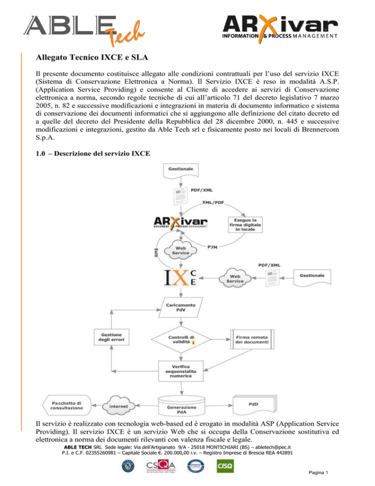 Allegato Tecnico IXCE e SLA Il presente documento costituisce allegato alle condizioni contrattuali per l’uso del servizio IXCE (Sistema di Conservazione Elettronica a Norma). Il Servizio IXCE è reso in modalità A.S.P. (Application Service Providing) e consente al Cliente di accedere ai servizi di Conservazione elettronica a norma, secondo regole tecniche di cui all’articolo 71 del decreto legislativo 7 marzo 2005, n. 82 e successive modificazioni e integrazioni in materia di documento informatico e sistema di conservazione dei documenti informatici che si aggiungono alle definizione del citato decreto ed a quelle del decreto del Presidente della Repubblica del 28 dicembre 2000, n. 445 e successive modificazioni e integrazioni, gestito da Able Tech srl e fisicamente posto nei locali di Brennercom S.p.A. 1.0 – Descrizione del servizio IXCE Il servizio è realizzato con tecnologia web-based ed è erogato in modalità ASP (Application Service Providing). Il servizio IXCE è un servizio Web che si occupa della Conservazione sostitutiva ed elettronica a norma dei documenti rilevanti con valenza fiscale e legale. ABLE TECH SRL Sede legale: Via dell’Artigianato 9/A - 25018 MONTICHIARI (BS) – [email protected] P.I. e C.F. 02355260981 – Capitale Sociale €. 200.000,00 i.v. – Registro Imprese di Brescia REA 442891 Pagina 1 2.0 Caricamento dei file sul portale IXCE Il processo prevede il caricamento del documento mediante una chiamata ad un servizio Web (Web Services) di IXCE. Le modalità di caricamento dei file sul portale sono: - dal software di gestione documentale ARXivar in quale dispone di uno specifico connettore nativo con il Servizio IXCE; - dal software Plugin Manager con l’utilizzo del WriterIXCE, il quale monitorizza una cartella windows locale, legge i metadati da un file ascii/xml e carica il file associato. - da un qualunque software che integra i web services di IXCE; La chiamata al Web Services per il caricamento del file verso IXCE, restituisce, indipendentemente dal sw utilizzato, il Riferimento Univoco assegnato dal Servizio IXCE al documento e l’HASH calcolato mediante algoritmo SHA256, del medesimo. Tale informazione rimane persistente anche sul Portale IXCE per qualunque attività di controllo. La chiamata di caricamento documento oltre al file prevede una serie di metadati configurabili in base alla tipologia di documento caricato. In sede di configurazione è possibile definire quali informazioni sono obbligatorie e quali opzionali. I file per la conservazione elettronica a norma devono essere obbligatoriamente firmati digitalmente. La firma digitale sul singolo documento può essere posta prima dell’invio al Sistema di Conservazione IXCE oppure il documento può essere caricato senza la firma, la quale dovrà essere applicata per mezzo del portale mediante firma digitale remota. In questo secondo caso è da attivare uno specifico servizio di firma digitale remota. 3.0 Gestione degli allegati Il servizio IXCE prevede la possibilità di caricare degli allegati per un documento. La procedura di caricamento per eseguire questa operazione è la medesima utilizzata per il caricamento del documento indicando in aggiunta l’identificativo univoco (IdentificativoDiRiferimento) di correlazione al documento a cui si riferisce. 4.0 Formati di file (documenti e allegati) L’evolversi delle tecnologie e la crescente disponibilità e complessità dell’informazione digitale ha indotto la necessità di gestire sempre maggiori forme di informazione digitale (testo, immagini, filmati, ecc.) e di disporre di funzionalità più specializzate per renderne più facile la creazione, la modifica e la manipolazione. Questo fenomeno porta all’aumento del numero dei formati disponibili e dei corrispondenti programmi necessari a gestirli nonché delle piattaforme su cui questi operano. In particolare, volendo fare una prima sommaria, e non esaustiva, catalogazione dei più diffusi formati, secondo il loro specifico utilizzo possiamo elencare: PDF - PDF/A TIFF JPG Office Open XML (OOXML) Open Document Format XML TXT Formati Messaggi di posta elettronica ABLE TECH SRL Sede legale: Via dell’Artigianato 9/A - 25018 MONTICHIARI (BS) – [email protected] P.I. e C.F. 02355260981 – Capitale Sociale €. 200.000,00 i.v. – Registro Imprese di Brescia REA 442891 Pagina 2 5.0 Pacchetto di versamento (PdV) Contenitore che racchiude uno o più oggetti da conservare (documenti informatici), oppure anche i soli metadati riferiti agli oggetti da conservare inviato dal produttore al sistema di conservazione secondo un formato predefinito e concordato descritto nel manuale di conservazione. Il servizio IXCE prevede una specifica chiamata Web Services per la creazione del pacchetto di versamento (PdV). I dati necessari sono il nome e descrizione. Il sistema di conservazione restituisce un riferimento univoco del Pacchetto di versamento. Ogni documento deve essere caricato indicando l’identificativo del pacchetto di versamento a cui appartiene. Non vi sono limiti sul numero di documenti che possono essere contenuti nel pacchetto di versamento ne di tipologie di documenti tra quelle previste nel paragrafo 4. Fintanto che il PdV risulta in Stato APERTO, sarà possibile “scartare” documenti all’interno del PdV. Una volta che il PdV verrà CHIUSO non sarà più possibile eseguire l’operazione di scarto. Il PdV potrà essere dichiarato CHIUSO dal utente “produttore” o automaticamente nel momento in cui viene avviato il processo di creazione del PdA. I documenti scartati rimarranno comunque dentro il PdV ma non saranno considerati per la creazione del PdA (Pacchetto di Archiviazione). Eventuali documenti errati dovranno essere Scartati nel PdV e inviati nuovamente al Sistema di Conservazione IXCE mediante un nuovo PdV. Rimane a carico del Cliente provvedere al caricamento del PdV nei tempi e nelle modalità previste dal presente allegato tecnico. 6.0 Rapporto di versamento Alla