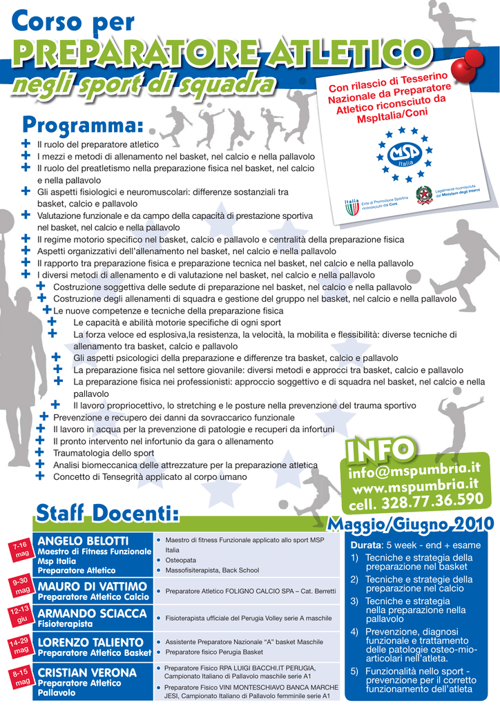 Corso per PREPARATORE ATLETICO negli sport di squadra Programma: ino di Tesser re io c s a il r rato Con da Prepa da le a n io z a o N iconsciut r o ic t le t A /Coni MspItalia Il ruolo del preparatore atletico ico I mezzi e metodi di allenamento nel basket, nel calcio e nella pal pallavolo o Il ruolo del preatletismo nella preparazione fisica nel basket, nel calcio o e nella pallavolo ciuta te riconos Legalmen o degli Interni Gli aspetti fisiologici e neuromuscolari: differenze sostanziali tra l Minister da Sportiva omozione ni Ente di Pr basket, calcio e pallavolo to dal Co riconosciu Valutazione funzionale e da campo della capacità di prestazione sportiva Valu nel b basket, nel calcio e nella pallavolo Il reg regime motorio specifico nel basket, calcio e pallavolo e centralità della preparazione fisica a Aspetti Asp organizzativi dell’allenamento nel basket, nel calcio e nella pallavolo Il rap rapporto tra preparazione fisica e preparazione tecnica nel basket, nel calcio e nella pallavolo volo I diversi div metodi di allenamento e di valutazione nel basket, nel calcio e nella pallavolo Costruzione soggettiva delle sedute di preparazione nel basket, nel calcio e nella pallavolo olo Costruzione degli allenamenti di squadra e gestione del gruppo nel basket, nel calcio e nella pallavolo Le nuove competenze e tecniche della preparazione fisica Le capacità e abilità motorie specifiche di ogni sport La forza veloce ed esplosiva,la resistenza, la velocità, la mobilita e flessibilità: diverse tecniche di allenamento tra basket, calcio e pallavolo Gli aspetti psicologici della preparazione e differenze tra basket, calcio e pallavolo La preparazione fisica nel settore giovanile: diversi metodi e approcci tra basket, calcio e pallavolo La preparazione fisica nei professionisti: approccio soggettivo e di squadra nel basket, nel calcio e nella pallavolo Il lavoro propriocettivo, lo stretching e le posture nella prevenzione del trauma sportivo Prevenzione e recupero dei danni da sovraccarico funzionale Il lavoro in acqua per la prevenzione di patologie e recuperi da infortuni Il pronto intervento nel infortunio da gara o allenamento Traumatologia dello sport Analisi biomeccanica delle attrezzature per la preparazione one atletic atleti atletica ca Concetto di Tensegrità applicato al corpo umano INFOspumbriia.it Staff Docenti: 7-16 mag ANGELO BELOTTI Maestro di Fitness Funzionale Msp Italia Preparatore Atletico Maggio/Giugno 2010 Maestro di fitness Funzionale applicato allo sport MSP Italia Osteopata Massofisiterapista, Back School 9-30 mag MAURO DI VATTIMO Preparatore Atletico FOLIGNO CALCIO SPA – Cat. Berretti 3 12-1 giu ARMANDO SCIACCA Fisioterapista ufficiale del Perugia Volley serie A maschile 9 14-2 mag LORENZO TALIENTO 8-15 mag Preparatore Atletico Calcio Fisioterapista Assistente Preparatore Nazionale “A” basket Maschile Preparatore Atletico Basket Preparatore fisico Perugia Basket CRISTIAN VERONA Preparatore Fisico RPA LUIGI BACCHI.IT PERUGIA, Campionato Italiano di Pallavolo maschile serie A1 Preparatore Atletico Pallavolo f @m i fo in www.mspumbria.it cell. 328.77.36.590 Preparatore Fisico VINI MONTESCHIAVO BANCA MARCHE JESI, Campionato Italiano di Pallavolo femminile serie A1 Durata: 5 week - end + esame 1) Tecniche e strategia della preparazione nel basket 2) Tecniche e strategie della preparazione nel calcio 3) Tecniche e strategia nella preparazione nella pallavolo 4) Prevenzione, diagnosi funzionale e trattamento delle patologie osteo-mioarticolari nell’atleta. 5) Funzionalità nello sport prevenzione per il corretto funzionamento dell’atleta