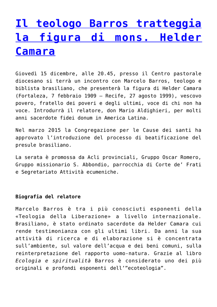 Il teologo Barros tratteggia la figura di mons. Helder Camara Giovedì 15 dicembre, alle 20.45, presso il Centro pastorale diocesano si terrà un incontro con Marcelo Barros, teologo e biblista brasiliano, che presenterà la figura di Helder Camara (Fortaleza, 7 febbraio 1909 – Recife, 27 agosto 1999), vescovo povero, fratello dei poveri e degli ultimi, voce di chi non ha voce. Introdurrà il relatore, don Mario Aldighieri, per molti anni sacerdote fidei donum in America Latina. Nel marzo 2015 la Congregazione per le Cause dei santi ha approvato l’introduzione del processo di beatificazione del presule brasiliano. La serata è promossa da Acli provinciali, Gruppo Oscar Romero, Gruppo missionario S. Abbondio, parrocchia di Corte de’ Frati e Segretariato Attività ecumeniche. Biografia del relatore Marcelo Barros è tra i più conosciuti esponenti della «Teologia della Liberazione» a livello internazionale. Brasiliano, è stato ordinato sacerdote da Helder Camara cui rende testimonianza con gli ultimi libri. Da anni la sua attività di ricerca e di elaborazione si è concentrata sull’ambiente, sul valore dell’acqua e dei beni comuni, sulla reinterpretazione del rapporto uomo-natura. Grazie al libro Ecologia e spiritualità Barros è considerato uno dei più originali e profondi esponenti dell’”ecoteologia”. Gemellaggio terremoto/13. La visita del vescovo Antonio a Camerino e S. Severino: foto e video Pian di Pieca 11 dicembre 2016 Per il ponte dell’Immacolata sono venuti a trovarmi a Pian di Pieca mio marito e i bambini: Elisabetta e Francesco erano molto curiosi di venire a vedere dove sparisce la mamma tutte le settimane e, soprattutto, volevano conoscere i bambini di Pian di Pieca. L’avventura in camper, poi, era imperdibile. Venerdì mattina di buon’ora siamo partiti tutti e quattro con don Luigi e siamo andati prima dal sindaco di Cessapalombo e poi a Camerino dove (a sorpresa!) siamo staiti ricevuti dall’Arcivescovo. È stato un incontro piacevolissimo, informale e sincero in cui ci siamo confrontati sul gemellaggio. Nel pomeriggio mio marito Cristiano e io siamo andati all’Ufficio tecnico di Caldarola per perorare la causa del container per don Vincenzo. Nel frattempo i bambini hanno fatto i compiti in compagnia di Fermano. Ieri (sabato) abbiamo ricevuto a Pian di Pieca la visita del nostro vescovo, Antonio. Insieme a mons. Napolioni c’erano il direttore di Caritas Cremonese, don Antonio Pezzetti, il sindaco di Cremona Gianluca Galimberti con la portavoce Greta Filippini, l’assessore Alessia Manfredini e il presidente del Consiglio comunale Simona Pasquali, oltre al primo cittadino di Corte de’ Frati, Rosolino Azzali, in rappresentanza dell’Unione dei Comuni Oglio Ciria (Corte de Frati, Grontardo, Olmeneta e Scandolara Ripadoglio). La delegazione è partita alle sei del mattino e prima delle undici era da noi. Abbiamo incontrato insieme Marina e Nello, una coppia di anziani del posto, e poi altre persone ospitate presso la Parrocchia. Il tempo di una merenda con prodotti locali e poi un giro alla Chiesa di Santa Maria Assunta (e per qualcuno anche un giro in cantina dove c’è “il vino bono de lu prete”) e a San Casciano nella Chiesa e nella casa di don Luigi Verolini, il direttore della Caritas dell’arcidiocesi di Camerino e San Severino Marche. La delegazione, cui nel frattempo si sono aggiunti Cristiano e Fermano, è andata a Camerino per l’inaugurazione della tensostruttura e poi a San Severino. “Solidarietà e coraggio” sono stati i messaggi portati dal vescovo Antonio a Camerino ai bambini ed ai genitori (circa 250 persone) che per la prima volta dopo il terremoto si sono ritrovati per il catechismo. Parole dolcissime quelle di don Marco che ha pubblicamente ringraziato la Chiesa di Cremona per aver donato la tensostruttura assolutamente necessaria per le attività ordinarie. Successivamente la delegazione si è recata a San Severino dove il Vescovo ha celebrato la Messa nella tensostruttura donata sempre dalla Chiesa di Cremona. Erano circa 500 i convenuti a salutare il loro ex parroco! E poi sia a San Severino che a Camerino i saluti ed i ringraziamenti delle autorità locali. Proprio il sindaco di San Severino, Rosa Piermattei, nei giorni scorsi ha espresso profonda gratitudine per l’installazione di questa tensostruttura. «Poter contare su una struttura – ha scritto il primo cittadino in una lettera inviata al vescovo Napolioni e al direttore di Caritas Cremonese – che, oltre alla celebrazione delle S. Messe, possa essere luogo di incontro, di dialogo, di conforto, di gioco e di convivialità per la comunità parrocchiale, ma anche centro di aggregazione per tutti i cittadini, soprattutto del rione Mazzini e dei quartieri limitrofi, rappresenta un grande motivo di speranza di tornare a vedere San Severino Marche serena e vitale». San Severino è stata fortemente ferita dal terremoto: gli edifici lesionati sono ben 5mila e 3mila le persone che sono state costrette a lasciare le proprie abitazioni. «I centri della vita e delle relazioni – spiega ancora il sindaco Piermattei – risultano inutilizzabili: tutte le chiese sono inagibili e le palestre non possono ospitare le attività sportive, o perché lesionate o perché adibite a centri di accoglienza». Grave anche la situazione delle scuole: «L’inagibilità totale o parziale – si legge ancora nella lettera di ringraziamento del sindaco di San Severino Marche – sta costringendo oltre mille alunni e studenti a svolgere le lezioni sovraffollando (spesso anche con doppi turni) altri edifici istituti scolastici». La lettera integrale del sindaco di San Severino Marche Un messaggio di speranza quello espiresso dal sindaco Galimberti che ha portato a tutti la vicinanza generosa dei cremonesi. Il costo delle due tensostrutture, infatti, è sostenuto anche con i fondi (circa 20mila euro) raccolti fino ad oggi dal Sistema Cremona sul conto istituito per volontà del