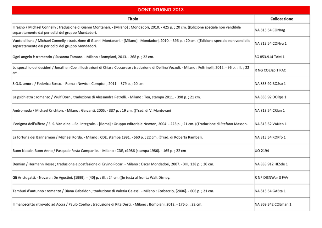 DONI GIUGNO 2013 Titolo Collocazione Il ragno / Michael Connelly ; traduzione di Gianni Montanari. - [Milano] : Mondadori, 2010. - 425 p. ; 20 cm. ((Edizione speciale non vendibile separatamente dai periodici del gruppo Mondadori. NA 813.54 CONrag Vuoto di luna / Michael Connelly ; traduzione di Gianni Montanari. - [Milano] : Mondadori, 2010. - 396 p. ; 20 cm. ((Edizione speciale non vendibile separatamente dai periodici del gruppo Mondadori. NA 813.54 CONvu 1 Ogni angelo è tremendo / Susanna Tamaro. - Milano : Bompiani, 2013. - 268 p. ; 22 cm. SG 853.914 TAM 1 Lo specchio dei desideri / Jonathan Coe ; illustrazioni di Chiara Coccorese ; traduzione di Delfina Vezzoli. - Milano : Feltrinelli, 2012. - 96 p. : ill. ; 22 cm. R NG COEJsp 1 RAC S.O.S. amore / Federica Bosco. - Roma : Newton Compton, 2011. - 379 p. ; 20 cm NA 853.92 BOSso 1 La psichiatra : romanzo / Wulf Dorn ; traduzione di Alessandra Petrelli. - Milano : Tea, stampa 2011. - 398 p. ; 21 cm. NA 833.92 DORps 1 Andromeda / Michael Crichton. - Milano : Garzanti, 2005. - 337 p. ; 19 cm. ((Trad. di V. Mantovani NA 813.54 CRIan 1 L'enigma dell'alfiere / S. S. Van dine. - Ed. integrale. - [Roma] : Gruppo editoriale Newton, 2004. - 223 p. ; 21 cm. ((Traduzione di Stefano Masson. NA 813.52 VANen 1 La fortuna dei Bannerman / Michael Korda. - Milano : CDE, stampa 1991. - 560 p. ; 22 cm. ((Trad. di Roberta Rambelli. NA 813.54 KORfo 1 Buon Natale, Buon Anno / Pasquale Festa Campanile. - Milano : CDE, c1986 (stampa 1986). - 165 p. ; 22 cm UO 2194 Demian / Hermann Hesse ; traduzione e postfazione di Ervino Pocar. - Milano : Oscar Mondadori, 2007. - XIII, 138 p. ; 20 cm. NA 833.912 HESde 1 Gli Aristogatti. - Novara : De Agostini, [1999]. - [40] p. : ill. ; 24 cm.((In testa al front.: Walt Disney. R NP DISNWar 3 FAV Tamburi d'autunno : romanzo / Diana Gabaldon ; traduzione di Valeria Galassi. - Milano : Corbaccio, [2006]. - 606 p. ; 21 cm. NA 813.54 GABta 1 Il manoscritto ritrovato ad Accra / Paulo Coelho ; traduzione di Rita Desti. - Milano : Bompiani, 2012. - 176 p. ; 22 cm. NA 869.342 COEman 1 Titolo Collocazione Dinastia / Robert S. Elegant. - Milano : Euroclub, 1979. - 701 p. ; 22 cm. ((Trad. di Andrea D'Anna UO 2195 La strega innamorata / Pasquale Festa Campanile. - Milano : CDE, stampa 1986. - 191 p. ; 22 cm. UO 2196 Il messaggio : il testamento spirituale del maestro del pensiero positivo / Anthony De Mello. - Milano : Piemme, 2011. - 217 p. ; 22 cm. . ((Traduzione di Rocco Minerva. SG 248.3 DEM 1 La città della gioia / Dominique Lapierre ; traduzione di Elina Klersy Imberciadori. - Milano : Mondadori, 1985. - 474 p. ; 23 cm. UO 2197 I fuochi dell'ira / Wilbur Smith. - Milano : CDE, [1988]. - 681 p. ; 22 cm. ((Trad. di Carlo Brera. UO 2198 Addio, addio mio ultimo amore / Susanna Agnelli. - Milano : CDE, stampa 1985. - 189 p. ; 21 cm UO 2199 Gorbaciov / Žores Medvedev ; traduzione di Roberta Rambelli. - Milano : A. Mondadori, 1986. - 359 p. ; 23 cm. ST 1309 Senza traccia / Charles Berlitz ; con la collaborazione di J. Manson Valentine. - Milano : Club degli editori, c1978. - 271 p. : ill. ; 20 cm. ((Trad. di T. Dobner. UE 1273 I figli dell'Aquila / Giampaolo Pansa. - Milano : Sperling Paperback, 2005. - XI, 385 p. ; 20 cm. SG 945.0916 PANfi Occhi blu capelli neri / Marguerite Duras. - Milano : CDE, 1987. - 134 p. ; 21 cm. ((Trad. di Laura Guarino. UO 2200 I tre moschettieri / Alexandre Dumas. - Nuova ed. - Novara : De Agostini, [2009!. - 250 p. ; 20 cm. R NG DUMAAtr 1 AVV Le formiche : ultimo atto / Gino & Michele [i. e. Gino Vignali, Michele Mozzati], Matteo Molinari. - Milano : Baldini & Castoldi, [1993]. - 173 p. ; 22 cm. NA 808.882 VIGfo Il re di Girgenti / Andrea Camilleri. - Palermo : Sellerio, 2001. - 448 p. ; 17 cm. UO 1962 L' isola degli squali / Gordon Korman ; illustrazioni di Silvestro Nicolaci ; traduzione di Giancarlo Carlotti. - Casale Monferrato : Piemme Junior, 2007. R NB KORMGis AVV 169 p. : ill. ; 20 cm Con moltissima passione : ritratto di Giuseppe Verdi / Raffaele Mellace. - Roma : Carocci, 2013. - 302 p., [4] carte di tav. : ill. ; 22 cm DCONS 782.1092 MEL Titolo Collocazione I due regni... cercando l'Imperatrice / Bruno Concina. - Novara : Istituto Geografico De Agostini, [2007]. - 379 p., [4] c. di tav. : ill. ; 22 cm R NB CONCBdu FAN Vanessa senza paura / Joachim Masannek ; illustrazioni di Jan Birck. - Novara : De Agostini, [2007]. - 133 p. : ill. ; 21 cm. R NB MASAJva RAC Felix il tornado / Joachim Masannek ; illustrazioni di Jan Birck. - Novara : De Agostini, [2007]. - 149 p. : ill. ; 21 cm. R NB MASAJfe RAC La città delle ossa / Michael Connelly ; traduzione di Mariagiulia Castagnone. - [Milano] : Mondadori, stampa 2010 NA 813.54 CONcit La guerra di due mondi : dagli scenari della fantascienza all'incubo della realta / Roberto Pinotti. - Sesto Fiorentino : Olimpia, c2005. - 142 p. ; 20 cm. SG 001.942 PIN Il cielo sopra Darjeeling : romanzo / Nicole C. Vosseler ; traduzione di Alessandra Petrelli. - Milano : TEA, 2010. - 467 p. ; 22 cm. NA 833.92 VOSci Jane e il segreto del medaglione : romanzo : [le indagini di Jane Austen] / Stephanie Barron ; traduzione di Alessandro Zabini. - Milano : TEA, 2009. NA 813.54 BARja 280 p. ; 22 cm L'oro di Poseidone / Lindsey Davis ; traduzione di Maria Elena Vaccarini. - Milano : Net, 2007. - 406 p. : ill. ; 20 cm NA 823.914 DAVor La catastrofe di Nietzsche a Torino / Anacleto Verrecchia. - Torino : Einaudi, \1978!. - XVI, 309 p., \9! c. di tav. : ill. ; 22 cm FIL 409 Principianti assoluti / Colin MacInnes. - Milano : CDE, 1986. - 282 p. ; 23 cm. ((Trad. di Bruno Oddera. UO 2201 Naufragi albanesi : studi, ricerche e riflessioni sull'Albania / Kosta Barjaba, Georges Lapassade, Luigi Perrone ; a cura di Luigi Perrone. - Roma : Sensibili alle foglie, 1996. - 173 p. ; 23 cm. SG 949.6504 BAR Il nuovo Spoon River / Edgar Lee Masters ; introduzione di Barbara Lanati. - Roma : Grandi tascabili economici Newton, 1990. - XXIV, 333 p. ; 22 cm. NO 811.52 MASTELnu ((Trad. di Umberto Ca
