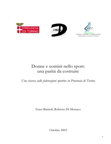 SOCIETA’ RICERCA e FORMAZIONE Professionisti Associati & Partner Donne e uomini nello sport: una parità da costruire Una ricerca sulle federazioni sportive in Provincia di Torino Ester Battioli, Roberto Di Monaco Ottobre 2003 1 Questa ricerca, commissionata al CIRSDe – Centro Interdisciplinare di studi e ricerche delle donne, Università di Torino, dalla Provincia di Torino, Assessorato alla solidarietà sociale, è stata realizzata dalla S.R.F. – Società Ricerca e Formazione, con un gruppo di lavoro composto da Ester Battioli, Roberto Di Monaco, Annunziato Gentiluomo e Giovanna Spolti, con la supervisione scientifica della Prof.ssa Chiara Saraceno – Presidente del CIRSDE. La stesura del rapporto di ricerca è da attribuirsi a Cap1 Roberto Di Monaco Cap2 Ester Battioli Cap3 Roberto Di Monaco Cap4 Ester Battioli La responsabilità di quanto scritto è solo degli autori. L’elaborazione dei dati, dei grafici e delle schede in appendice è stata curata da Giovanna Spolti Il CIRSde e la S.R.F. ringraziano calorosamente quanti hanno consentito la realizzazione del lavoro. In particolare: il CONI Provinciale di Torino, che ha dato la sua adesione all’iniziativa ed ha facilitato la relazione con le federazioni sportive il CESTEM di Torino, che ha messo a disposizione varie informazioni sul sistema sportivo provinciale le Federazioni sportive della provincia di Torino e le strutture regionali e nazionali, che hanno raccolto e fornito dati e informazioni Uno specifico ringraziamento a dirigenti e praticanti sportivi, donne e uomini, che sono stati disponibili ad interviste e discussioni sul tema 2 Donne e uomini nello sport: una parità da costruire INDICE 1. Una domanda sullo sport: è un ambito dove contano le differenze di genere?.........................4 1.1 - Gli obiettivi .................................................................................................................................................4 1.2 - Il disegno della ricerca...............................................................................................................................4 1.3 – Risultati e interrogativi: le piste di lavoro aperte ..................................................................................5 2. Lo sport oggi .............................................................................................................................7 2.1 - Che cos’è lo sport, oggi ? ..........................................................................................................................7 2.2 - Stato sociale e sport ...................................................................................................................................8 2.3 - Il sistema sportivo......................................................................................................................................9 2.4 – Il sistema dell’offerta sportiva in Italia................................................................................................ 10 3. Le federazioni sportive nella provincia di Torino.................................................................... 12 3.1 – Una ricognizione sulle federazioni provinciali................................................................................... 12 3.2 - I praticanti: lo sport per disciplina e genere ........................................................................................ 14 3.3 – Gli operatori: la macchina organizzativa delle federazioni sportive ............................................... 20 4. Lo sport visto ‘dall’interno’: la parola a praticanti e dirigenti ................................................ 31 4.1 – Un approfondimento su 7 discipline................................................................................................... 31 4.2 - L’inizio della pratica sportiva e le prime scelte ................................................................................... 31 4.3 - Cosa spinge a proseguire la pratica di uno sport? .............................................................................. 32 4.4 - L’abbandono precoce: dinamiche e motivazioni................................................................................ 32 4.5 - Atleta o mamma? .................................................................................................................................... 33 4.6 - Contratti e tutele nella pratica sportiva................................................................................................ 34 4.7 - Il destino del dopo-pratica ................................................................................................................... 34 4.8 - Le professioni dello sport : un' ipotesi di segregazione orizzontale ................................................ 35 4.9 - Presenza e percorsi di carriera delle donne dirigenti nello sport ..................................................... 35 4.10 - Le principali difficoltà…di genere...................................................................................................... 36 4.11 - Quali strategie? ...................................................................................................................................... 36 Appendice 1:................................................................................................................................. 38 Bibliografia di riferimento .............................................................................................................................. 38 Sitografia di riferimento .................................................................................................................................. 38 Appendice 2: Le schede delle federazioni (allegato) 3 1. Una domanda sullo sport: è un ambito dove contano le differenze di genere? 1.1 - Gli obiettivi Questo lavoro costituisce la prima parte di un ampio progetto di ricerca, finalizzato a