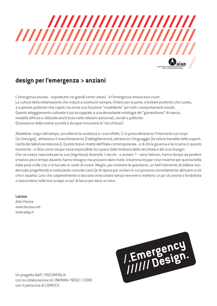 //////////////////////////// //////////////////////////// //////////////////////////// / design per l’emergenza > anziani L’emergenza anziani - soprattutto nei grandi centri urbani - è l’emergenza umana tout-court. La cultura della rottamazione che induce a sostituire sempre, l’intero per la parte, a buttare piuttosto che curare, a superare piuttosto che capire, ha ormai una funzione “modellante” per tutti i comportamenti sociali. Questo atteggiamento culturale è poi accoppiato a una devastante mitologia del “giovanilismo” di marca, modello diffuso e utilizzato anch’esso nelle relazioni personali, sociali e politiche. Ossessione della nostra società è dunque rimuovere la “vecchiezza”. Abbattere i segni del tempo, annullarne la ruvidezza e i suoi effetti. Ci si prova attraverso l’intervento sul corpo (la chirurgia), attraverso il mascheramento (l’abbigliamento), attraverso il linguaggio (la veloce banalità della superficialità dei talkshow televisivi). Questo breve ritratto dell’Italia contemporanea - e di chi la governa e la incarna in questo momento - ci dice come sia per essa impossibile occuparsi della lentezza della vecchiaia e dei suoi bisogni. Che va invece nascosta per la sua (dignitosa) diversità. I vecchi - o anziani ? - sono faticosi, hanno tempo da perdere e hanno poco tempo davanti; hanno bisogno ma possono dare molto. Insomma troppe cose insieme per questa bella Italia post-civile che ci è toccato in sorte di vivere. Meglio, per risolvere la questione, un bell’intervento di edilizia residenziale progettando e realizzando comode cas(s)e di riposo per anziani in cui possono comodamente abituarsi a ciò che li aspetta. Loro che colpevolmente si lasciano invecchiare senza nemmeno mettersi un po’ di cerone o fondotinta o nascondere nelle loro scarpe un po’ di tacco per darsi un tono. Lacosa Aldo Presta www.lacosa.net www.aiap.it Un progetto AIAP / VISCOMITALIA con la collaborazione di LINKMAN / NEOLT / ZÜND con il patrocinio di COMIECO //////////////////////////// //////////////////////////// //////////////////////////// / design per l’emergenza > abitativa Ci piace pensare che per risolvere e superare un’emergenza si parta sempre da un approccio consapevole delle pratiche che si metteranno in atto. Il Design può fare molto in termini di ‘cultura del progetto’, in quanto è direttamente responsabile nei confronti di chi poi fruirà di questa progettualità. Una forma comunicativa efficace porta alla sottrazione dell’ovvio e all’aggiunta del significativo. Partendo da questi presupposti, proponiamo tre pannelli come se fossero pagine di un Manuale d’immagine dedicato al Design per l’Emergenza, con tre diverse fasi pratiche: individuale, sociale, sostenibile. La pratica INDIVIDUALE riguarda il singolo, piccole grandi cose da fare o non fare in una situazione di pericolo. Per pratica SOCIALE intendiamo le azioni comuni, la partecipazione responsabile di tutti, il mettersi in rete, cominciando da un coordinamento dal basso. In Friuli, terra dalla quale proveniamo, durante il disastroso terremoto del 1976, furono creati i ‘coordinamenti delle tendopoli’ che riuscirono a innescare meccanismi decisivi per le azioni politiche successive. Per pratica SOSTENIBILE vogliamo intendere che nella fase dedicata alla ri-costruzione, si tenga conto di tutti gli elementi costituenti la ‘cura’ dei luoghi e, come conseguenza diretta, delle persone che formano le comunità. Se parliamo di design, significa porsi l’obiettivo di ‘un’ecologia dello sguardo’, una sottrazione di superflui elementi comunicativi e di essere in grado, in collaborazione con tutte le diverse competenze, di ricreare una città di relazioni per/tra le persone. ‘Restare umani’ è una delle prerogative del nostro vivere. cdm/associati Laura Morandini, Susi Grion, Elena Minisini www.cdmassociati.it www.aiap.it Un progetto AIAP / VISCOMITALIA con la collaborazione di LINKMAN / NEOLT / ZÜND con il patrocinio di COMIECO //////////////////////////// //////////////////////////// //////////////////////////// / design per l’emergenza > infanzia L’emergenza per l’infanzia è nella vita di tutti i giorni. Si sono persi valori, ideali e buonsenso: trovare gli strumenti per potersi orientare è sempre più difficile e la strada della buona convivenza civile sembra sempre più lontana. Facendo qualche passo indietro, c’è da fare il possibile per educare sin da piccoli alle buone educazioni tra le persone, al rispetto, all’onestà, all’umiltà. Il punto di partenza è nella quotidianità, in casa con la propria famiglia, in strada con le altre persone, al parco immersi nella natura e con gli altri. LLdesign Lorella Pierdicca www.lldesign.it www.aiap.it Un progetto AIAP / VISCOMITALIA con la collaborazione di LINKMAN / NEOLT / ZÜND con il patrocinio di COMIECO //////////////////////////// //////////////////////////// //////////////////////////// / design per l’emergenza > energia Ogni ragionamento sull’energia parte da questi due concetti: “Lo sviluppo è sostenibile se soddisfa i bisogni delle generazioni presenti senza compromettere le possibilità per le generazioni future di soddisfare i propri bisogni”. Dal Rapporto Brundtland (Onu 1987) “Il problema energetico non consiste nella ricerca delle fonti più opportune per soddisfare i fabbisogni imposti dal modello ma è uno dei segni dell’impossibilità di persistenza nel tempo del modello industriale sempre crescente”. Guido Dalla Casa, DirigentIndustria, settembre 2000 Abbiamo inteso l’emergenza energetica nell’urgenza di fare delle scelte, nell’ambito del cambiamento delle fonti e verso una politica di riduzione dei consumi per andare verso un mondo equo e sostenibile a livello globale. LS graphic design www.lsgraphicdesign.it www.aiap.it Un progetto AIAP / VISCOMITALIA con la collaborazione di LINKMAN / NEOLT / ZÜND con il patrocinio di COMIECO //////////////////////////// ///