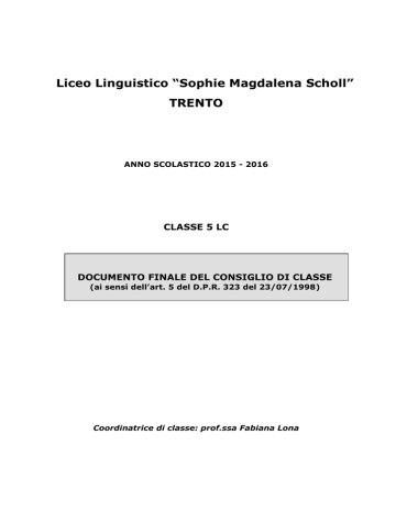 Liceo Linguistico “Sophie Magdalena Scholl” TRENTO ANNO SCOLASTICO 2015 - 2016 CLASSE 5 LC DOCUMENTO FINALE DEL CONSIGLIO DI CLASSE (ai sensi dell’art. 5 del D.P.R. 323 del 23/07/1998) Coordinatrice di classe: prof.ssa Fabiana Lona SOMMARIO 1. PRESENTAZIONE DELL’ISTITUTO 1.1 Breve storia dell’Istituto di origine 1.2 Finalità formative e obiettivi generali 1.3 Materie di studio e orario settimanale di insegnamento 2. STORIA DELLA CLASSE 2.1 Gli studenti 2.2 I docenti 3. ATTIVITÀ DIDATTICA CURRICOLARE 3.1 Obiettivi generali del consiglio di classe 3.2 Metodologie e strategie didattiche 3.3 Sussidi didattici 3.4 Attività di laboratorio 3.5 Strumenti e criteri di valutazione 3.6 Attribuzione del credito scolastico e formativo 3.7 Attività di recupero e di sostegno 3.8 Attività di approfondimento 3.9 Programmazione del consiglio di classe per l’esame di Stato 4. ATTIVITÀ INTEGRATIVE DEL CURRICOLO 5. FISIONOMIA DELLA CLASSE E RISULTATI CONSEGUITI 6. ALLEGATI 6.1 Documentazione relativa alle simulazioni della terza prova scritta d’esame 6.2 Griglie per la correzione delle prove dell’Esame di Stato e per il colloquio orale 6.3 Programmi svolti e relazioni di lavoro dei singoli insegnanti 2 1. PRESENTAZIONE DELL’ISTITUTO Dal 1 settembre 2012, anno di avvio della nuova istituzione, il Liceo linguistico “Sophie Magdalena Scholl” di Trento raccoglie le esperienze dei due ex Licei linguistici della città, “Antonio Rosmini” e “Leonardo Da Vinci”. Le otto classi prime costituitesi nell’anno scolastico 2013/2014 hanno seguito un percorso formativo di nuova definizione, già in vigore nelle attuali classi seconde, terze e quarte. Le classi quinte, invece, mantengono e manterranno fino al termine del proprio percorso liceale il curricolo ereditato dai rispettivi licei d’origine. Nella fattispecie, il corso 5 LC conserva il piano di studi dell’istituto di provenienza, il Liceo “Leonardo da Vinci”. 1.1 BREVE STORIA DELL’ISTITUTO DI ORIGINE Il Liceo Scientifico e Linguistico “Leonardo Da Vinci” nasce con l’anno scolastico 1975-76, quando il forte aumento di iscritti al liceo scientifico in quegli anni spinse la Provincia Autonoma di Trento ad affiancare un nuovo istituto al già esistente Liceo “Galileo Galilei”. La sede rimase quella della sezione staccata del “Galilei” ovvero l’immobile, la cui costruzione iniziò nel 1863, nato inizialmente come Collegio Convitto Vescovile e poi per lungo tempo Seminario Minore della Diocesi di Trento, che attualmente ospita una vasta area fra via Giusti e via Endrici. Nei primi anni di vita, con un numero ancora ridotto di classi, il Liceo “Da Vinci” ha occupato solamente una parte dell’ex-Seminario, presa in affitto dalla Provincia di Trento. Poi, il continuo incremento di popolazione scolastica, il consolidamento del curricolo, l’arricchimento degli indirizzi hanno richiesto sempre più spazi e, nel 2001, la Provincia di Trento ha deciso l’acquisto di gran parte dell’ex-Seminario (rimane tuttora di proprietà della Curia tutta l’ala sud dell’edificio), provvedendo ad una parziale sistemazione. Nel tempo, dopo un avvio sperimentale, il Liceo Scientifico è stato affiancato da un Liceo Linguistico che, dall’anno scolastico 1996-97, è stato articolato secondo il curricolo che si richiama al Progetto Cratilo. L’evoluzione positiva della storia della scuola, unitamente ad una serie di ragioni recenti che hanno creato nuove attenzioni verso un percorso formativo liceale, ha comportato un considerevole aumento di iscrizioni nel corso degli ultimi anni, facendo del Liceo “Da Vinci” uno degli istituti di maggiori dimensioni della città. 1.2 FINALITÀ FORMATIVE E OBIETTIVI GENERALI Lo scopo prioritario dell’indirizzo è quello di assicurare allo/a studente/ssa una formazione liceale e linguistica moderna, sostenuta da una solida formazione umanistico-scientifica, capace di rispondere positivamente alle esigenze di una società complessa. In particolare, l’indirizzo del Liceo Linguistico vuole sviluppare nello/a studente/ssa le capacità di: comunicare in più lingue e interagire efficacemente e con consapevolezza con la diversità linguistica e culturale; padroneggiare linguaggi, concetti e tematiche che permettono di costruire una mappa significativa dei saperi del mondo contemporaneo; gestire il proprio sapere in modo consapevole, con strategie adeguate allo sviluppo della professionalità e funzionali al proseguimento degli studi o all’inserimento nel mondo del lavoro. L’istituto promuove l’attuazione e la realizzazione di questi obiettivi attraverso un piano di studi della durata di cinque anni, costruito e articolato all’interno dei saperi essenziali di tre aree fondamentali: a) area linguistica, centrata sulla comprensione e sull’uso consapevole di quattro sistemi linguistici moderni posti in rapporto tra di loro (tre lingue straniere e lingua italiana); b) area filosofico-storico-artistica, rivolta alla contestualizzazione e alla comprensione critica delle 3 diverse interpretazioni della realtà e all’analisi comparativa dei linguaggi espressivi; c) area scientifico-matematico-sperimentale, attenta a fornire modelli e strumenti logico-interpretativi della realtà e della scienza moderna. Le precedenti osservazioni ci permettono di tracciare il seguente quadro sintetico delle conoscenze e delle competenze che lo/la studente/ssa dovrà possedere al termine del corso di studi: i saperi essenziali delle singole discipline, mostrando consapevolezza di concetti, terminologie specifiche, regole, tecniche, procedure e metodi; Lo/a studente/ssa conosce: tre lingue straniere, di cui due a livello avanzato e una a livello intermedio;il linguaggio multimediale, iconico e scientifico; una molteplicità di aspetti della cultura afferente alla lingua italiana e alle lingue straniere nella dimensione istituzionale, sociale e artistico-storicoletteraria. dimostra sicurezza nell’uso