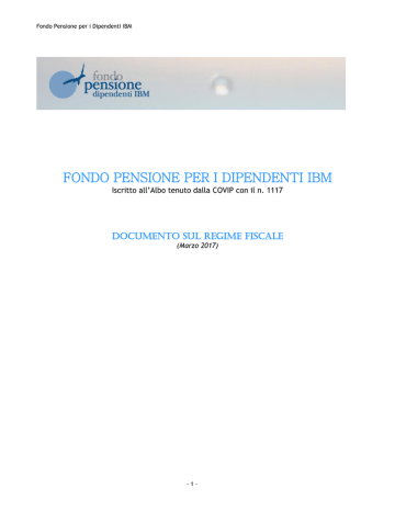 Fondo Pensione per i Dipendenti IBM FONDO PENSIONE PER I DIPENDENTI IBM Iscritto all’Albo tenuto dalla COVIP con il n. 1117 DOCUMENTO SUL REGIME FISCALE (Marzo 2017) -1- Fondo Pensione per i Dipendenti IBM PREMESSA Le note che seguono sono una libera e parziale sintesi NON SOSTITUTIVA DELLA NORMATIVA DI LEGGE e vengono presentate per fornire all’aderente un primo orientamento in materia. I principali testi a cui è necessario far riferimento sono il Testo Unico delle Imposte sui Redditi (D.P.R. N. 917/1986) e successive modifiche e integrazioni, la Circolare 235/98 del Ministero delle Finanze, il Decreto Legislativo 124/1993, sue modificazioni e integrazioni, il Decreto Legislativo 47/2000, sue modificazioni e integrazioni, la Circolare 29/E e 78/E del 2001 dell’Agenzia delle Entrate, il Decreto Legislativo 252/2005 in vigore dal 1 gennaio 2007 e la Circolare 70 del 2007 dell’Agenzia delle Entrate. Il presente documento è redatto con l’obiettivo di fornire a tutti gli aderenti una definizione di dettaglio del regime fiscale in essere e una evidenza di quelli previgenti e degli effetti della loro applicazione sulle prestazioni che vengono erogate. Il regime fiscale, che verrà applicato a seconda del periodo di accumulo degli importi versati, è differenziato su tre distinti periodi: Fino al 31.12.2000; Dal 1.1.2001 al 31.12.2006; Dal 1.1.2007 e per due tipologie di iscritti: ANTE 29/04/1993 definiti VECCHI e POST 28/04/1993 definiti NUOVI. Il regime di tassazione si divide, in aggiunta, in tre fasi: - Contribuzione - Accumulo - Erogazione Fiscalmente la metodologia di tassazione viene definita “ETT” cioè: Esenzione in fase di versamento dei contributi; Tassazione nella fase di accumulo dei rendimenti; Tassazione nella fase di erogazione. -2- Fondo Pensione per i Dipendenti IBM FASE CONTRIBUZIONE REGIME FISCALE DEI CONTRIBUTI - DAL 1.1.2007 Il totale dei contributi versati al Fondo (aderente + datore di Lavoro) sono deducibili dal reddito complessivo dell’aderente per un importo annuo non superiore a € 5.164,57. Nel calcolo del limite non si devono considerare le quote di TFR conferite al Fondo. CONTRIBUTI VERSATI PER FAMILIARI FISCALMENTE A CARICO I contributi versati in favore di familiari fiscalmente a carico possono essere dedotti, in primo luogo, dall’eventuale reddito di detti familiari, fino ad azzerarli; per l’ammontare non dedotto, l’aderente di riferimento potrà dedurli unitamente a quelli relativi alla propria posizione, datoriali e individuali, nel limite complessivo di 5.164,57€ annui. Se i versamenti per il familiare a carico superano, sommati ai contributi dell’aderente principale, il limite di deducibilità, tale supero potrà essere portato in deduzione dall’eventuale altro familiare, se esistente, dell’aderente a carico. Si tenga comunque presente che è anche possibile non dedurre i contributi versati per il familiare a carico optando per dichiararli integralmente non dedotti. CONTRIBUTI NON DEDOTTI Entro il 31 dicembre dell’anno successivo a quello in cui è stato effettuato il versamento al Fondo ovvero, se antecedente, alla data in cui sorge il diritto alla prestazione, l’aderente comunica al Fondo l’importo dei contributi versati che non sono stati dedotti e che non saranno dedotti nella dichiarazione dei redditi. Tali importi saranno esclusi dalla base imponibile all’atto dell’erogazione della prestazione finale. CONTRIBUTI NON DEDOTTI LAVORATORI DI PRIMA OCCUPAZIONE SUCCESSIVA AL 1/1/2007 Ai lavoratori di prima occupazione successiva al 1° gennaio 2007 è consentito, nei venti anni successivi ai primi cinque di partecipazione alle forme pensionistiche complementari, dedurre annualmente dal reddito complessivo contributi eccedenti l'importo di € 5.164,57 pari alla differenza positiva tra l'importo di € 25.822,85 e i contributi effettivamente versati in tali cinque anni di partecipazione, comunque per un importo non superiore a € 2.582,29. CONTRIBUTI PER REINTEGRO ANTICIPAZIONI Per i contributi versati quali reintegro di anticipazioni erogate, a scelta dell'aderente eccedenti il limite di 5.164,57 euro annui viene riconosciuto al contribuente un credito d'imposta pari all'imposta pagata al momento della fruizione dell'anticipazione, proporzionalmente riferibile all'importo reintegrato. - DAL 1.1.2001 AL 31.12.2006 VECCHI ISCRITTI NUOVI ISCRITTI Il totale dei contributi versati al Fondo (aderente + datore di Lavoro) sono deducibili dal reddito complessivo dell’aderente per un importo complessivamente non superiore al 12 per cento del reddito complessivo e, comunque, non superiore a € 5.164,57. Fino al 31.12.2005, il limite complessivo di deducibilità fiscale è elevato, se superiore, al totale dei contributi effettivamente versati nel 1999. Nel calcolo del limite non si devono considerare le quote di TFR conferite al Fondo. Il totale dei contributi versati al Fondo (aderente + datore di Lavoro) sono deducibili dal reddito complessivo dell’aderente per un importo non superiore al doppio della quota di TFR destinata al Fondo e, comunque, entro i limiti del 12 per cento del reddito complessivo e di Euro 5.164,57. Nel calcolo del limite non si devono considerare le quote di TFR conferite al Fondo. - FINO AL 31.12.2000 Non concorrono a formare reddito Non concorrono a formare reddito entro il limite di € 1.291,14 -3- Fondo Pensione per i Dipendenti IBM FASE DI ACCUMULO REGIME FISCALE DEI RENDIMENTI - DAL 1.1.2014 – VECCHI E NUOVI ISCRITTI Sul rendimento maturato in ciascun periodo d'imposta, viene applicata un'imposta sostitutiva delle imposte sui redditi nella misura del 20%. Onde evitare una penalizzazione per l’investimento da parte dei Fondi in titoli del debito pubblico e in altri titoli ad essi equiparati i cui rendimenti scontano l’aliquota agevolata nella misura del 12,50%, il comma 622 dell’articolo 1 della legge 23 dicembre 2014, n. 190 ha previsto che la base imponibile dell’imposta sostitut