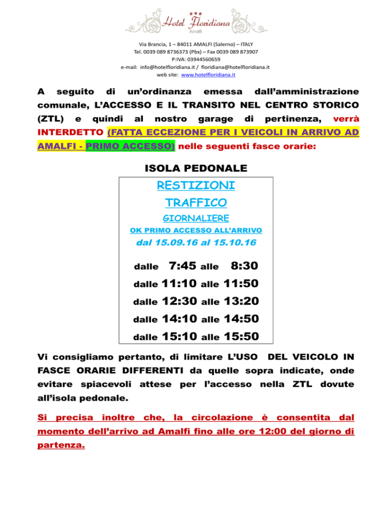 Via Brancia, 1 – 84011 AMALFI (Salerno) – ITALY Tel. 0039 089 8736373 (Pbx) – Fax 0039 089 873907 P:IVA: 03944560659 e-mail: [email protected] / [email protected] web site: www.hotelfloridiana.it A seguito di un’ordinanza emessa dall’amministrazione comunale, L’ACCESSO E IL TRANSITO NEL CENTRO STORICO (ZTL) e quindi al nostro garage di pertinenza, verrà INTERDETTO (FATTA ECCEZIONE PER I VEICOLI IN ARRIVO AD AMALFI - PRIMO ACCESSO) nelle seguenti fasce orarie: ISOLA PEDONALE RESTIZIONI TRAFFICO GIORNALIERE OK PRIMO ACCESSO ALL’ARRIVO dal 15.09.16 al 15.10.16 dalle 7:45 alle 8:30 dalle 11:10 alle 11:50 dalle 12:30 alle 13:20 dalle 14:10 alle 14:50 dalle 15:10 alle 15:50 Vi consigliamo pertanto, di limitare L’USO DEL VEICOLO IN FASCE ORARIE DIFFERENTI da quelle sopra indicate, onde evitare spiacevoli attese per l’accesso nella ZTL dovute all’isola pedonale. Si precisa inoltre che, la circolazione è consentita dal momento dell’arrivo ad Amalfi fino alle ore 12:00 del giorno di partenza.