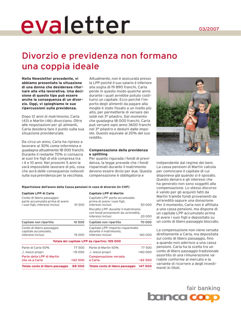 evaletter 03/2007 Divorzio e previdenza non formano una coppia ideale Nella Newsletter precedente, vi abbiamo presentato la situazione di una donna che desiderava ritornare alla vita lavorativa. Una decisione di questo tipo può essere anche la conseguenza di un divorzio. Oggi, vi spieghiamo le sue ripercussioni sulla previdenza. Dopo 12 anni di matrimonio, Carla (43) e Martin (46) divorziano. Oltre alle negoziazioni per gli alimenti, Carla desidera fare il punto sulla sua situazione previdenziale. Da circa un anno, Carla ha ripreso a lavorare al 30% come infermiera e guadagna attualmente 18 000 franchi. Durante il restante 70% si consacra ai suoi tre figli di età compresa tra i 4 e 10 anni. Nei prossimi 5 anni le sarà impossibile lavorare di più, cosa che avrà delle conseguenze notevoli sulla sua previdenza per la vecchiaia. Attualmente, non è assicurata presso la LPP poiché il suo salario è inferiore alla soglia di 19 890 franchi. Carla perde in questo modo qualche anno durante i quali avrebbe potuto costituirsi un capitale. Ecco perché l’importo degli alimenti da pagare alla moglie è stato fissato a un livello più alto, per permetterle di versare dei soldi nel 3° pilastro. Dal momento che guadagna 18 000 franchi, Carla può versare ogni anno 3600 franchi nel 3° pilastro e dedurli dalle imposte. Questo equivale al 20% del suo reddito. Compensazione della previdenza e splitting Per quanto rigurada i fondi di previdenza, la legge prevede che i fondi risparmiati durante il matrimonio devono essere divisi per due. Questa compensazione è obbligatoria e Ripartizione dell’avere della Cassa pensioni in caso di divorzio (in CHF) Capitale LPP di Carla Conto di libero passaggio: parte accumulata prima di avere i suoi figli, interessi inclusi 10 500 Capitale LPP di Martin Capitale LPP: parte accumulata prima di avere i suoi figli, interessi inclusi 50 000 Riscatto LPP: durante il matrimonio con fondi provenienti da un’eredità, interessi inclusi 20 000 Capitale non ripartito 10 500 Capitale non ripartito 15 000 Capitale LPP: importo risparmiato durante il matrimonio, interessi inclusi 140 000 Conto di libero passaggio: capitale accumulato, interessi inclusi 70 000 Totale del capitale LPP da ripartire: 155 000 Parte di Carla 50% ./. mezzi propri Parte della LPP di Martin che va a Carla Totale conto di libero passaggio 77 500 —15 000 +62 500 88 000 Parte di Martin 50% ./. mezzi propri Compensazione versata a Carla 77 500 —140 000 —62 500 Totale conto di libero passaggio 147 500 indipendente dal regime dei beni. La cassa pensioni di Martin calcola per cominciare il capitale di cui disponeva già quando si è sposato. Questo denaro e gli interessi che ha generato non sono soggetti alla compensazione. Lo stesso discorso è valido per gli acquisti fatti da Martin tramite fondi provenienti da un’eredità oppure una donazione. Per il momento, Carla non è affiliata a una cassa pensioni, ma dispone di un capitale LPP accumulato prima di avere i suoi figli e depositato su un conto di libero passaggio bloccato. La compensazione non viene versata direttamente a Carla, ma depositata sul conto di libero passaggio, fino a quando non aderisce a una cassa pensioni. Carla ha la scelta tra un conto di libero passaggio tradizionale assortito di una rimunerazione variabile conforme al mercato e la variante di ricorrere a degli investimenti in titoli. Una ripartizione simile avviene anche a livello dell’AVS. Dopo il divorzio, Carla e Martin inoltreranno insieme una domanda di ripartizione dei redditi in caso di divorzio (domanda di splitting) presso la loro cassa di compensazione. La totalità dei redditi realizzati durante il loro matrimonio, si parla qui dei salari e non di contributi, verranno accreditati per metà al rispettivo partner. Il salario guadagnato da entrambi prima e dopo il matrimonio, verrà calcolato separatamente. Ma non è tutto: dal momento che hanno dei bambini, verrà versato loro un accredito di 39 780 franchi per anno. I beni accumulati durante il matrimonio devono essere divisi per due. Dopo il divorzio, Carla ottiene la potestà dei genitori e può rivendicare integralmente gli accrediti fino a quando il suo figlio più giovane raggiunge i 16 anni. Se viene deciso l’affido congiunto, gli accrediti verranno divisi per due. È possibile richiedere alla cassa di compensazione corrispondente se è possibile cambiare questa regolamentazione e il genitore che si occupa di più dei bambini beneficerà di un trattamento preferenziale. Un’analisi di previdenza può fare il punto sulla situazione È importante che Carla prenda anche in considerazione il rischio di invalidità. Per quanto riguarda il rischio di decesso, Carla può escluderlo, poiché se dovesse morire, i figli andrebbero a vivere con il padre che dispone di un avere sufficiente. Una volta pensionata, la situazione finanziaria di Carla non sarà rosea, poiché a 43 anni il suo capitale LPP ammonta a 88 000 che aumenta unicamente grazie agli interessi. Malgrado il risparmio del 3° pilastro, 967 729.03/07.07 fra 5 anni Carla avrà guadagnato unicamente 115 000 franchi, 2° pilastro incluso. A dipendenza della percentuale del suo lavoro e di quanto è riuscita a mettere da parte per la sua cassa pensioni, quando Carla andrà in pensione (a 64 anni) potrà aver accumulato un importo pari a 300 000 franchi. Con il tasso attuale di rendita di 6,8%, si ottiene una rendita di vecchiaia pari a 20 400 franchi. A questo si aggiunge la rendita di vecchiaia dell’AVS che dovrebbe corrispondere ad almeno 26 520 franchi, mentre raggiunge unicamente 20 000 franchi visto il salario modesto di Carla. Una cifra al quanto esigua se si pensa che nei prossimi 20 anni è previsto un rincaro e che, inoltre, bisogna fare i conti con una diminuzione del tasso di rendita della LPP. Pertanto, Carla deve assolutamente versare il massimo di 6365 franchi del 3° pilastro non appena sarà affiliata a una cassa pensioni. Inoltre, deve 