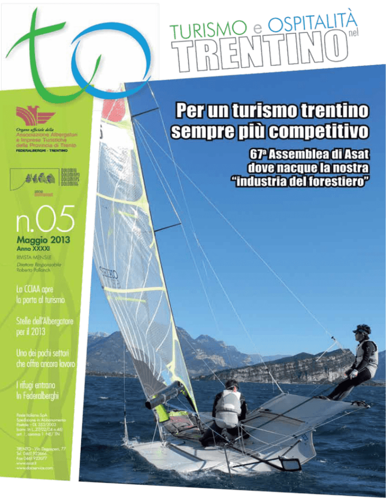 Sommar io Tema del Mese Il futuro del Turismo in Trentino pag. 2 Turismo leva efficace per il necessario cambiamento Vita Associativa Alle radici del turismo trentino Franco Mizzaro - Romolo Franco Gabrieli Sergio Chiesa - Sergio Arnoldo Stagione turistica chiaroscuro In calo la vacanza bianca Occupazione? Nel turismo Prodotti agricoli in albergo Internet nelle piazze trentine Mi rifugio in Trentino Federalberghi apre a 400 rifugi pag. 6 pag. 10 pag. 11 pag. 12 pag. 16 pag. 18 pag. 20 pag. 21 pag. 22 pag. 23 Intanto un saluto a Riva del Garda che ospita l’Assemblea annuale della nostra Associazione, quindi al lago di Garda che assieme alle Dolomiti costituiscono i due più rilevanti marchi che danno notorietà e forza al Trentino turistico sul mercato internazionale ed interno. Due realtà consolidate e nello stesso tempo due punti di forza per pensare e progettare il futuro nel solco di una tradizione vincente e insieme opportunità di crescita. Giovani Giovani Gat protagonisti a Sorrento pag. 24 Speciale Laghi Valsugana elettrica pag. 25 Appunti sulle Dolomiti Sagron Mis dal buio alla ribalta Fondazione Dolomiti Unesco Corsi Aggiornamento Formativo pag. 26 pag. 28 Formazione pag. 30 Trentino Marketing In vacanza con Deutsche Bahn pag.34 Marketing Sciatori internazionali pag. 36 Normative Dubbi pag. 38 Cercasi, Affittasi, Vendesi Le proposte del mese pag. 39 Chiusura Editoriale 4/05/2013 n.05 Anno XXXXI Maggio 2013 In Copertina: Barca a vela sul Garda f. Fototeca Ingarda trentino - Ph Ornella Marconi Registrazione Tribunale di Trento n° 163 R.S. del 17/11/1971 Direzione, Redazione, Amministrazione: Via Degasperi, 38123 TRENTO - Tel. 0461.923666 - [email protected] Direttore Responsabile: Roberto Pallanch Comitato di Redazione: Coordinatore Alberto Frioli Collaborano: Christian Armani, Monica Basile, Donatella Bommassar, Claudia Bottamedi, Davide Cardella, Pierantonio Cordella, Franco Delli Guanti, Carlo Giovanazzi, Laura Licati, Mariarosa Lucchi, Clara Pedrelli, Elisa Ressegotti, Michele Viola Foto: Le immagini dell’Assemblea di Vezzano sono state scattate da Roberta Pisoni; le foto della sezione Giovani sono di Nonsoloweb.info; altre foto da Archivio Trentino Spa, Apt Pinzolo Madonna di Campiglio, Apt Valle di Fassa, Apt Valle di Fiemme, Apt Valsugana, Ingarda Abbonamento annuo: € 40,00 Editore: Associazione Albergatori ed Imprese Turistiche della Provincia di Trento Realizzazione: OGP srl - Agenzia di Pubblicità - TRENTO Stampa: Tipografia Esperia - LAVIS Pubblicità: OGP Media - Via Caneppele 34/1 Tel. 0461 1823300 - Fax 0461 1823301 Info: [email protected] - www.ogp.it Roberto Pallanch L’Assemblea cade in un momento particolare, dove a livello nazionale ci si pone l’obiettivo di rilanciare l’economia del Paese, e a livello locale certamente in un contesto diverso, c’è comunque il problema di reagire ai forti segni di crisi. Una crisi che si combina con una restrizione di risorse tradizionalmente a disposizione del bilancio provinciale e largamente usate a sostegno dell’economia e del sistema sociale e di welfare e la necessità di individuare percorsi nuovi. Percorsi che chiamano in causa la responsabilità delle parti sociali ed economiche di arrivare ad una comune visione della necessità di un cambiamento, ma soprattutto alle responsabilità della politica a fare una sintesi che vada oltre la tentazione di gestire la crisi tamponandola, salvaguardando semplicemente i crediti di relazione con alcune parti della Comunità Trentina e una ritualità diffusa nei rapporti sociali, scambiata per coesione. Già in occasione delle recenti elezioni politiche Federalberghi a livello nazionale e Asat a livello locale hanno evidenziato alcune priorità progettuali e programmatiche, presentandole alle forze politiche e ai candidati. Questa Assemblea annuale arriva anche in prossimità delle prossime elezioni provinciali, che non possono essere ignorate, e in questo contesto e su quanto abbiamo detto sopra, va ribadita con forza la nostra convinzione che il settore del turismo è un settore su cui puntare, avendo la certezza di risultati in termini di sviluppo del reddito e dell’occupazione. Condividono questa strada molti interlocutori autorevoli, da Confindustria al World Economic Forum, dall’Unione Europea, a molti centri di ricerca economica e sociale. I report sul settore mostrano per il turismo trend positivi, dove sia il nostro Paese che il Trentino si possono inserire vantaggiosamente. In Trentino a volte si assiste invece ad una dissociazione tra dichiarazioni che fanno del turismo un settore strategico per l’economia provinciale e comportamenti non coerenti con tali dichiarazioni. Ai partiti e agli amministratori chiediamo dunque di acquisire la consapevolezza dell’opportunità che il turismo offre e quindi di porre in essere azioni legislative e politiche di bilancio utili al raggiungimento di questo obiettivo, se condiviso. Da parte nostra abbiamo le idee chiare, e l’Assemblea costituisce il palcoscenico adatto per parlarne. Il direttore Roberto Pallanch Anno XXXXI - n.5 Maggio 2013 Paganella un simbolo del turismo trentino TEMA DEL MESE IL FUTURO DEL TURISMO IN TRENTINO Indagine CCIAA sulle prospettive con linea di orizzonte 2020 La ricerca “Il futuro del turismo in Trentino” commissionata dall’Accademia d’impresa della Camera di Commercio di Trento al Centro di ricerca S3.Studium di Roma diretto dal prof. Domenico De Masi, ha incontrato interesse misto a qualche delusione tra gli operatori del settore. Positivo è che la Camera di Commercio, voglia comprendere il turismo nel proprio campo di osservazione, dopo averlo finora relegato nelle sue analisi economiche a subcategoria del commercio al minuto. Il turismo, e da queste colonne lo ripetiamo da tempo, lo merita quantomeno alla pari dei classici Domenico De Masi 2 comparti camerali (agricoltura, industria, artigianato e commercio). Concorre alla formazione del Pil provinciale per il 22%, pari