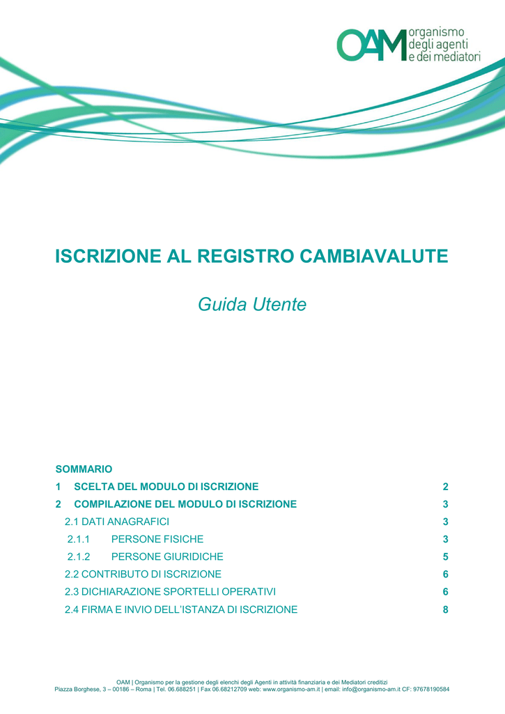 ISCRIZIONE AL REGISTRO CAMBIAVALUTE Guida Utente SOMMARIO 1 SCELTA DEL MODULO DI ISCRIZIONE 2 2 COMPILAZIONE DEL MODULO DI ISCRIZIONE 3 2.1 DATI ANAGRAFICI 3 2.1.1 PERSONE FISICHE 3 2.1.2 PERSONE GIURIDICHE 5 2.2 CONTRIBUTO DI ISCRIZIONE 6 2.3 DICHIARAZIONE SPORTELLI OPERATIVI 6 2.4 FIRMA E INVIO DELL’ISTANZA DI ISCRIZIONE 8 OAM | Organismo per la gestione degli elenchi degli Agenti in attività finanziaria e dei Mediatori creditizi Piazza Borghese, 3 – 00186 – Roma | Tel. 06.688251 | Fax 06.68212709 web: www.organismo-am.it | email: [email protected] CF: 97678190584 1 SCELTA DEL MODULO DI ISCRIZIONE Per poter accedere ai servizi di iscrizione nel Registro dei Cambiavalute dell’OAM, è necessario effettuare preventivamente la Registrazione al Portale dell’Organismo attraverso l’apposita funzione (fare riferimento alla guida alla Registrazione dei Cambiavalute), ottenendo così le credenziali per accedere alla propria Area privata e utilizzare i servizi in essa disponibili. All’interno dell’Area privata cliccare su “ISCRIZIONE” nella sezione “Servizi”; il sistema presenterà una serie di domande guidate (wizard), che permetterà di accedere al Modulo di iscrizione e alla sua compilazione (Figura 1e 2). Figura 1 Figura 2 Iscrizione Registro dei Cambiavalute | Guida Utente 2 2 COMPILAZIONE DEL MODULO DI ISCRIZIONE 2.1 DATI ANAGRAFICI Nel Modulo di iscrizione la parte anagrafica risulterà precompilata con i dati forniti dall’Utente stesso in fase di Registrazione al Portale, i quali non sono modificabili in questa sede. Per procedere eventualmente con la loro modifica, è necessario utilizzare la funzione “Modifica dati registrazione”, presente nella sezione “Servizi” all’interno dell’Area Privata. 2.1.1 PERSONE FISICHE Completare le altre informazioni inserendo i dati anagrafici mancanti: “Eventuale denominazione ditta individuale”; altro recapito telefonico (Cellulare); la propria “Cittadinanza”. Figura 3 Iscrizione Registro dei Cambiavalute | Guida Utente 3 In caso di cittadinanza “Extra-comunitaria” indicare i dati del “Permesso di soggiorno” (Figura 4) ed allegarne copia nella sezione “Allegati” (Figura 12). Figura 4 Procedere poi all’inserimento dei dati relativi al “DOMICILIO” (intendendosi il luogo in cui viene svolta l’attività o dove è comunque possibile indirizzare eventuali comunicazioni da parte dell’OAM). Qualora i dati relativi alla “RESIDENZA” coincidessero con quelli del “DOMICILIO” è sufficiente selezionare la casella “L’indirizzo di residenza coincide con l’indirizzo di domicilio”, altrimenti procedere con la compilazione dei relativi campi (Figura 5). Figura 5 Iscrizione Registro dei Cambiavalute | Guida Utente 4 2.1.2 PERSONE GIURIDICHE Completare le altre informazioni inserendo i dati relativi a: Numero REA; dati della SEDE LEGALE IN ITALIA (Figura 6). Nel caso di sede legale nel territorio Comunitario, è necessario selezionare la voce “Con sede Legale nel territorio Comunitario” e procedere alla compilazione dei relativi campi. Figura 6 Procedere infine alla dichiarazione dei dati relativi a SEDE DIREZIONE GENERALE (se diversa dalla sede legale in Italia); LEGALE RAPPRESENTANTE (Figura 7). Figura 7 Iscrizione Registro dei Cambiavalute | Guida Utente 5 2.2 CONTRIBUTO DI ISCRIZIONE Comunicare i dati relativi al pagamento del contributo richiesto per l’iscrizione nel Registro compilando i campi relativi all’importo pagato (cfr. Circolare OAM n.24/15): T.R.N. (Transaction Reference Number) del bonifico effettuato; codice IBAN del conto corrente bancario dal quale è stato effettuato il pagamento. (Figura 8). Figura 8 2.3 DICHIARAZIONE SPORTELLI OPERATIVI Comunicare in questa sezione gli sportelli operativi operanti sul territorio nazionale. Procedere cliccando su “Aggiungi Sportello Operativo”. (Figura 9). Compilare quindi i campi relativi all’indirizzo, recapito telefonico, carattere di svolgimento dell’attività - stagionale o continuativa – (obbligatorio), data di inizio operatività dello sportello. Circa i dati richiesti per la comunicazione ai sensi degli artt. 11 e 115 del R.D. 18 giugno 1931, indicarne la data, l’Autorità presso la quale è stata presentata e il relativo Comune (Figura 10). Infine cliccare su OK. Figura 9 Iscrizione Registro dei Cambiavalute | Guida Utente 6 Figura 10 Nella schermata successiva verificare la correttezza dei dati inseriti, prendere visione e accettare le Condizioni Generali e l’Informativa sulla Privacy e cliccare su Continua (Figura 11). Figura 11 Iscrizione Registro dei Cambiavalute | Guida Utente 7 2.4 FIRMA E INVIO DELL’ISTANZA DI ISCRIZIONE Per apporre la firma digitale e procedere con l’invio formale dell’istanza di iscrizione, consultare la Guida “Firma digitale e invio dell’istanza”, disponibile sul Portale dell’Organismo. Una volta firmato digitalmente il Modulo di iscrizione (e salvato sul proprio computer), allegare il Modulo nella sezione “ALLEGATI” tramite la funzione “Cerca File” corrispondente alla voce “Modulo di iscrizione firmato digitalmente”. Per il corretto invio dell’istanza, è necessario allegare anche la copia del bonifico bancario relativo al contributo di iscrizione di cui ha fornito gli estremi nell’apposita sezione del Modulo (Figura 12). Figura 12 Si fa presente che ai fini dell'operatività dell'iscrizione è richiesto il pagamento una tantum della tassa di concessione governativa da effettuare sul conto corrente postale n. 8003, intestato a "Agenzia delle Entrate – Centro Operativo di Pescara – Tasse Concessioni Governative" con causale "Tassa iscrizione nel Registro dei Cambiavalute". Iscrizione Registro dei Cambiavalute | Guida Utente 8